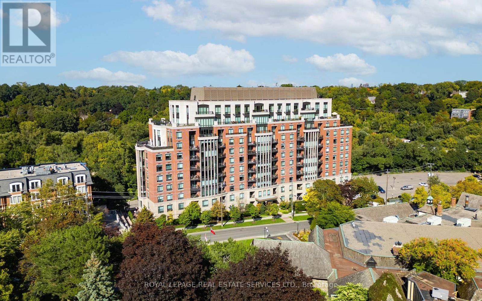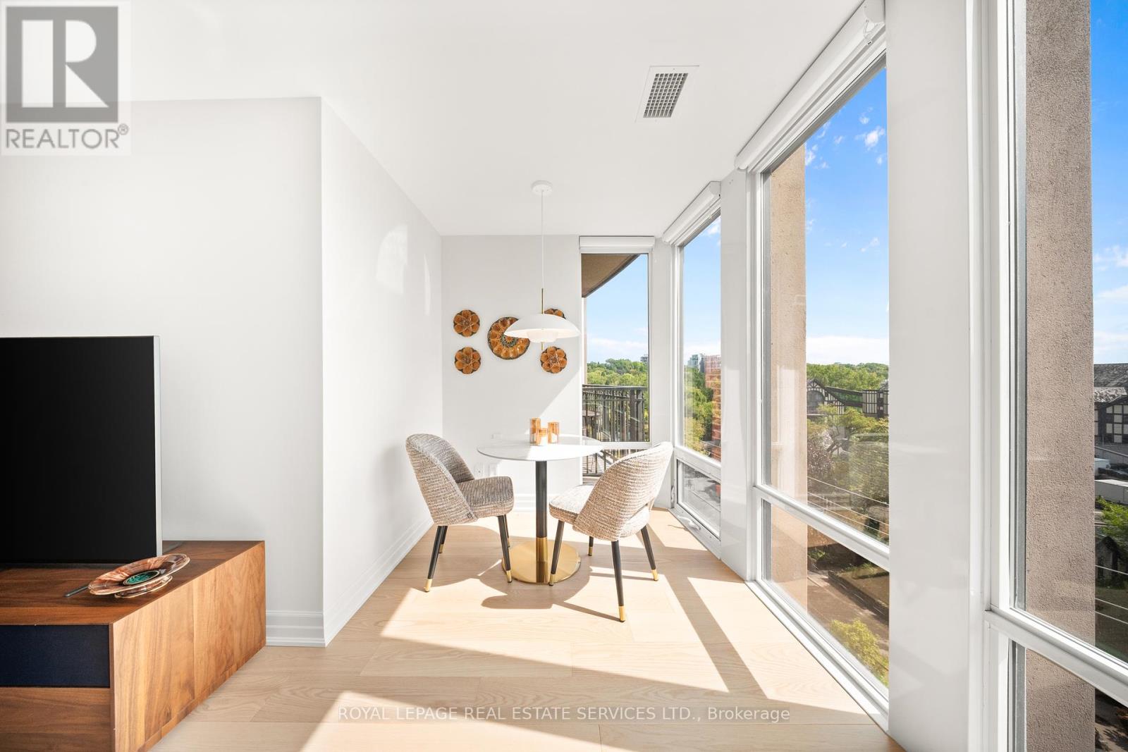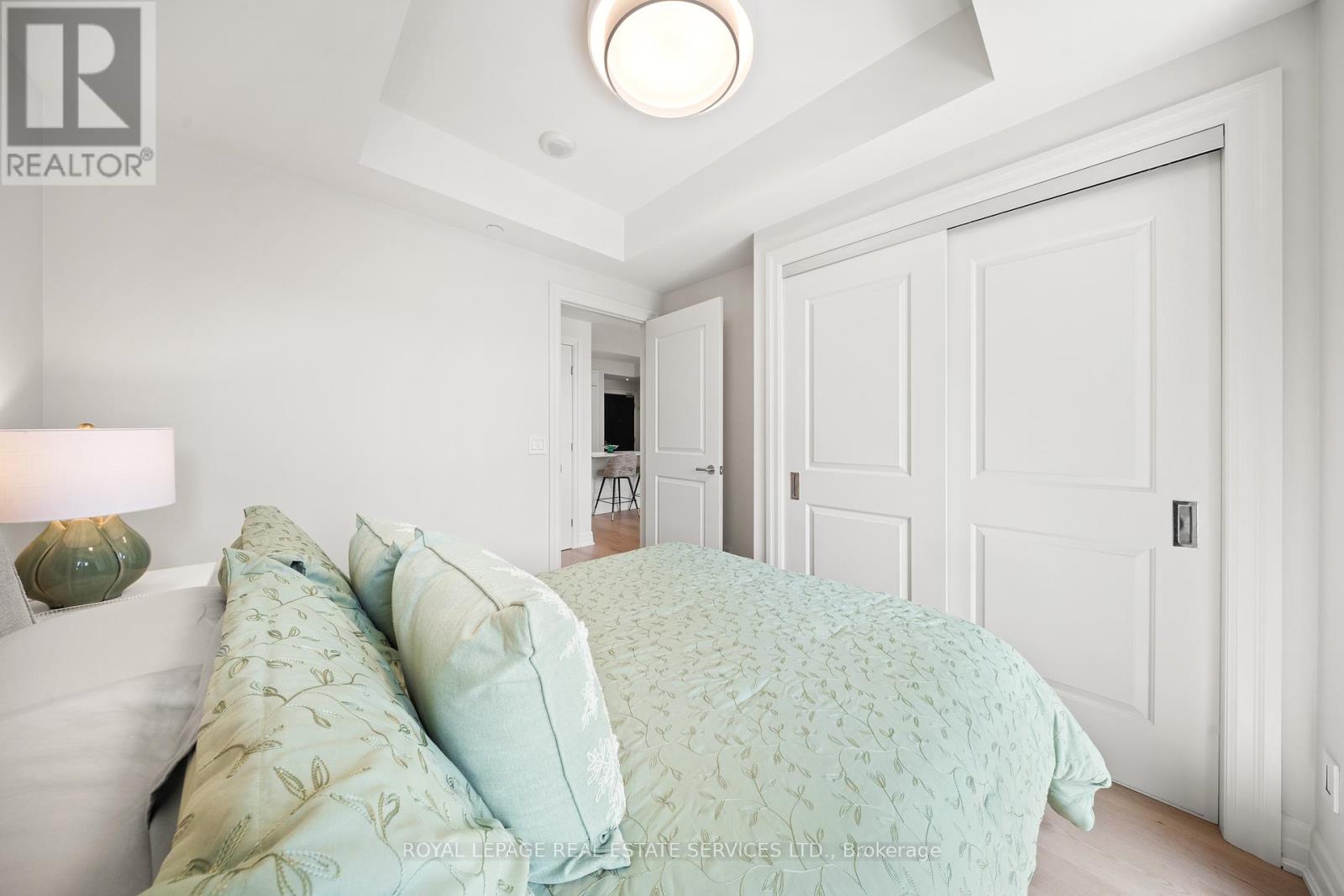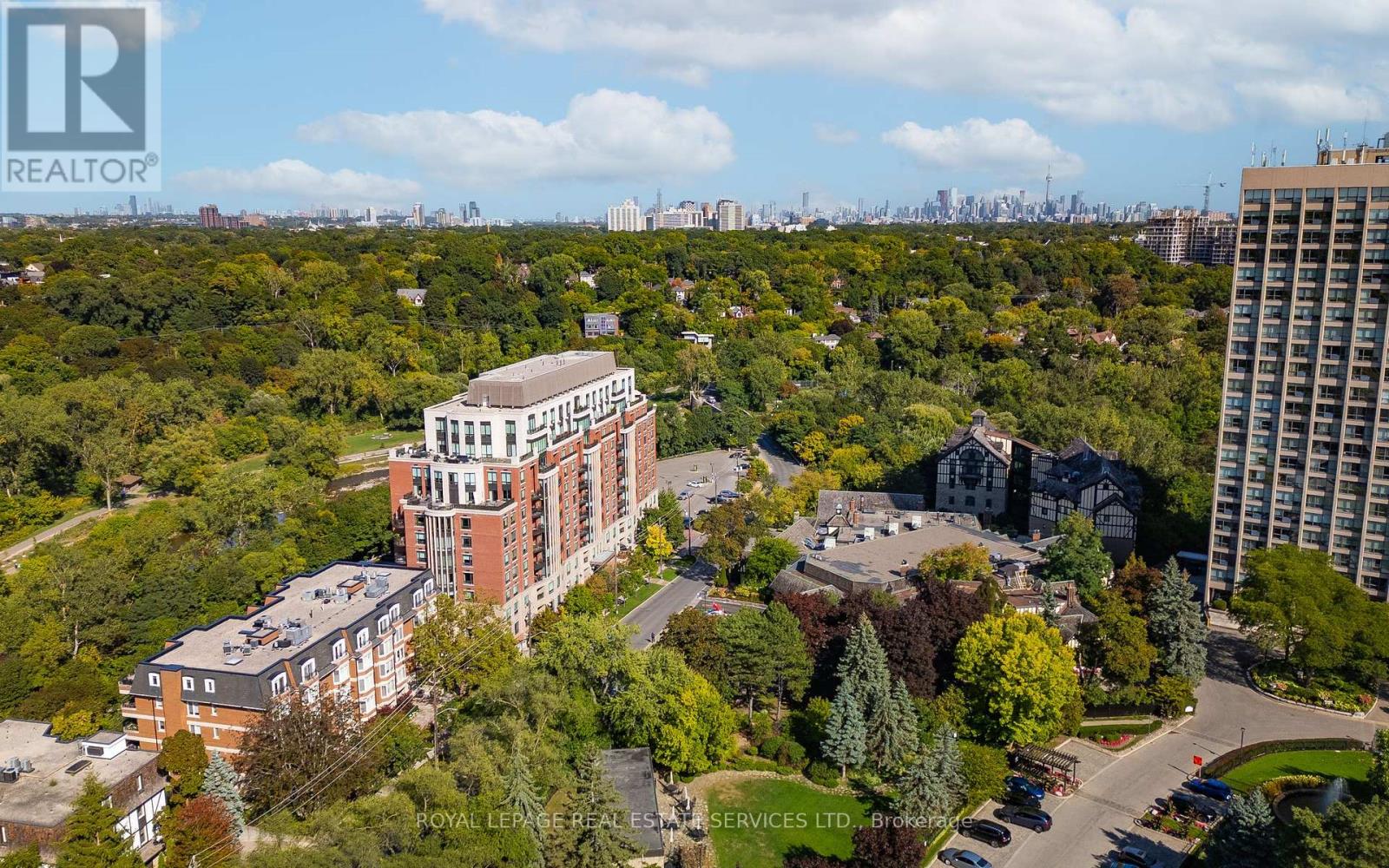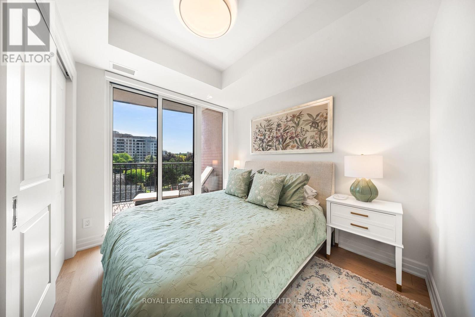 Elegant 1 bedroom, 1 bathroom suite at the prestigious Riverhouse Condominium at the Old Mill, featuring floor to ceiling windows that invite an abundance of natural light. The interior showcases wide plank engineered white oak flooring, a gorgeous kitchen with quartz countertops and island, herringbone tile backsplash, and contemporary track lighting. The bathroom is finished with a sleek new vanity, glass-enclosed shower, tile flooring, and upgraded lighting. Additional enhancements include thoughtfully selected new lighting fixtures throughout and parquet style wooden floor on private balcony. Located just steps from the Old Mill Subway Station and Humber River, this building offers 24-hour concierge service, an indoor pool, hot tub, and party room. Enjoy a tranquil setting within walking distance to parks, the TTC, and the shops and restaurants of Bloor Street West. extras all installed in last year *** Proverco engineered hardwood wide plank floor, parquet flooring on patio. Vanity in bathroom and glass for shower, bathroom floor, recessed medicine cabinet in bathroom, lighting and faucet in bathroom. herringbone tile backsplash in kitchen and quartz counter / island, sink and faucet in kitchen, rrack lighting in kitchen. All lighting recently replaced. Brushed nickel door handles. Custom built in closet (id:4555)
