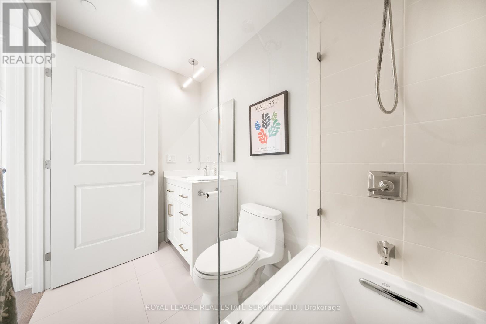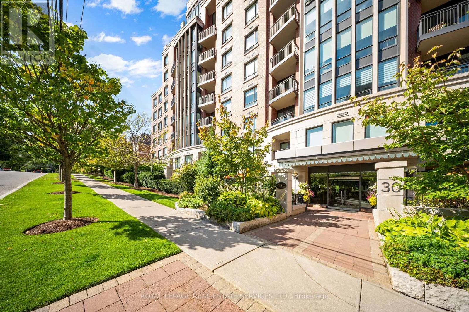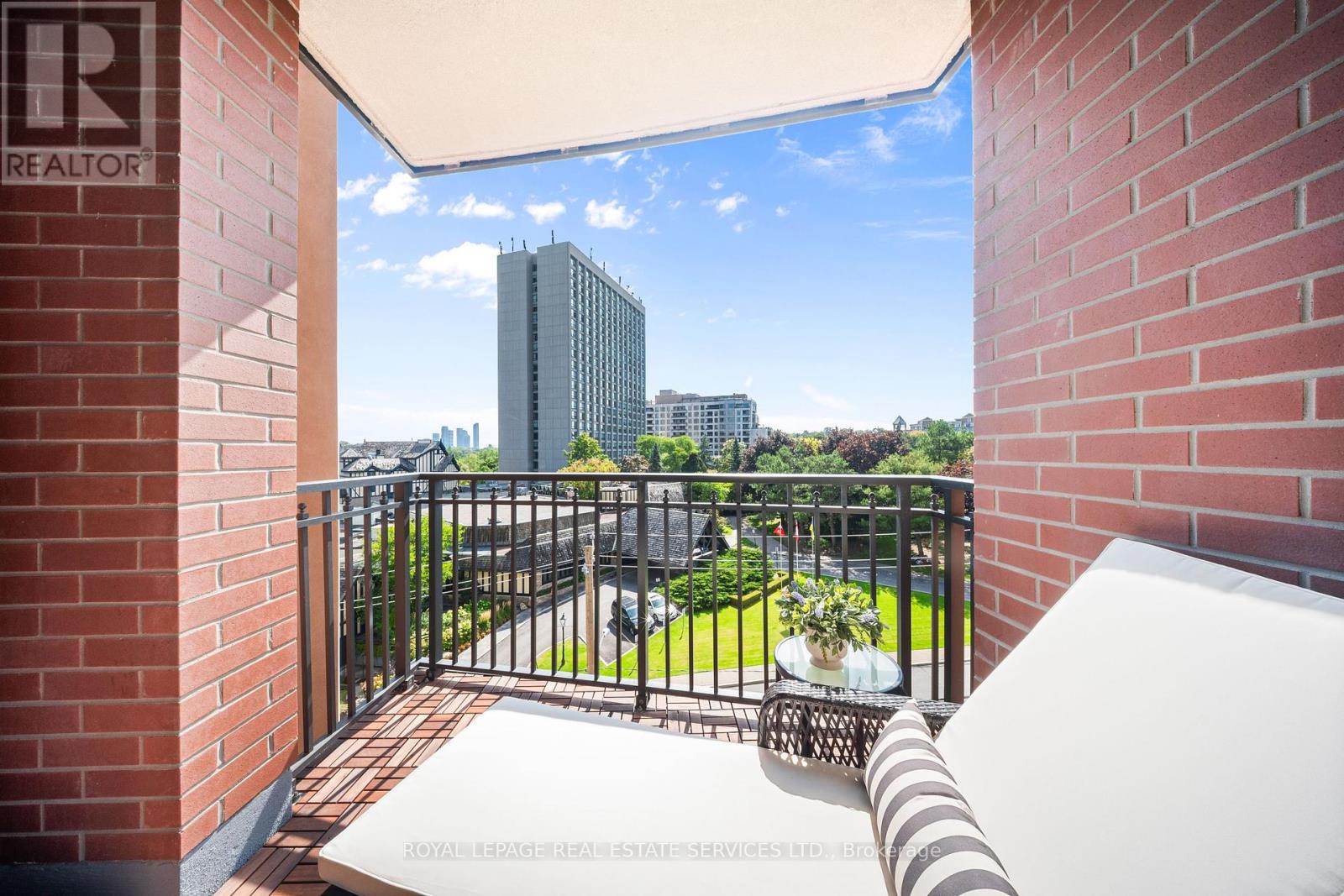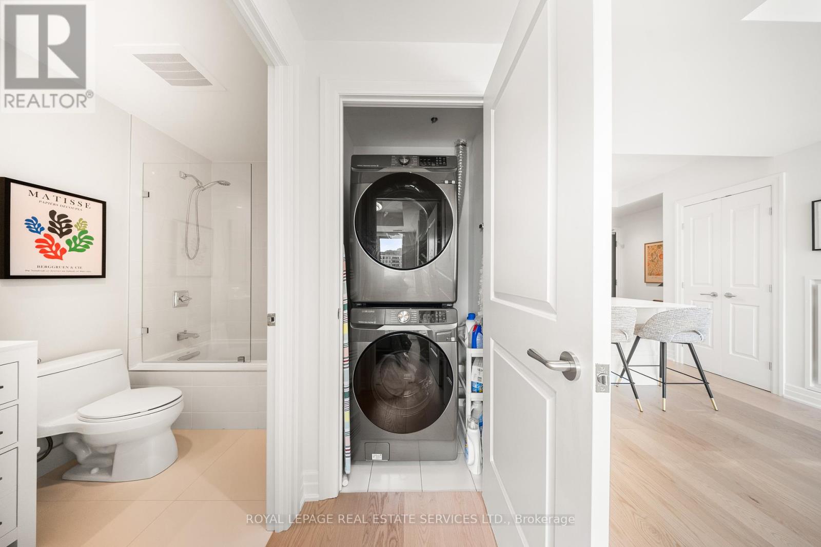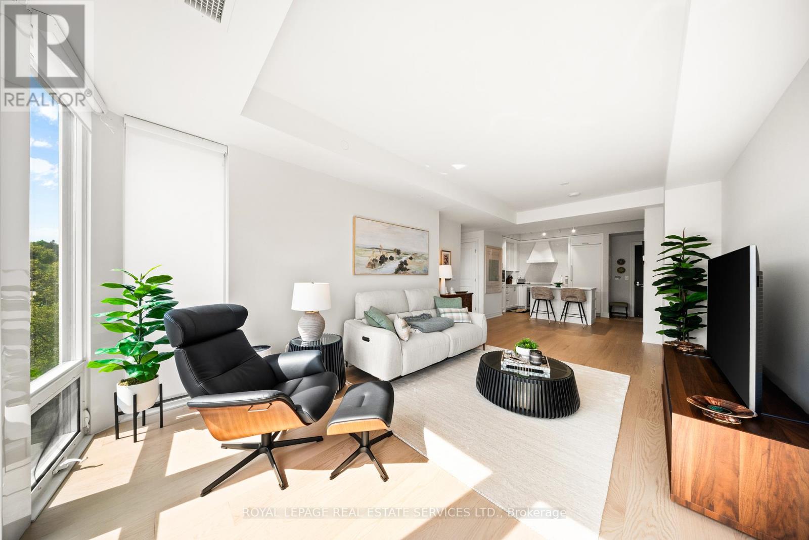 Elegant 1 bedroom, 1 bathroom suite at the prestigious Riverhouse Condominium at the Old Mill, featuring floor to ceiling windows that invite an abundance of natural light. The interior showcases wide plank engineered white oak flooring, a gorgeous kitchen with quartz countertops and island, herringbone tile backsplash, and contemporary track lighting. The bathroom is finished with a sleek new vanity, glass-enclosed shower, tile flooring, and upgraded lighting. Additional enhancements include thoughtfully selected new lighting fixtures throughout and parquet style wooden floor on private balcony. Located just steps from the Old Mill Subway Station and Humber River, this building offers 24-hour concierge service, an indoor pool, hot tub, and party room. Enjoy a tranquil setting within walking distance to parks, the TTC, and the shops and restaurants of Bloor Street West. extras all installed in last year *** Proverco engineered hardwood wide plank floor, parquet flooring on patio. Vanity in bathroom and glass for shower, bathroom floor, recessed medicine cabinet in bathroom, lighting and faucet in bathroom. herringbone tile backsplash in kitchen and quartz counter / island, sink and faucet in kitchen, rrack lighting in kitchen. All lighting recently replaced. Brushed nickel door handles. Custom built in closet (id:4555)