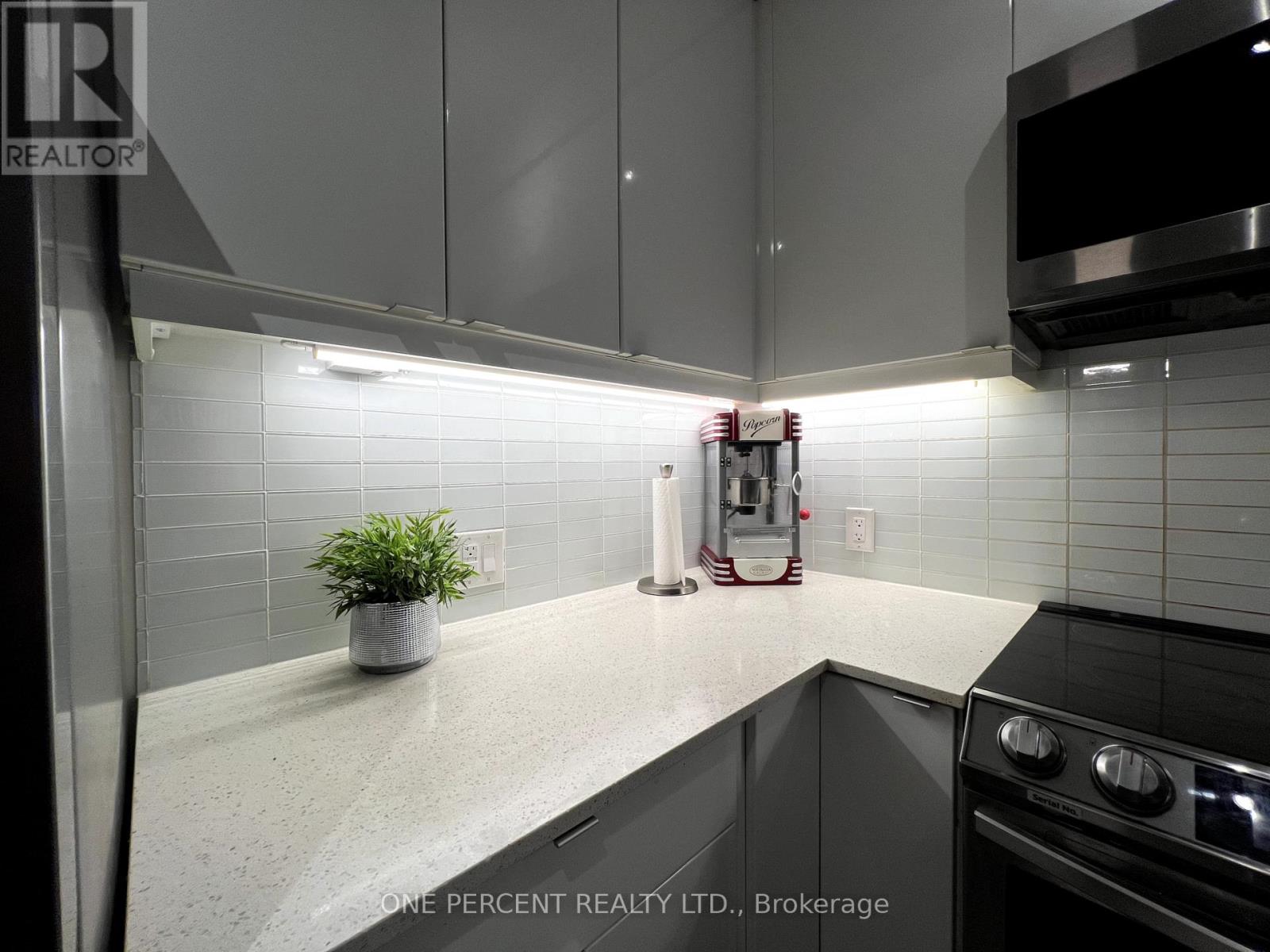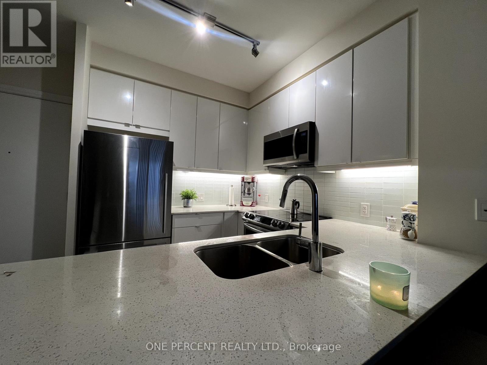 Spacious and bright 1+1 bedroom condo with modern finishes in a prime Etobicoke location, featuring 9 ft ceilings and 8 laminate flooring throughout. The open-concept living and dining area offers a walk-out to an open balcony with unobstructed views of Toronto. The kitchen boasts quartz countertops, a breakfast bar and stainless steel appliances. The large den is ideal for a home office or additional living space, and the primary bedroom includes a generous closet. This unit comes with a double-depth tandem parking spot and one locker. Building amenities include a 24-hour concierge, fully equipped gym, yoga room, party room, guest suites, childrens play area, outdoor BBQ terrace, and visitor parking. Located just steps to Kipling GO and TTC Station, with quick access to Hwy 427, Gardiner Expressway, and QEW, and close to shopping, dining, schools, and parks. (id:4555)