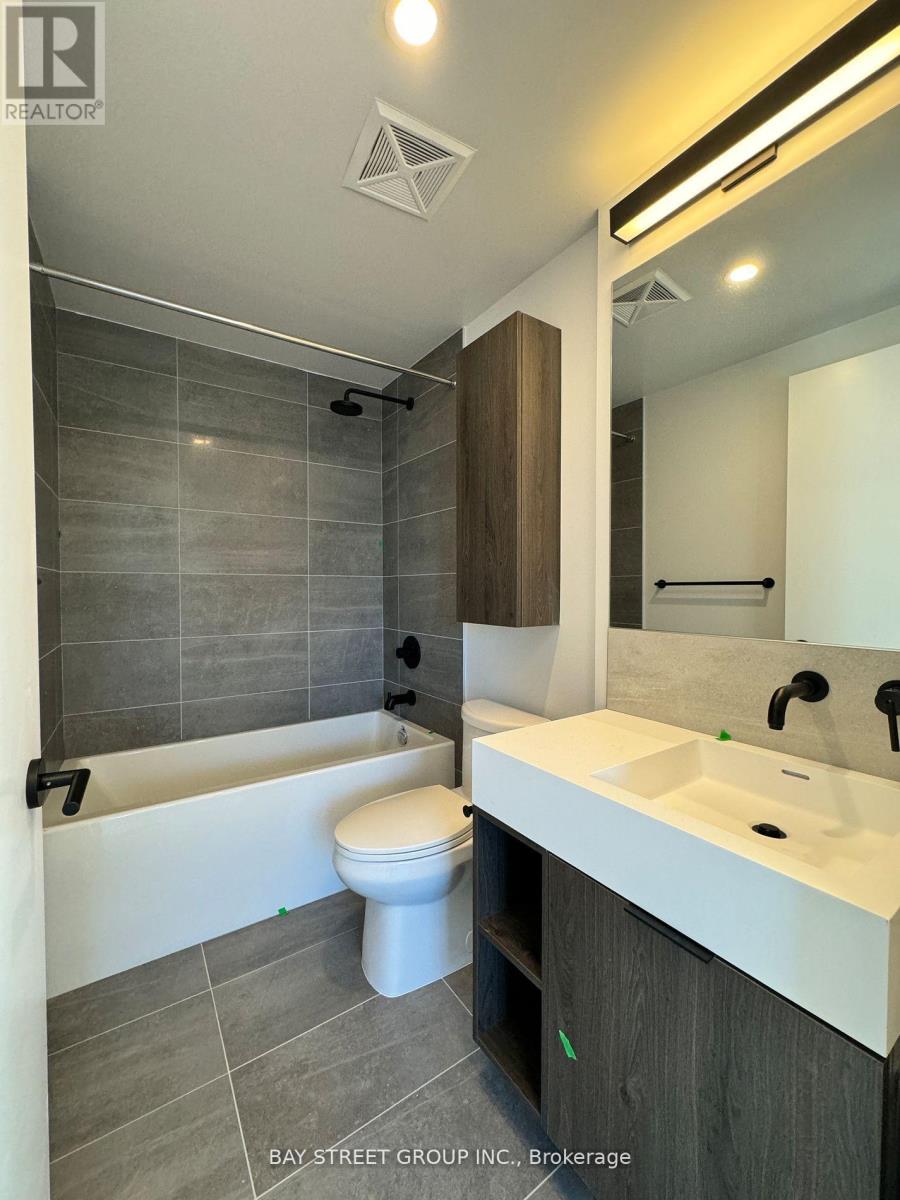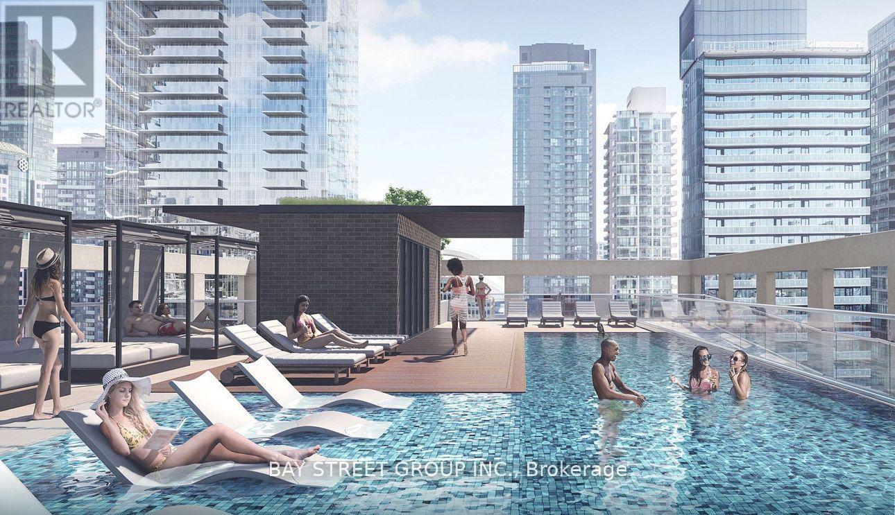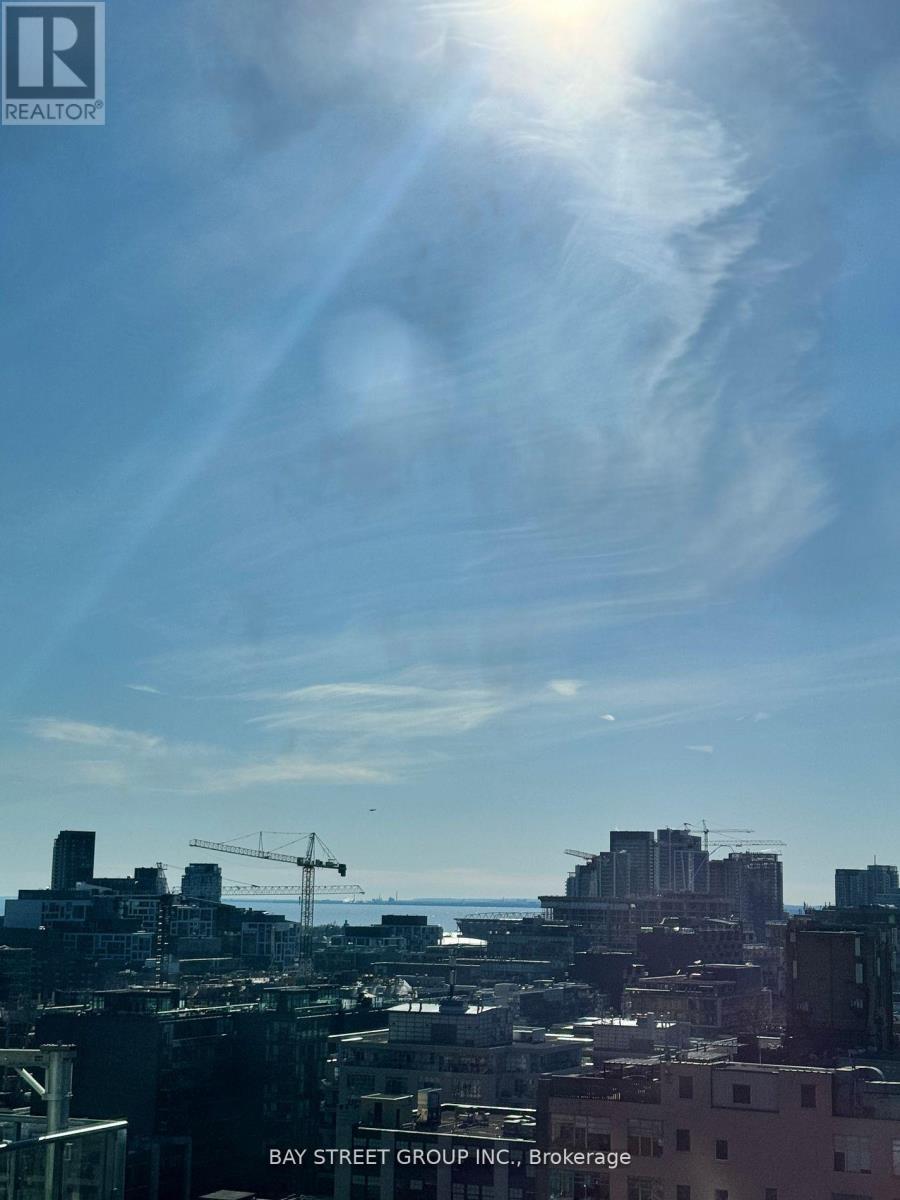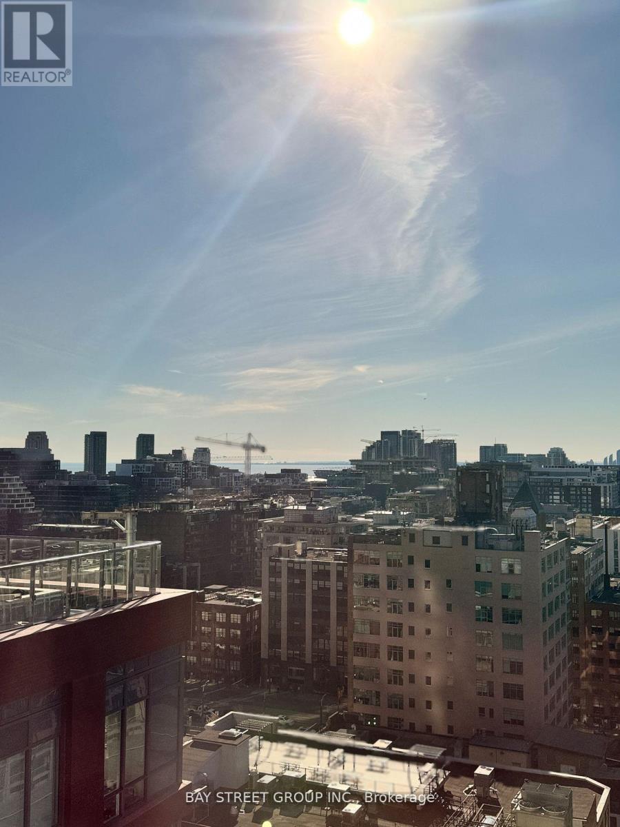 Prime Location in the Vibrant Heart of Toronto's Entertainment District. This never-occupied suite offers 746 sq ft of interior space, featuring a private balcony, 2 bedrooms, a den, and 2 bathrooms. The modern designer kitchen and bathrooms are complemented by laminate floors throughout, 9 ft ceilings, and sleek quartz countertops with a matching backsplash. Additional highlights include a spacious walk-in laundry closet, providing both style and functionality in a prime location. (id:4555)