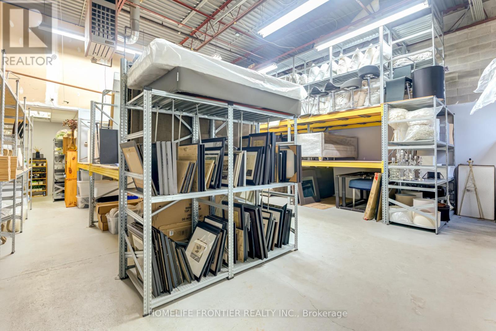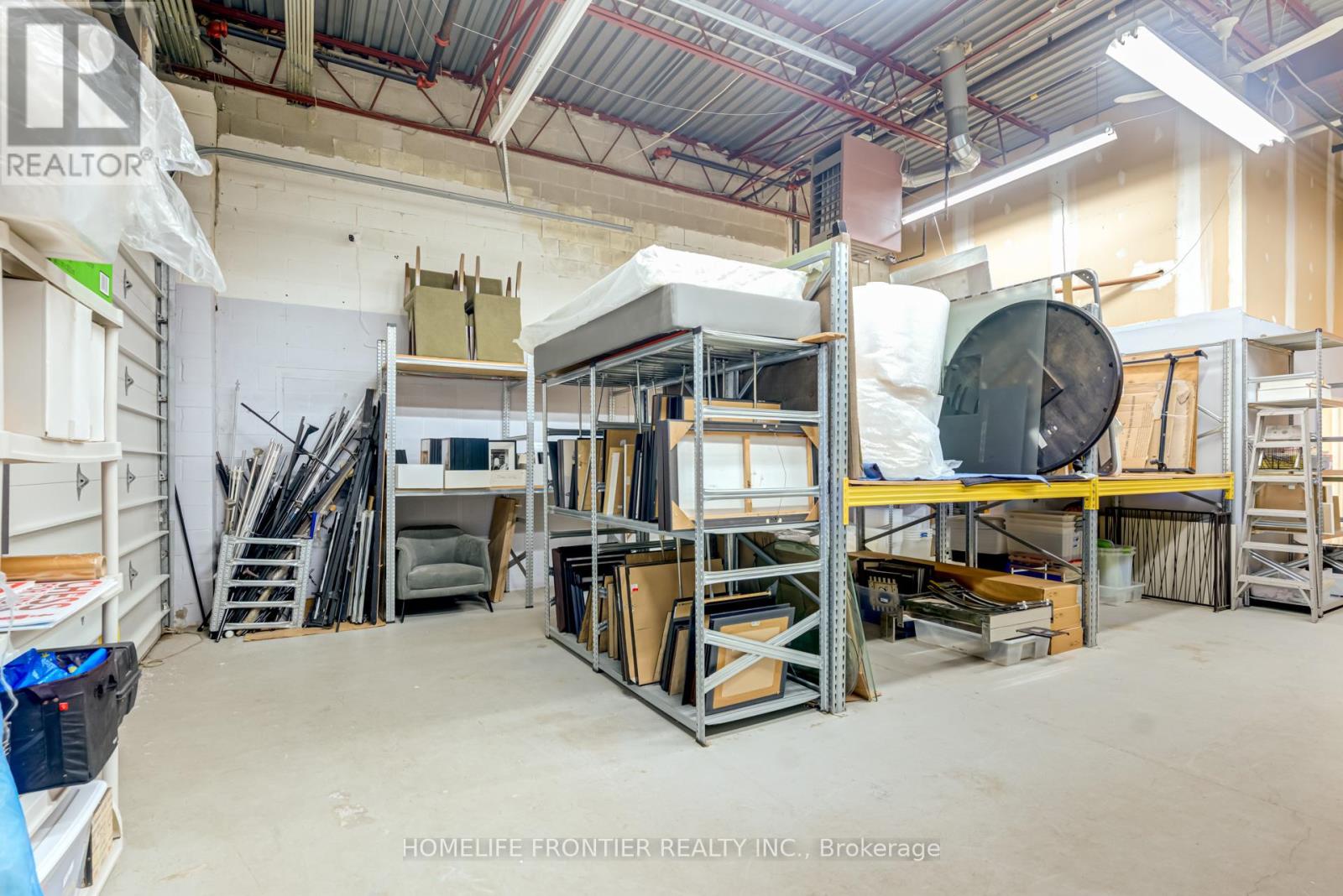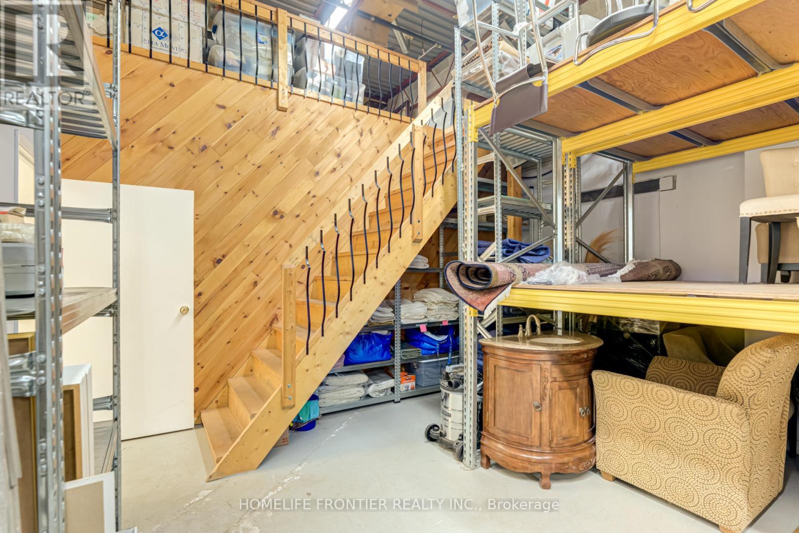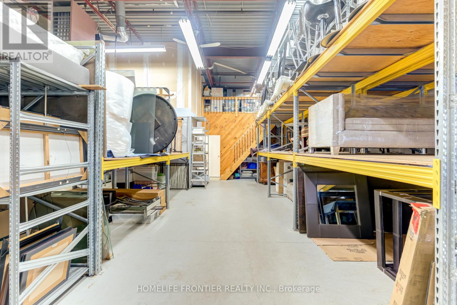 Versatile Industrial Condo with Finished Office & Mezzanine. Beautifully maintained 2,360 sq. ft. industrial condo, featuring 1,843 sq ft of ground-floor space plus a 516 sq ft mezzanine. The front portion includes approx. 600 sq ft of professionally finished office space with laminate flooring and expansive wall-to-wall windows overlooking manicured landscaping, Ideal for professional uses such as law, medical, dental, accounting or real estate. The office can be leased separately for additional income.The rear warehouse offers approx. 1,250 sq ft of open space with 17 feet clear ceilings, a ground-level shipping door (12' H x 10' W), and a separate man door. A 2-piece washroom is located between the office and warehouse areas. Mezzanine provides extra storage or workspace. Existing shelving can stay or be removed. Clean, bright and move-in ready. Zoned for a wide range of permitted uses. (id:4555)