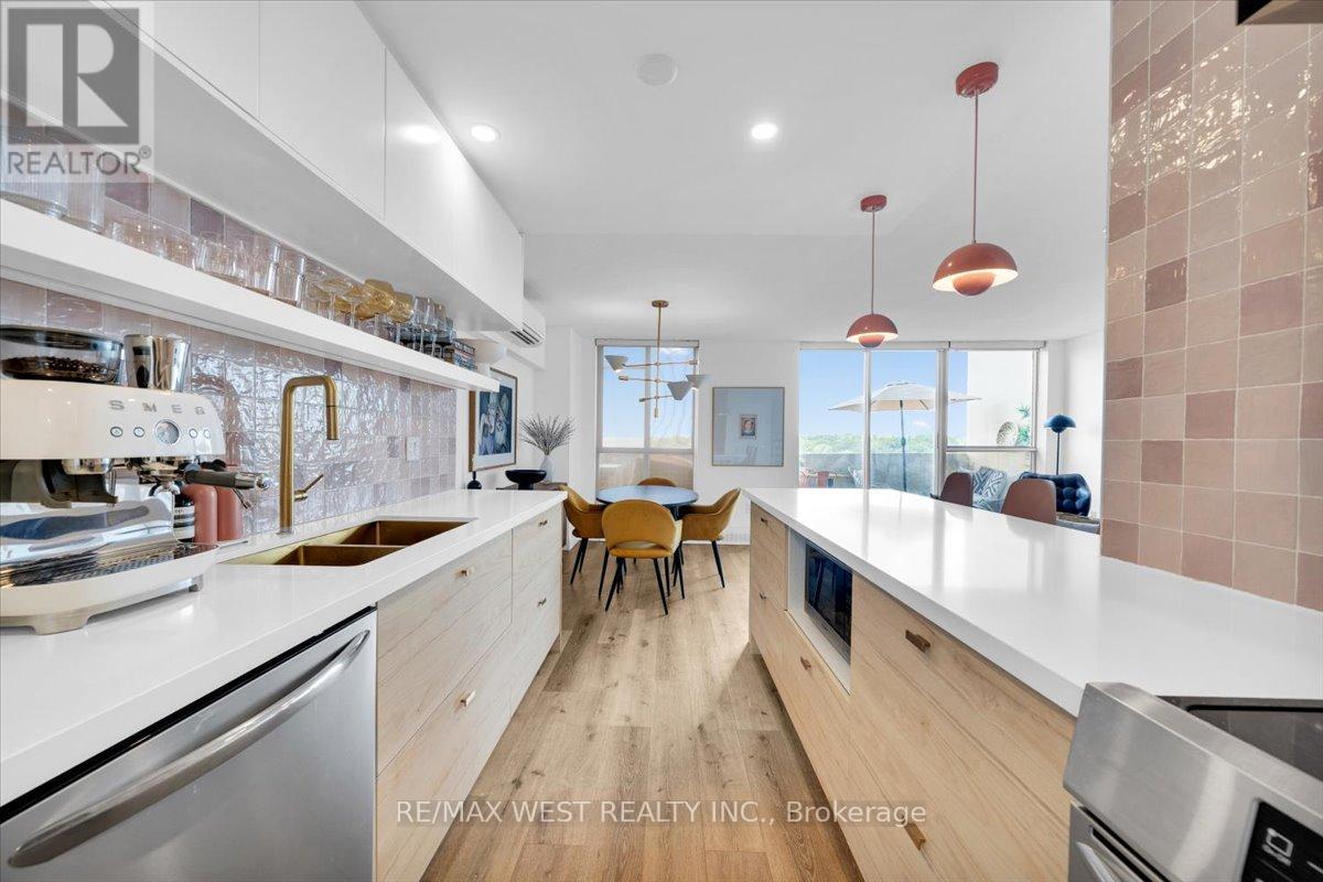 Fall head over heels in this one-of-a-kind professionally designed two-storey corner suite the moment you arrive. Rarely offered in High Park-Swansea, this three-bedroom, one-bath, two-storey condo showcases panoramic views of the Humber River and Lake Ontario from every room. Expansive floor-to-ceiling windows fill the open-concept layout with natural light and offer serene treetop views.The open living and dining areas create a backdrop for gatherings. The chef-inspired kitchen boasts white quartz countertops, a blush-pink tile backsplash, stainless steel appliances and three terracotta pendants above the island. A custom eat-in nook framed by water views sets the scene for morning coffee. Upgraded hardwood floors and designer lighting complete the aesthetic. Sliding glass doors open to an oversized private terrace with treetop and water views, creating the perfect oasis. Enjoy barbecues, alfresco dinner gatherings and beautiful sunrises and sunsets. This secluded terrace truly completes the condo experience. Discover three generous bedrooms bathed in natural light and framed by lush treetop scenery. The spa-like bathroom makes a bold statement with lush botanical wallpaper, a deep soaker tub, a sleek black shower head and matching fixtures. Additional conveniences include one exclusive underground parking spot, a private storage locker and all-inclusive maintenance fees covering cable television and high-speed internet. The building amenities include pool, gym, sauna, tennis court, security guard, private dog park, visitor parking, bicycle storage and tennis courts. Ideally located steps from High Park, Lake Shore Waterfront Trails, Grenadier Pond, local cafes, cheese boutique, and easy access to The Queensway, Lake Shore, Bloor Street West, and TTC. This designer suite offers the ultimate blend of modern style, comfort and city convenience. Unpack, move in and start living the elevated lifestyle you've been dreaming of, welcome home! (id:4555)