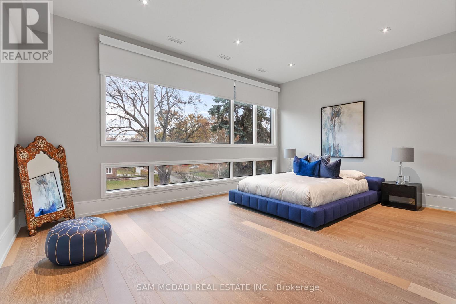 Set along South Etobicoke's prestigious lakefront corridor, this modern estate offers over 6,200 SF of refined interiors paired with resort-style amenities seldomly available. Bold in presence and uncompromising in design, it sits behind mature trees with an architectural profile that frames uninterrupted Lake Ontario views. A dramatic open-to-above foyer introduces the home, featuring a floating glass staircase, overhead skylights, and a direct views of the water. The main level unfolds as a sequence of sophisticated living spaces defined by warm wood ceilings, gallery-like walls, and a sculptural double-sided linear fireplace. Near floor-to-ceiling windows wrap the home, inviting natural light and capturing the shoreline from every angle. The chef's kitchen delivers a magazine-worthy experience with Wolf and Sub-Zero appliances, bespoke cabinetry, a custom backsplash, and a striking central island. Adjacent living and dining zones create a fluid setting for elevated entertaining or intimate evenings. Above, 4 serene bedroom suites each offer a walk-in closet and ensuite. The lakefront primary retreat features a boutique dressing room, spa-calibre ensuite with heated floors and a freestanding tub overlooking the water, plus a private balcony for quiet reflections.The lower level extends the home's resort-like character with a recreation lounge, bar, gym, sauna, steam room, wine cellar, and an additional guest suite, opening seamlessly to the tiered backyard. Outdoors, multiple terraces, mature landscaping, a heated pool, hot tub, and sweeping lake vistas create a breathtaking environment for year-round enjoyment. Additional comforts include a heated driveway, architectural millwork, integrated lighting, and a layout designed for both luxury living and effortless hosting. Moments from waterfront trails, marinas, golf, and downtown Toronto, this estate offers a rare opportunity to own an impeccably crafted lakefront home. (id:4555)