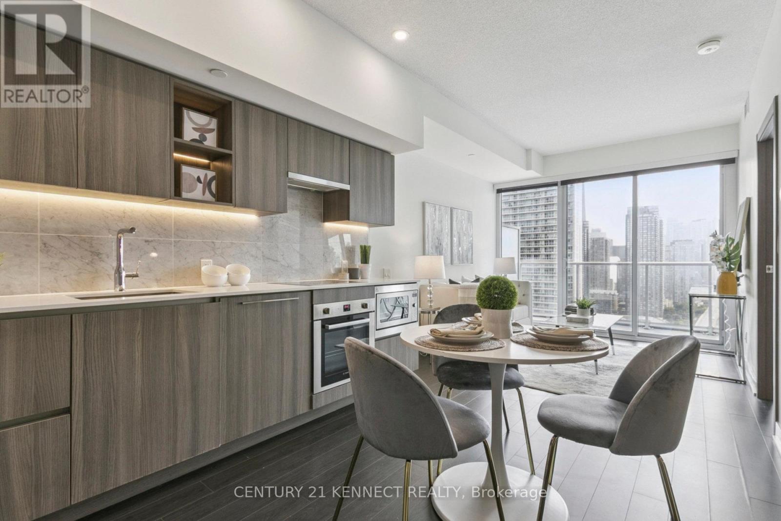 Modern and sophisticated high-floor suite at The Lakeshore. This curated 1 bed + den unit features opulent marble finishes, 9ft ceilings, an oversized walk-in closet, and a contemporary kitchen with premium integrated appliances. Standout details include an open versatile den, walnut floors that flow throughout and an east-facing balcony offering sweeping views of the city skyline and waterfront. Situated in Toronto's prestigious waterfront community, just steps from Loblaw's flagship supermarket and87,000 sq. ft. of retail space, including Shoppers, Starbucks, and LCBO with easy access to transit and hwy. This residence provides the perfect blend of refined living, exceptional convenience, and best-in-class amenities including an indoor pool, theatre, fitness room, outdoor patio, golf and much more! (id:4555)
