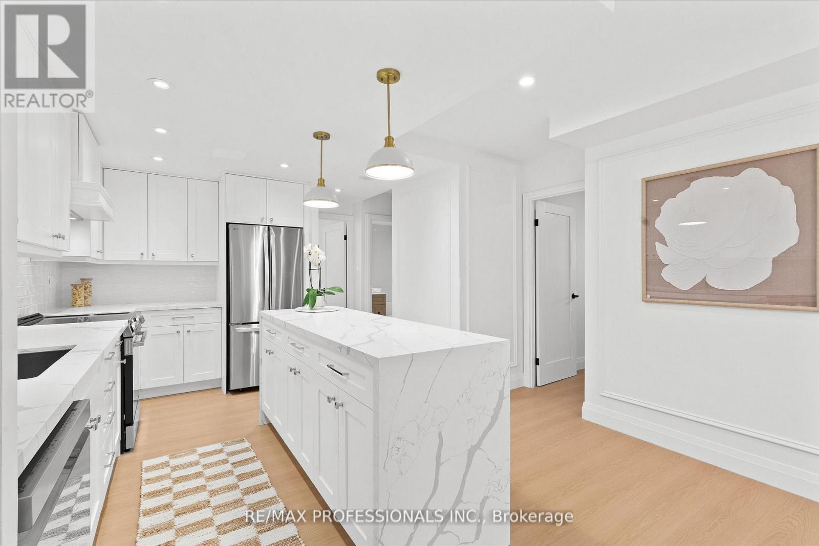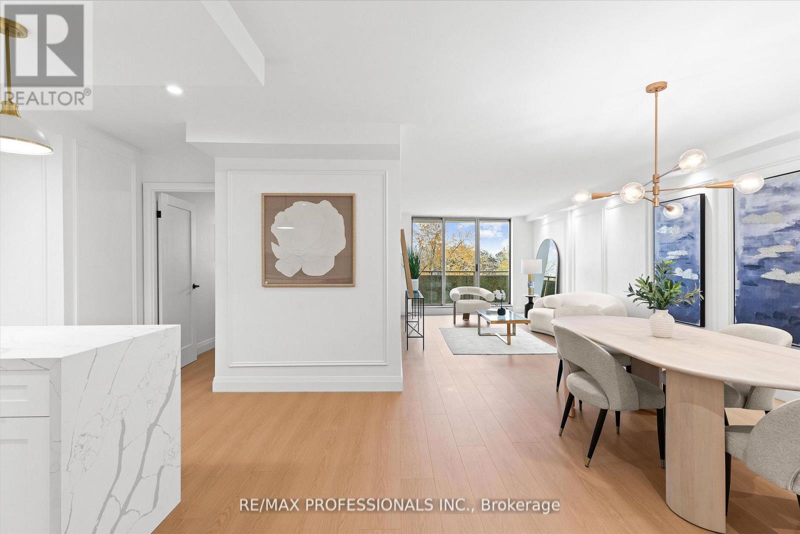 Welcome to this beautifully renovated, boutique-like 3-bedroom, 2-bathroom corner unit, offering over 1,100 square feet of modern living space. Flooded with natural light from multiple exposures, the layout feels open and airy the moment you walk in. The home features Canadian-made laminate floors throughout, elegant wainscoting, sleek pot lighting, and custom-built closets that maximize storage. The custom-designed, open-concept kitchen with a waterfall island is a true showstopper, complete with all-new appliances and refined quartz countertops-perfect for cooking, entertaining, and everyday living. Luxury is redefined in both bathrooms, featuring Italian-made tiles and tasteful modern finishes. Every room feels bright, spacious, and inviting. Fully updated from top to bottom, this move-in ready unit truly redefines luxury and comfort. Maintenance fees are all-inclusive, covering hydro, heat, water, air conditioning, Rogers cable, and high-speed unlimited internet. The building offers an impressive array of amenities, including indoor and outdoor pools, sauna, a newly renovated recreation center with gym, ping pong, squash court, golf simulator, party room, outdoor playground, basketball court, and tennis court. Ideally located next to top-rated schools and Centennial Park, with TTC at your doorstep and quick access to Highways 427, 401, and QEW, airport, shopping, golf, and more-just move in and enjoy! (id:4555)