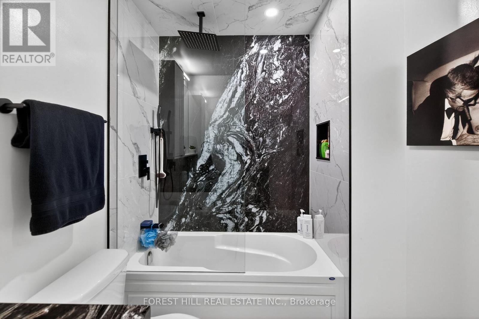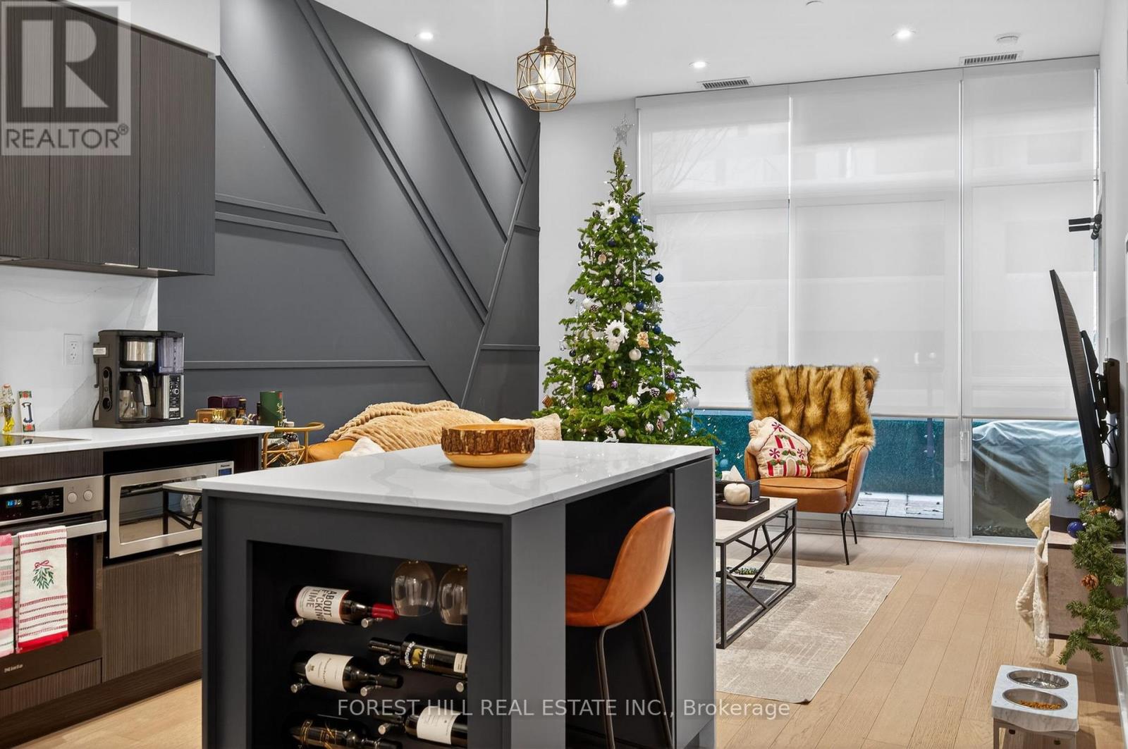 Luxury Ground-Floor 1 Bedroom Suite - Fully Renovated & Move-In Ready. This stunning, fully upgraded 1 bed, 1 bath residence features 10 ft ceilings, hardwood floors throughout, full floor-to-ceiling windows. Feature walls in both the living and primary bdrm. Throughout the unit, dual roller blinds offer total control, sheer shades for natural daylight and full blackout rollers for complete privacy and restful nights. Premium Miele S/S appliances, sleek kitchen island w/ waterfall countertop and built-in wine rack, new doors/trim, and pot lights on dimmers throughout. Spa-quality bathroom with upgraded tiles, rainfall shower + handheld, granite vanity top with built in sink, and luxury finishes end to end. Enjoy a rare private ground-floor terrace with composite decking, green feature wall, and LED perimeter lighting-perfect for summer. This ground floor unit lets you skip the elevator waits and enjoy direct, effortless access every day, while still having an elevated balcony overlooking the Shops at Don Mills. This suite also comes with a locker and a Tesla-charging parking spot, a rare upgrade! Tenant pays only hydro. One of the most luxurious units in the building, a must-see! (id:4555)