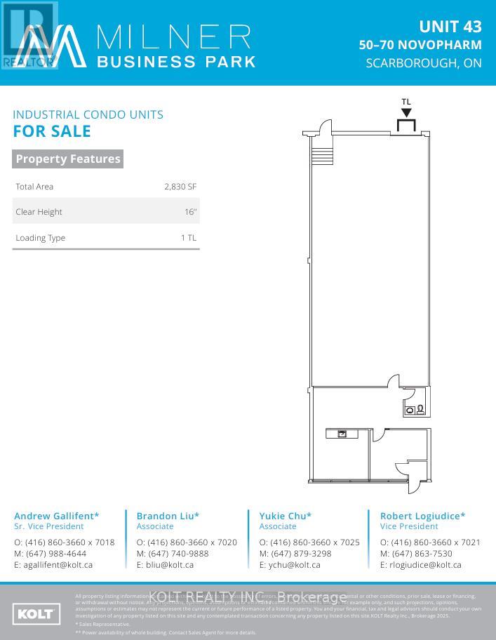 Welcome to the Milner Business Park, featuring this Prime Industrial unit offering 2,830 sq.ft. with 16' clear height, & 1 Truck-level Loading Dock. Ideal for end users or investors.Great location in high demand industrial area and offering quick access to Hwy 401, a keybenefit for logistics and transport-oriented businesses. Flexible E0.6 zoning can accommodate awide range of industrial uses. The property's three access points help streamline entry andexit, with ample parking spaces for your staff & clients. Vendor can provide turnkey buildouts& renovation options, and the space is easily adaptable to your needs. This industrial unit isa smart choice for operational efficiency and investment potential. Industrial Condo Unit #43,Municipal Address 60 Novopharm Court. (id:4555)