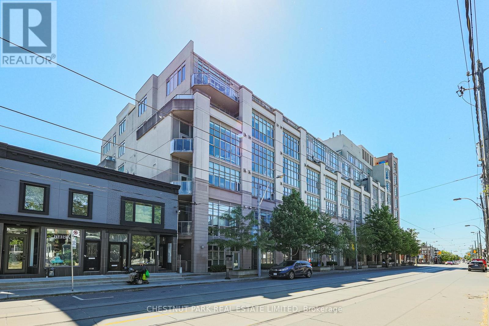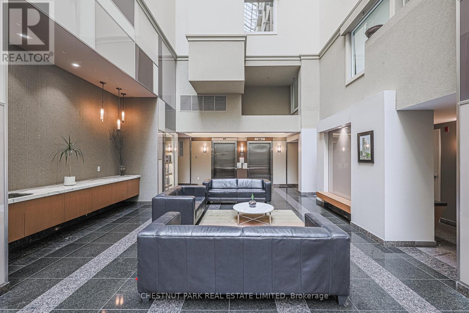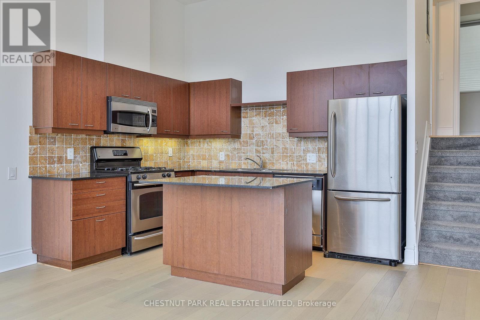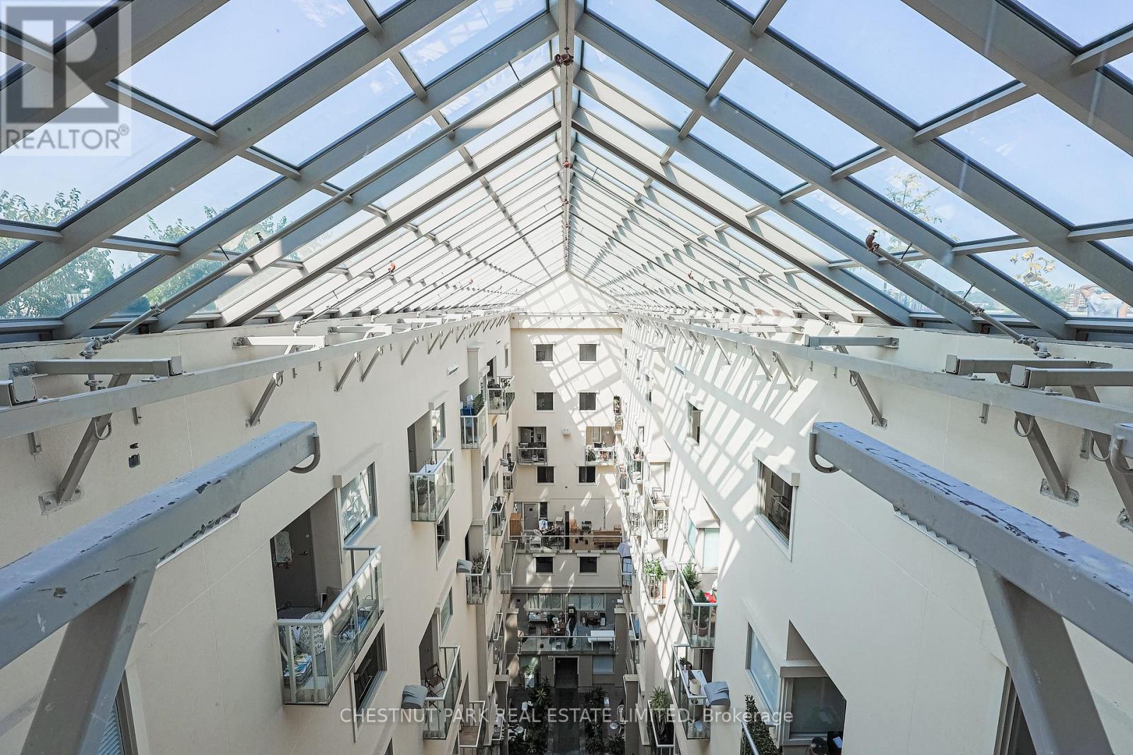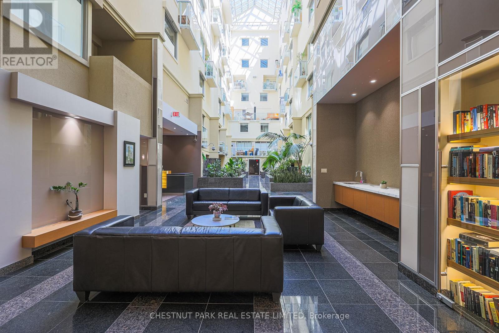 Architecturally striking three-level loft in the coveted High Park Lofts, offering refined urban living in the heart of Roncesvalles Village. This newly renovated 1-bedroom + oversized den residence spans approx 822 sq. ft. and features dramatic 13-ft ceilings with expansive west-facing floor-to-ceiling windows. Enjoy open sky and sunset views framed by the historic church steeple across Roncesvalles - a rare and serene outlook. The open-concept main level showcases a modern kitchen with full-size stainless steel appliances, gas range, granite countertops, generous storage, and a large island with a breakfast bar - ideal for both everyday living and entertaining. The sun-filled living and dining area is anchored by a cozy gas fireplace, creating a warm yet elevated atmosphere. Upgrades include new hardwood flooring, fresh paint, custom blinds, and an ensuite laundry. A standout feature is the substantial den on its own level, complemented by an atrium-style interior balcony overlooking the building's landscaped garden atrium and lobby - an exceptional flex space ideal for a home office, studio, or retreat. Boutique, pet-friendly building with concierge service, rooftop terrace with BBQ, and resident meeting room with WiFi. Steps to Howard Park, Sorauren Park Farmers' Market, High Park, Sunnyside Beaches, TTC subway and streetcar lines, and the UP Express/Bloor GO Station - offering direct access to Union Station or Pearson Airport in approximately 15 minutes. A rare leasing opportunity offering volume, light, and architectural character in one of Toronto's most desirable neighbourhoods. Investor owned and professionally managed, this is a great opportunity for Tenants. Building offers bicycle storage and visitor parking underground. Locker available for additional $50 per month. (id:4555)