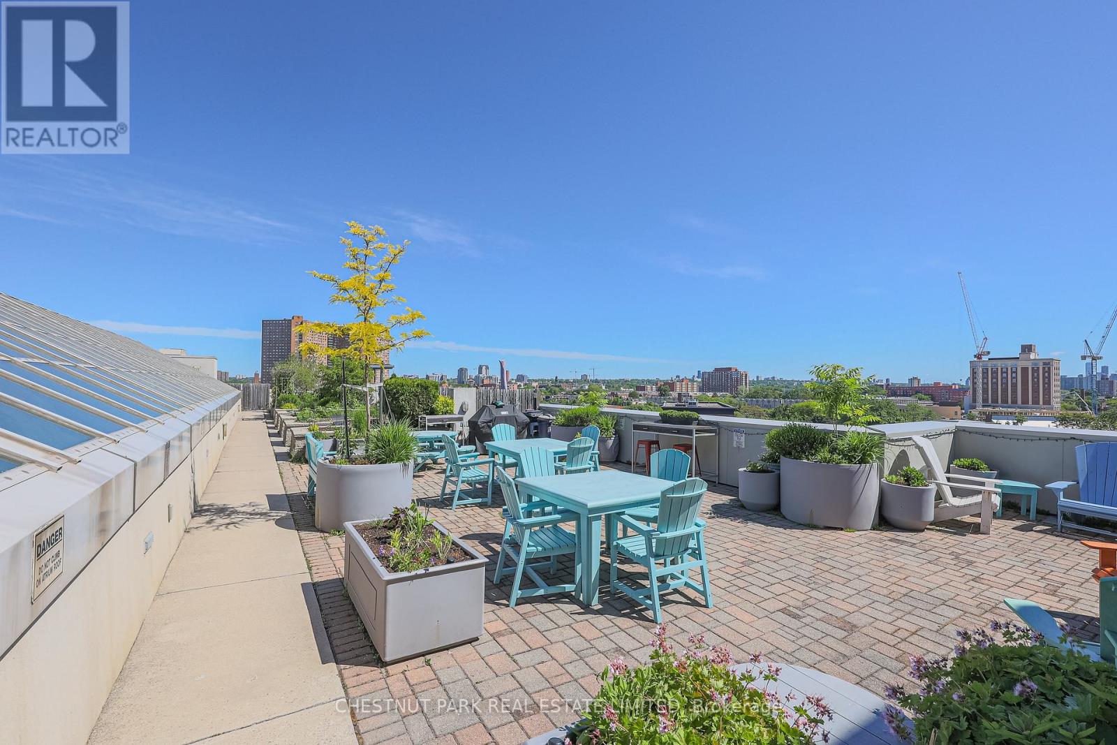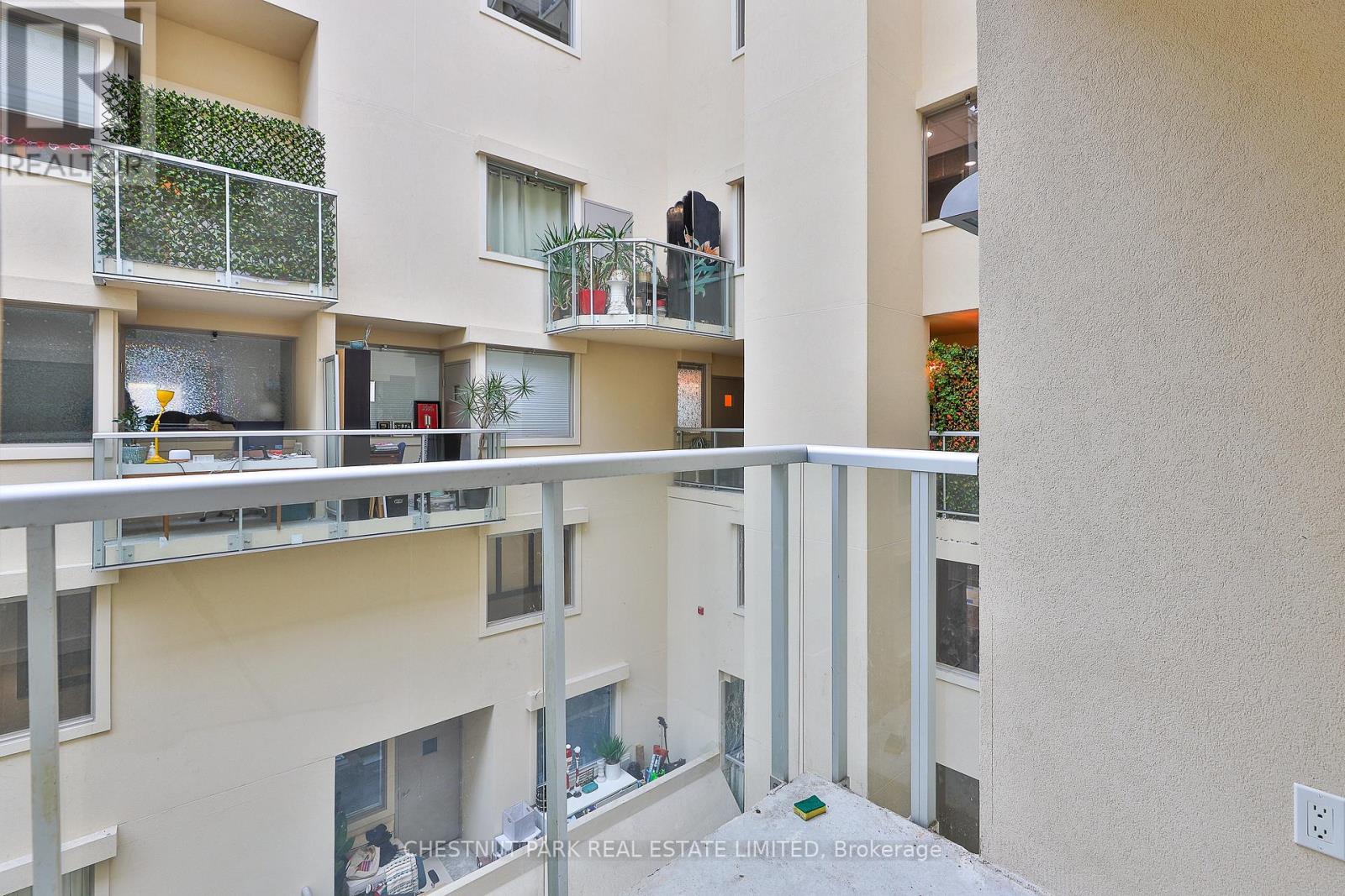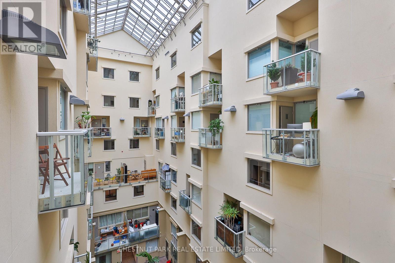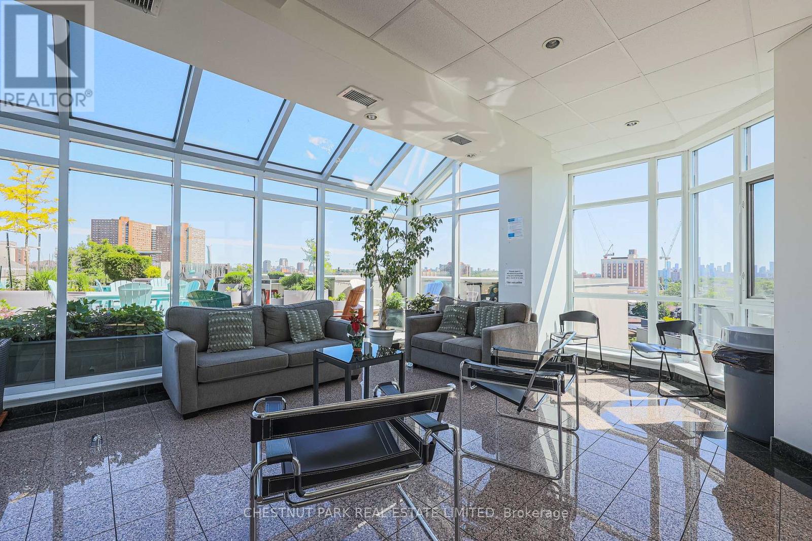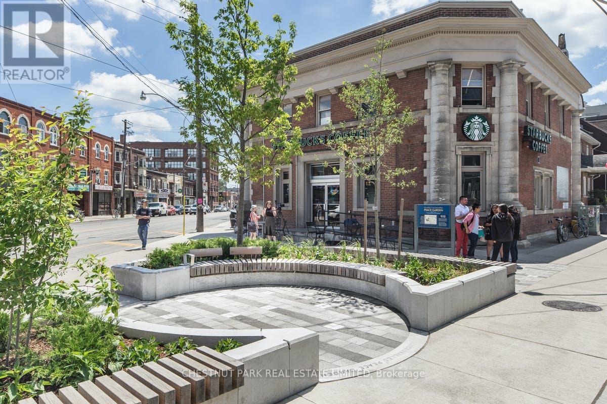 Architecturally striking three-level loft in the coveted High Park Lofts, offering refined urban living in the heart of Roncesvalles Village. This newly renovated 1-bedroom + oversized den residence spans approx 822 sq. ft. and features dramatic 13-ft ceilings with expansive west-facing floor-to-ceiling windows. Enjoy open sky and sunset views framed by the historic church steeple across Roncesvalles - a rare and serene outlook. The open-concept main level showcases a modern kitchen with full-size stainless steel appliances, gas range, granite countertops, generous storage, and a large island with a breakfast bar - ideal for both everyday living and entertaining. The sun-filled living and dining area is anchored by a cozy gas fireplace, creating a warm yet elevated atmosphere. Upgrades include new hardwood flooring, fresh paint, custom blinds, and an ensuite laundry. A standout feature is the substantial den on its own level, complemented by an atrium-style interior balcony overlooking the building's landscaped garden atrium and lobby - an exceptional flex space ideal for a home office, studio, or retreat. Boutique, pet-friendly building with concierge service, rooftop terrace with BBQ, and resident meeting room with WiFi. Steps to Howard Park, Sorauren Park Farmers' Market, High Park, Sunnyside Beaches, TTC subway and streetcar lines, and the UP Express/Bloor GO Station - offering direct access to Union Station or Pearson Airport in approximately 15 minutes. A rare leasing opportunity offering volume, light, and architectural character in one of Toronto's most desirable neighbourhoods. Investor owned and professionally managed, this is a great opportunity for Tenants. Building offers bicycle storage and visitor parking underground. Locker available for additional $50 per month. (id:4555)
