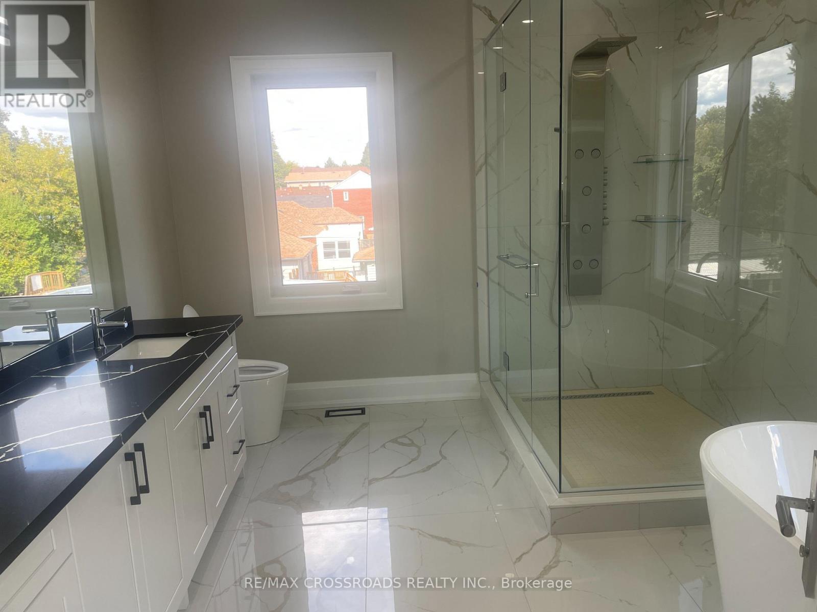 Stunning 4-Bedroom, 5-Bathroom Detached Modern Home in the Heart of Clairlea! This quality-built residence features an airy open-concept main floor with high ceilings, engineered hardwood floors, and pot lights throughout. The elegant living and dining areas are perfect for entertaining and hosting large gatherings. The gorgeous custom-built gourmet kitchen is equipped with high-end stainless steel appliances and a large waterfall island. A sun-filled family room offers built-in cabinetry, a cozy fireplace, and a discreet powder room. The main floor also includes a generously sized office or additional room. Upstairs, the lovely primary bedroom boasts a 5-piece en-suite, walk-in closet, and an extra-large window with views of the CN Tower. The second bedroom features its own 3-piece en-suite and oversized closet. Two additional well-sized bedrooms share a Jack-and-Jill bathroom. The bright and spacious basement offers vinyl flooring, 10-foot ceilings, above-grade windows, and a walk-out. It includes a large recreation room, office area, play space, and a 3-piece washroom. Enjoy the beautiful fenced backyard and a double-car garage with ample parking. An exceptional family home in a prime location! (id:4555)