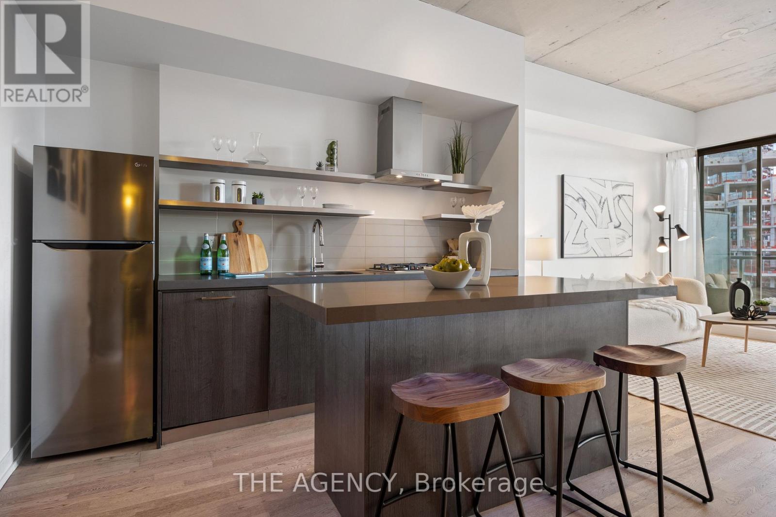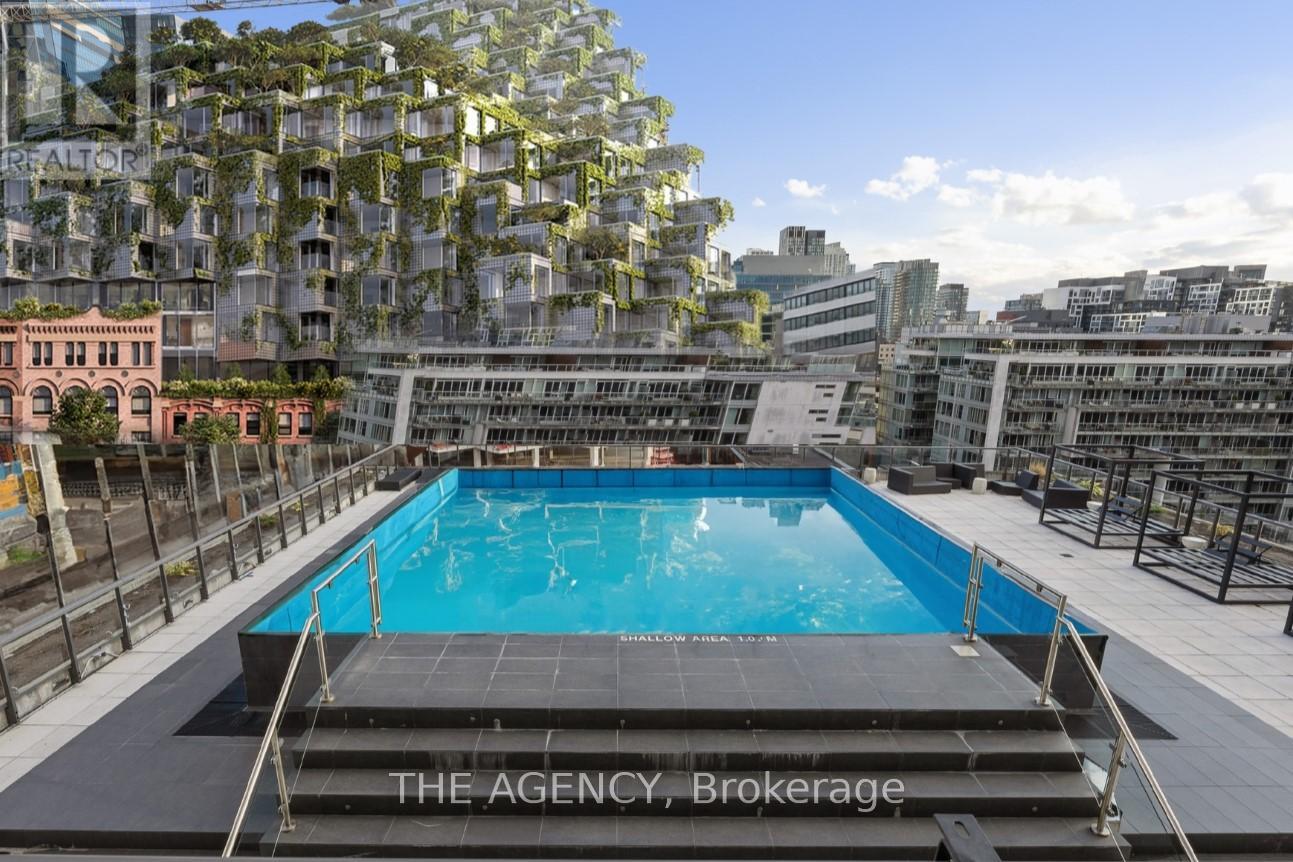Offer anytime! Step into the epitome of King West luxury at Fashion House Condos! One of Downtown Toronto's most sought-after buildings, this boutique gem radiates sophistication from the entrance onward. Located atop 'The Keg Steakhouse' and 'Majesty's Pleasure' social beauty club, and across from the iconic 'Rodney's Oyster House' and 'Mademoiselle Raw Bar & Grill', this is Fashion District living at its finest-- surrounded by the vibrant nightlife and renowned culinary experiences of King West. Did you know 'Sir Elton John' owns the penthouse across the street? This south-facing unit is flooded with natural light and boasts forever-unobstructed views of the district and the CN Tower, visible from both the balcony and bedroom. Enjoy open-concept, loft-style, living with 10' exposed concrete ceilings and pillars, and floor-to-ceiling windows. Step out onto a cabana-style balcony overlooking the buildings signature infinity pool- perfect for poolside vibes from the comfort of your home. With a gas BBQ hookup, deck tiles, and a luxurious round daybed, your outdoor escape awaits. Inside, discover a modern, open-concept interior with a practical layout. The European-style chef's kitchen features open top shelving, high-end stainless-steel appliances, a gas cooktop, and a spacious waterfall island. The primary bedroom, fits a king bed, offers a large walk-in closet and stunning views. The spacious den comfortably fits a queen-size bed and includes built-in storage. Both the bedroom and the den come with privacy sliding doors. The rarely available 5-piece bathroom provides the luxury of both a shower stall and a bathtub. Top-notch amenities include an infinity pool and cabanas connected to a state-of-the-art gym and a party room. TTC at your doorstep, 5 minutes by bike to the Toronto Waterfront and TikiTaxi station-- your King West oasis awaits! The unit comes with a parking spot and a locker, very close to each other. Heat and water included in the maintenance fees. (id:4555)
