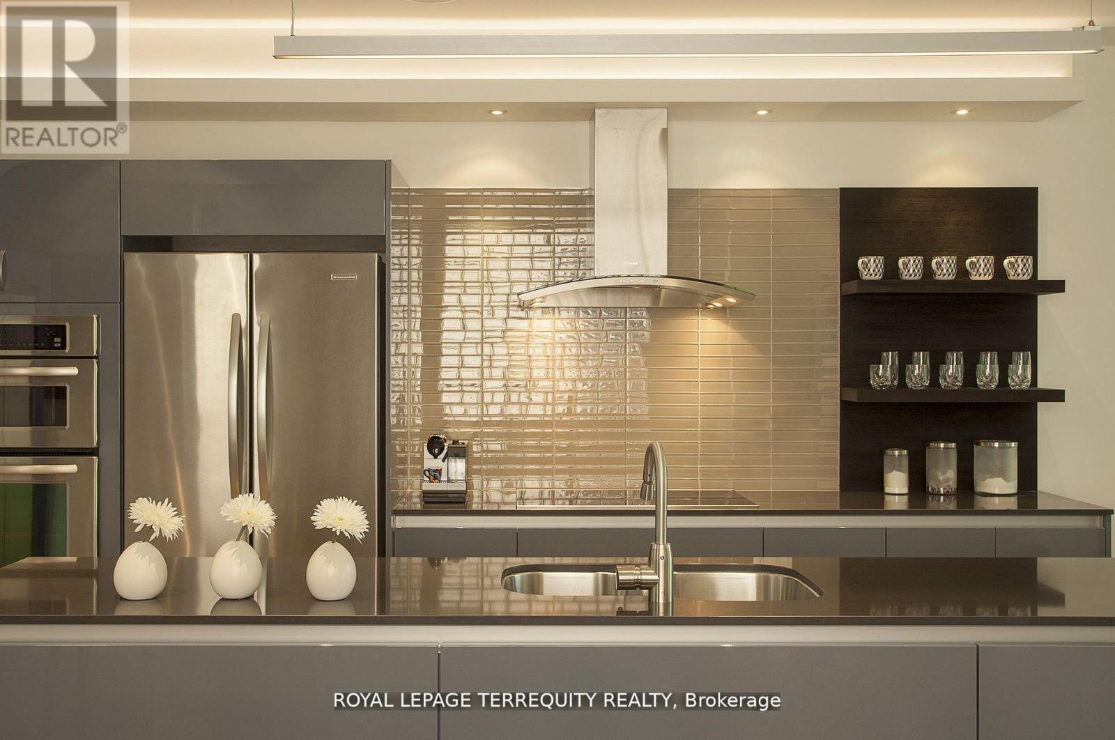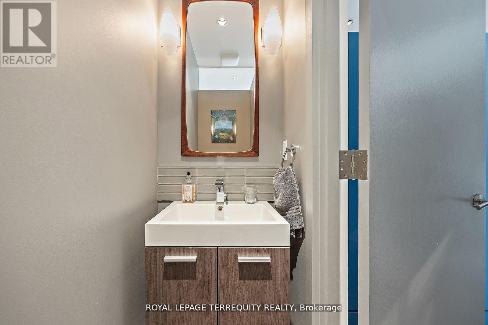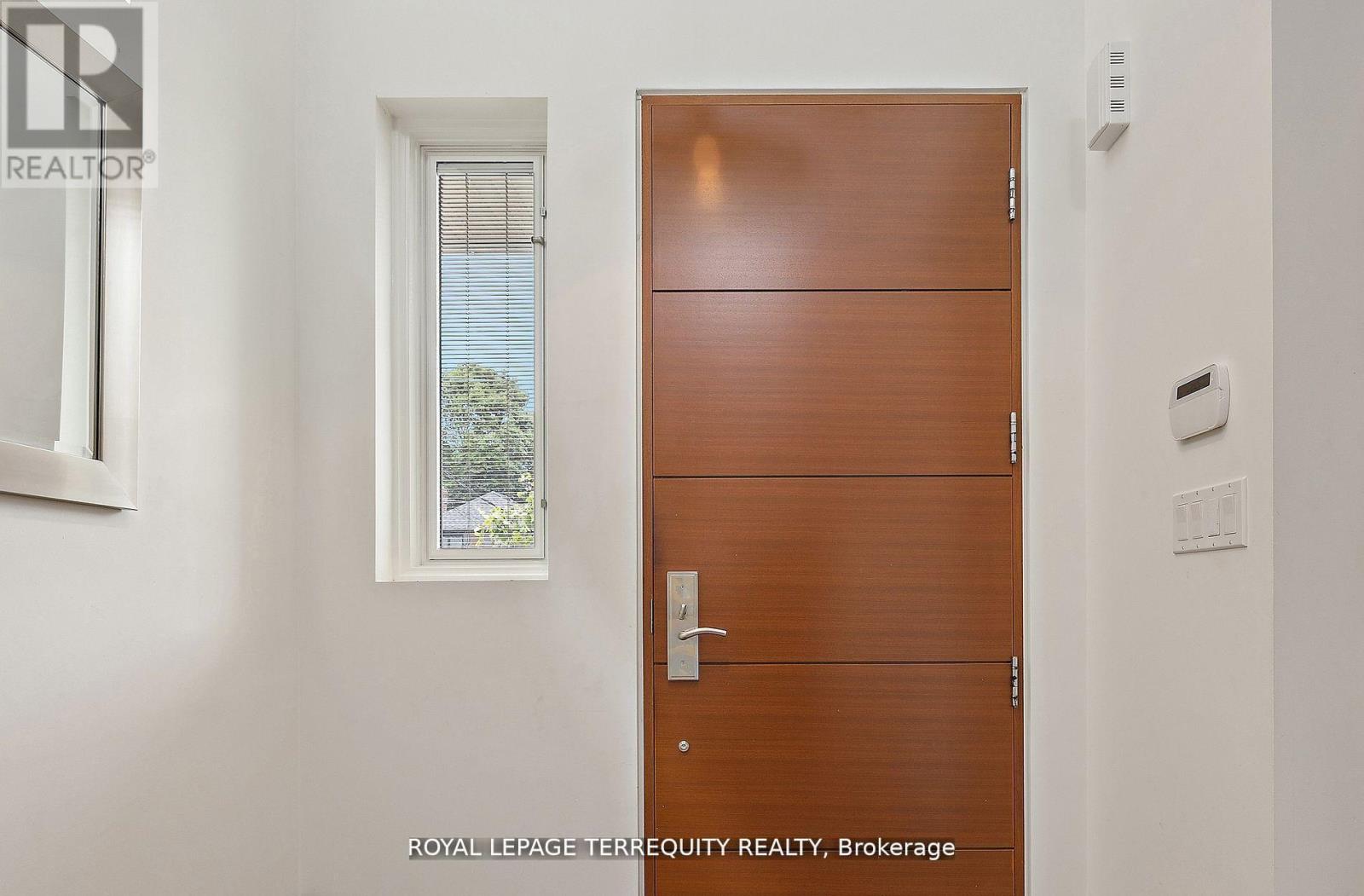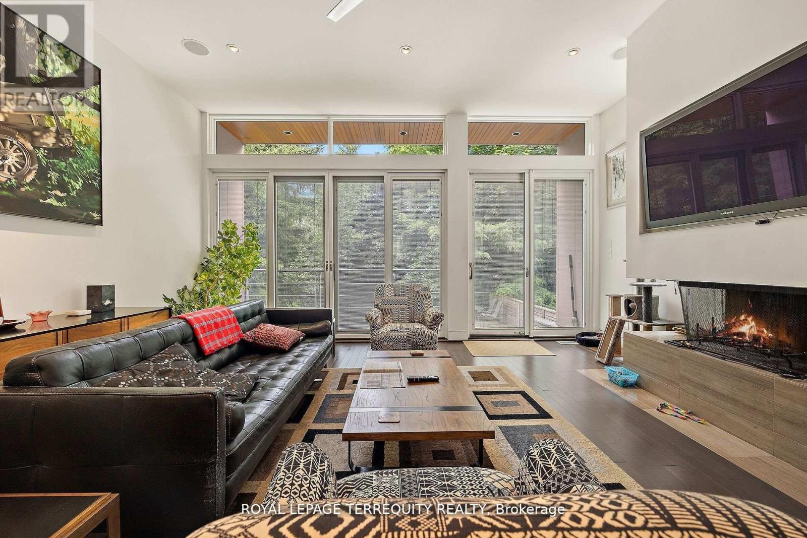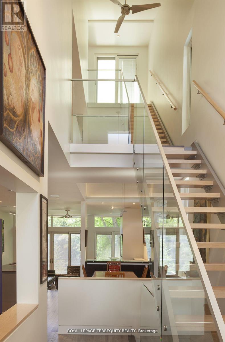 Outstanding architect-designed-and-built home on 4 levels includes a central atrium and an airy 3rd floor Primary suite with 2 decks, a sitting room, skylights, built-ins and a 6-piece bathroom with heated floors. The open floor plan is flooded with natural light and the Pella windows are equipped with built-in blinds. Stainless steel ceiling fans in the high ceilings complement the contemporary design of the floating staircases and the functionality of the dual HVAC. The second floor boasts a unique workstation/storage unit with generous cupboards and a large countertop overlooking the dining room and its glass block feature, as well as the laundry room, 3 bedrooms and 2 full bathrooms, one of them ensuite. The Binns' galley kitchen and dining room overlook the main floor family room with its wood burning fireplace and walk-out to the deep wooded lot. The recreation room or 5th bedroom also has a walk-out to the garden as well as a 3-piece bathroom. There is direct access to the garage and a separate front entrance on this floor. Located on a quiet, neighbourly, dead-end street in an eminently walkable area, there are three parking spaces. Magnificent Home. Motivated seller. (id:4555)