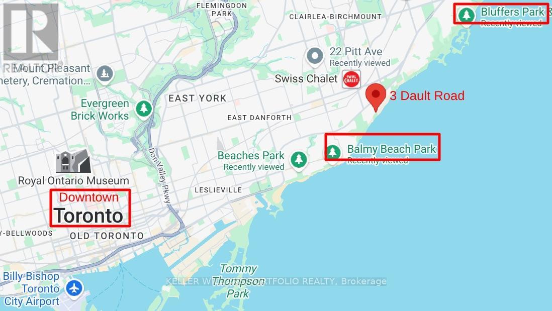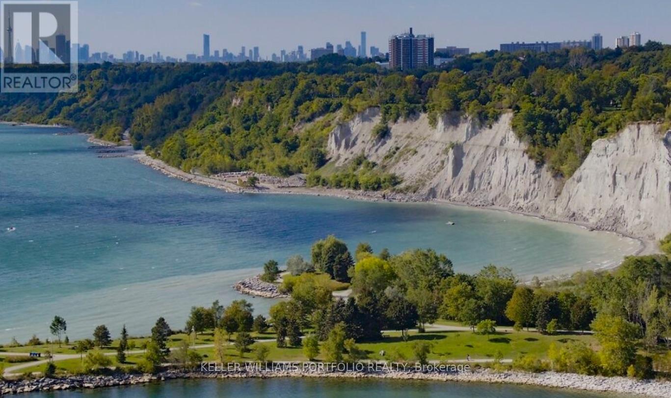 Paradise on the Bluffs with Lake Views. A rare, private and artfully designed retreat-once home to a renowned actor during multiple filming seasons. Set high on the Scarborough Bluffs overlooking Lake Ontario, this exceptional property offers serene living immersed in nature, just 12 km from downtown Toronto. Tucked away on a quiet cul-de-sac, this detached luxury residence features 2 bedrooms, 2+1 bathrooms, 3 parking spaces and an EV charger. The beautifully landscaped backyard unfolds to tranquil lake views framed by mature trees, with birds and deer as frequent visitors. The open-concept main floor is designed for comfort and awe: a sunken living room with cathedral ceilings and sliding glass doors to the yard and lake; a granite-clad kitchen with island seating for four; a dining area with custom cabinetry overlooking the living space and shimmering water; and a well-appointed bedroom with a large closet. The second floor offers refined, Asian-inspired décor, highlighted by an oversized primary suite with a spa-like 5-piece ensuite, a cozy family room and a dedicated office. The lower level is equally impressive, featuring a granite kitchen ideal for entertaining, a fully equipped gym and sliding doors leading to the backyard and lake views. Outdoors, the spectacular 400-foot-deep yard is adorned with Brazilian pebbles, flowers and trees, anchored by a fragrant lavender bush. Two expansive decks are perfectly positioned to take in the lake and lush surroundings. Curated with original artwork and sculptures from the artist-owners' travels, every space is infused with creativity and soul. Steps to a park, a 10-minute walk to the Rosetta McClain Gardens, a short drive to the beach, and minutes to the Bluffs-this is a rare opportunity to experience a true lakeside sanctuary in the city. (id:4555)