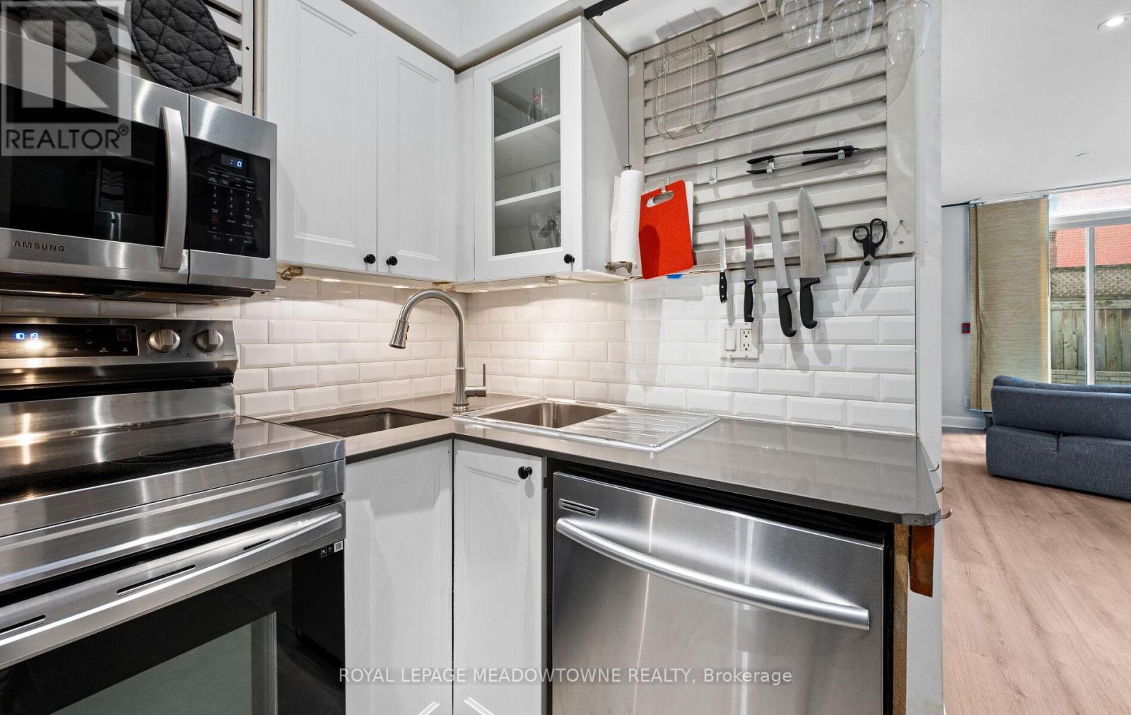 Location, location, location! Discover the perfect blend of convenience and charm in this rare 735 sq ft fully renovated ground-level gem. Located in the heart of downtown Toronto's Old Town, you're just a short stroll from iconic spots like Yonge-Dundas Square, the St. Lawrence Market, and endless dining, shopping, and cultural experiences. Step through your private front door into a welcoming foyer that opens into a sunken, open-concept living and dining area with soaring 9' ceilings-ideal for entertaining or relaxing in style. The king-sized primary bedroom boasts wall-to-wall closets and sun-drenched south-facing windows, flooding the space with natural light. Step outside to your massive 210 sq ft private terrace-a true urban oasis perfect for morning coffee, evening wine, or weekend lounging. This unit has been fully renovated, featuring upgraded tiles & barn doors in the entrance. New tiles & kitchen cabinet doors, new sink and faucet. Feature wall added behind TV in living room., New flooring throughout. This fantastic condo also features a fully renovated bathroom with new tiles, vanity, toilet, faucet & showerhead. You're not going to want to miss out on this one. (id:4555)
