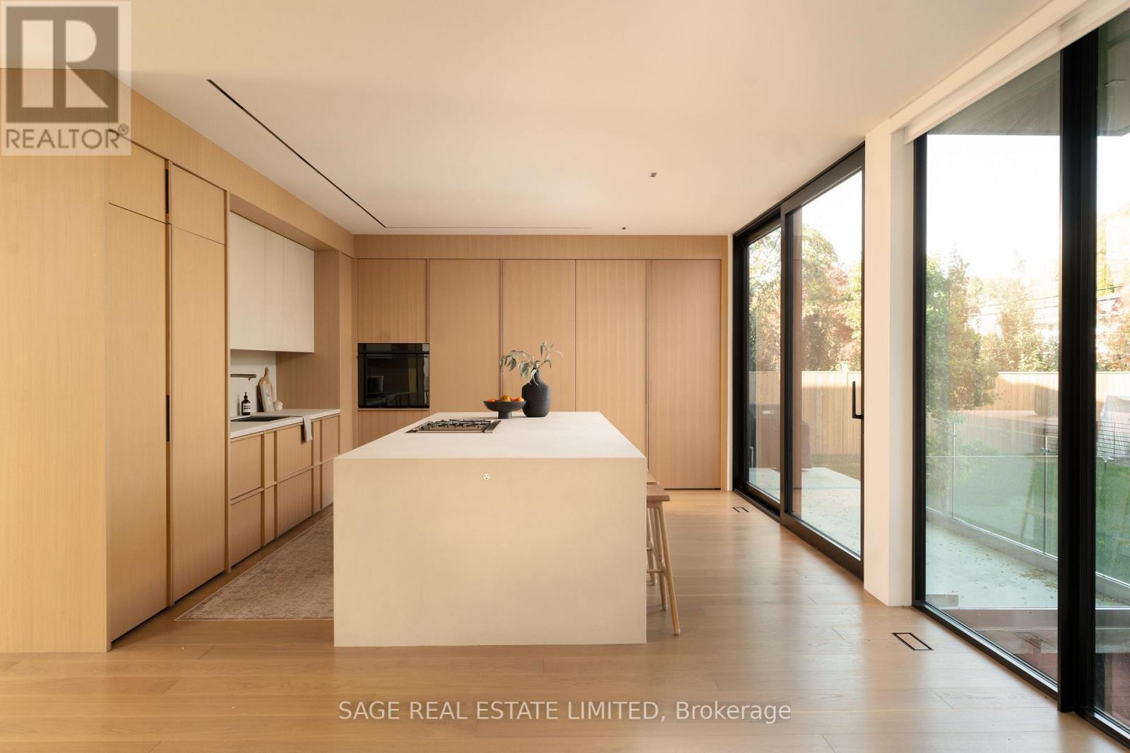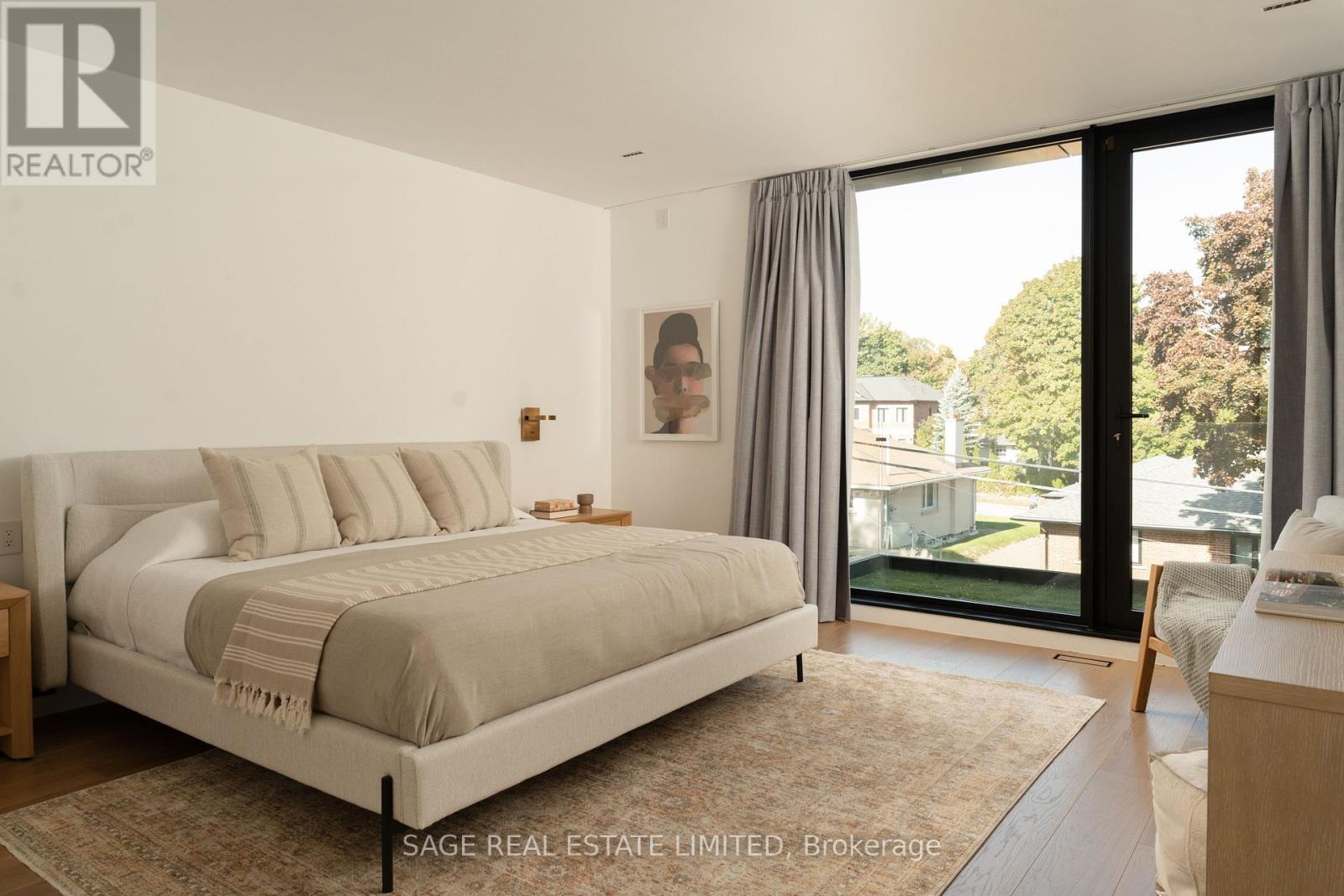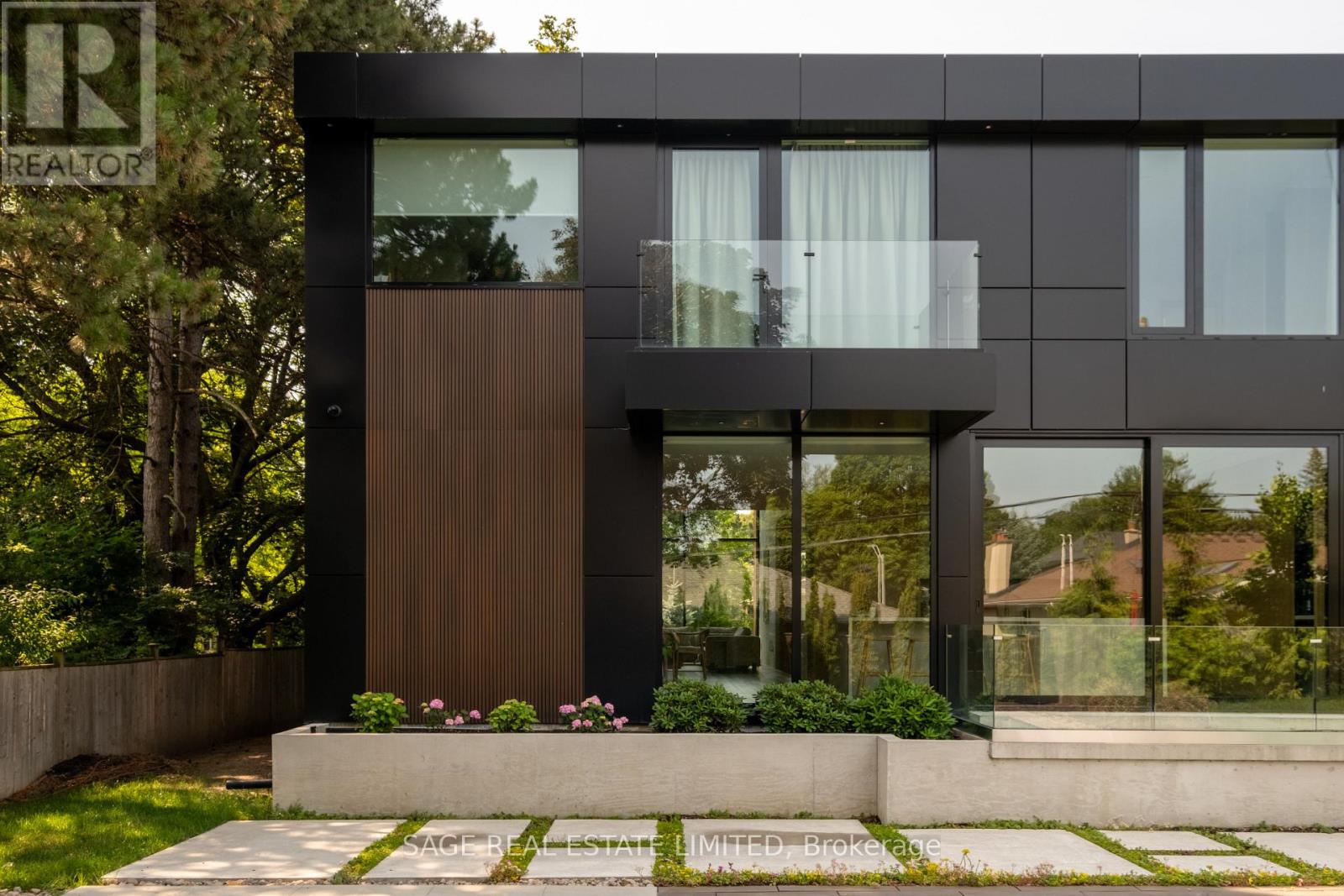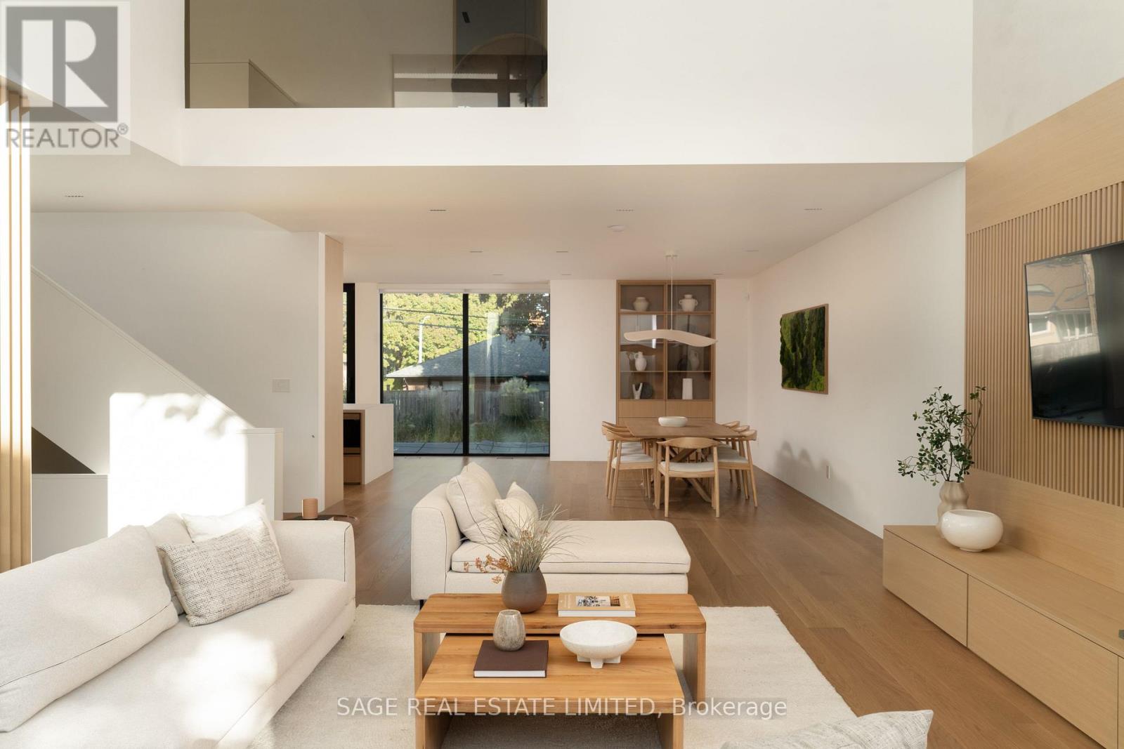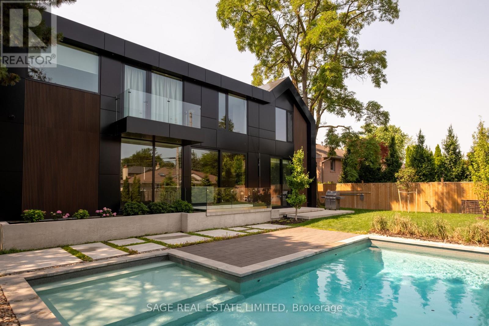 UNDESERVINGLY OVERLOOKED - A gentle fusion of Scandinavian and Japanese design, The Emperor sits proudly in Toronto's charming Princess Anne Manor neighbourhood. This detached custom build is an architectural wonder of the west end with smooth finishes, oak floors and panelling, plunging sight lines and cascading sunlight. Hidden doors reveal themselves at your fingertips to unassuming ensuite bathrooms dressed in creams and stone or covert closets with abundant storage - its invisible lines maintain minimalism at the forefront of its demure design. Dramatic floor-to-ceiling windows rise 21 feet high in the main living, wide open to a generously sized dining room and bright kitchen with an exceptional breakfast island and concealed coffee nook. Fluting and custom millwork anchors the front entrance and frames the tv, complimenting the microcement finished gas fireplace. A constellation of soft lights quietly illuminates the home, a spectacle when the sun goes down, while its tobacco coloured facade stretches across the 76 foot wide lot and leads to an inground saltwater pool at the rear. Beneath century old canopy trees, around slow swooping roads, this one-of-a-kind modern build is two minutes from St George's Golf & Country Club & only ten minutes to Pearson Airport. Over 5000 total square feet, your choice of two primary bedrooms and multiple flex spaces on the top floor with the option to convert them to extra bedrooms - executives, creatives, gamers, podcasters, families and fitness enthusiasts will find limitless potential and a whole new meaning to going home at 38 Ravensbourne. (id:4555)