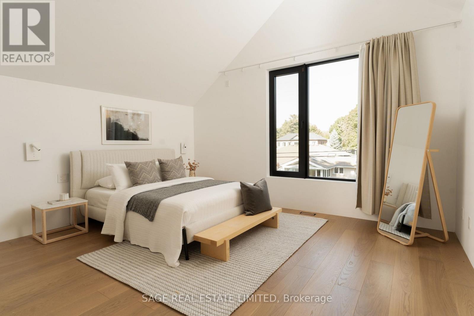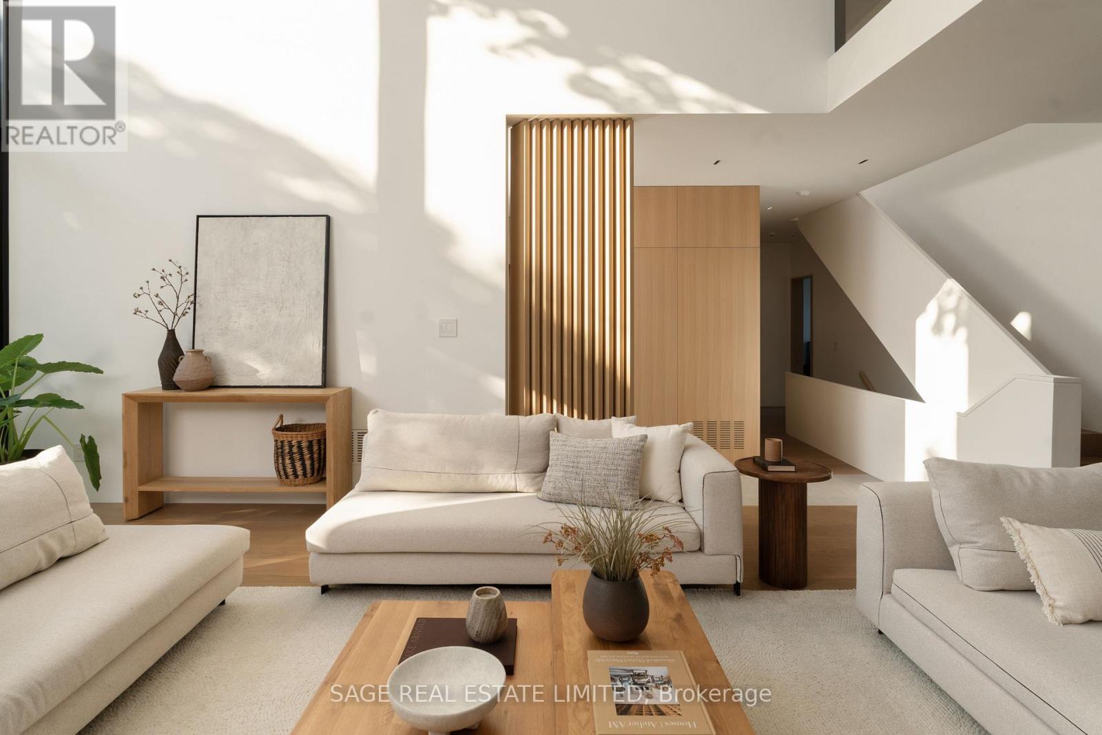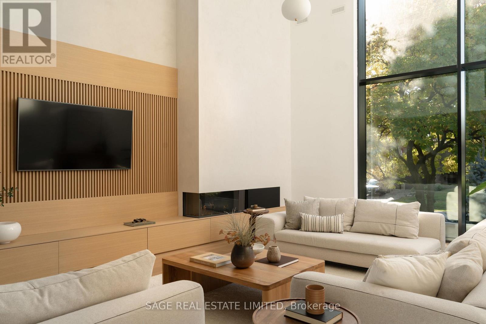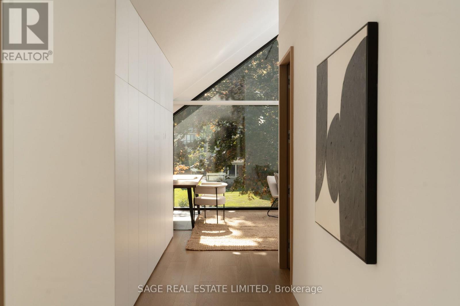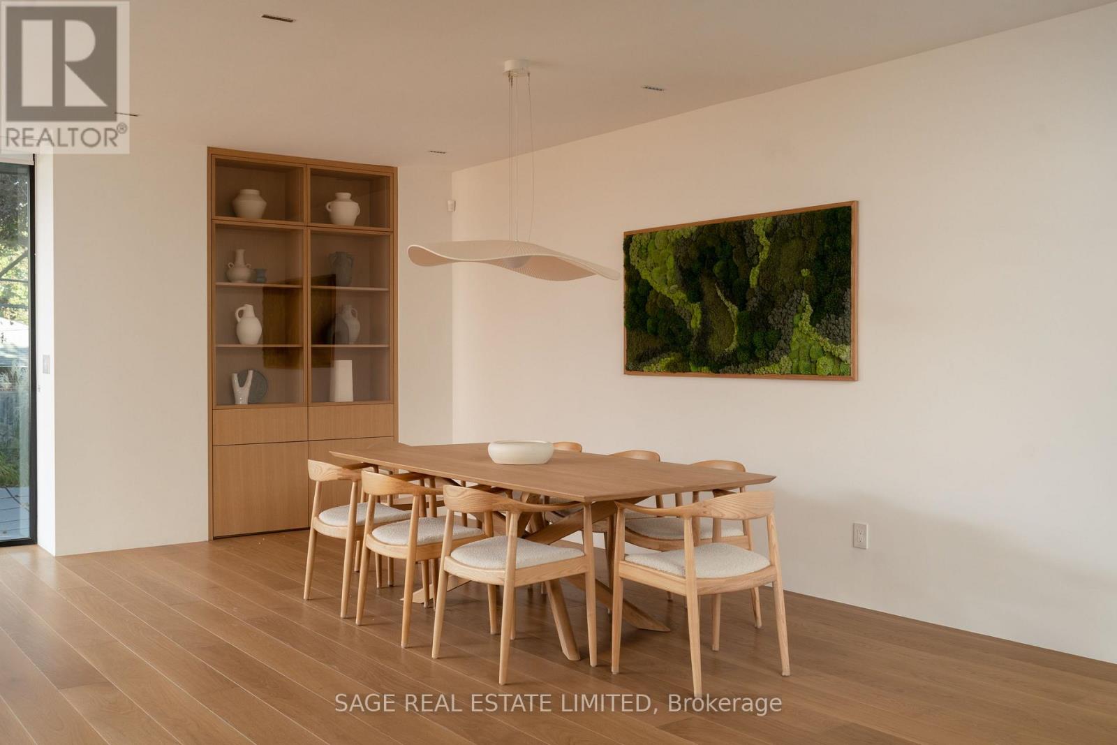 UNDESERVINGLY OVERLOOKED - A gentle fusion of Scandinavian and Japanese design, The Emperor sits proudly in Toronto's charming Princess Anne Manor neighbourhood. This detached custom build is an architectural wonder of the west end with smooth finishes, oak floors and panelling, plunging sight lines and cascading sunlight. Hidden doors reveal themselves at your fingertips to unassuming ensuite bathrooms dressed in creams and stone or covert closets with abundant storage - its invisible lines maintain minimalism at the forefront of its demure design. Dramatic floor-to-ceiling windows rise 21 feet high in the main living, wide open to a generously sized dining room and bright kitchen with an exceptional breakfast island and concealed coffee nook. Fluting and custom millwork anchors the front entrance and frames the tv, complimenting the microcement finished gas fireplace. A constellation of soft lights quietly illuminates the home, a spectacle when the sun goes down, while its tobacco coloured facade stretches across the 76 foot wide lot and leads to an inground saltwater pool at the rear. Beneath century old canopy trees, around slow swooping roads, this one-of-a-kind modern build is two minutes from St George's Golf & Country Club & only ten minutes to Pearson Airport. Over 5000 total square feet, your choice of two primary bedrooms and multiple flex spaces on the top floor with the option to convert them to extra bedrooms - executives, creatives, gamers, podcasters, families and fitness enthusiasts will find limitless potential and a whole new meaning to going home at 38 Ravensbourne. (id:4555)