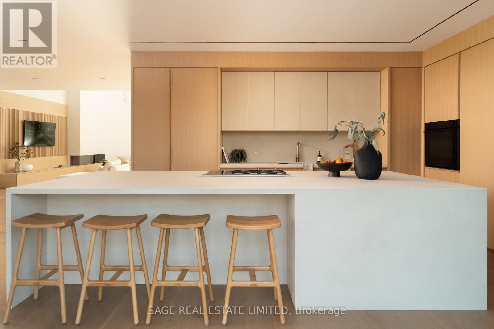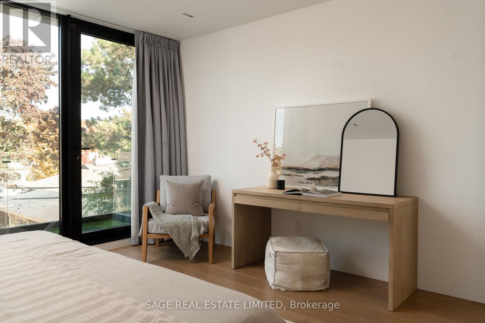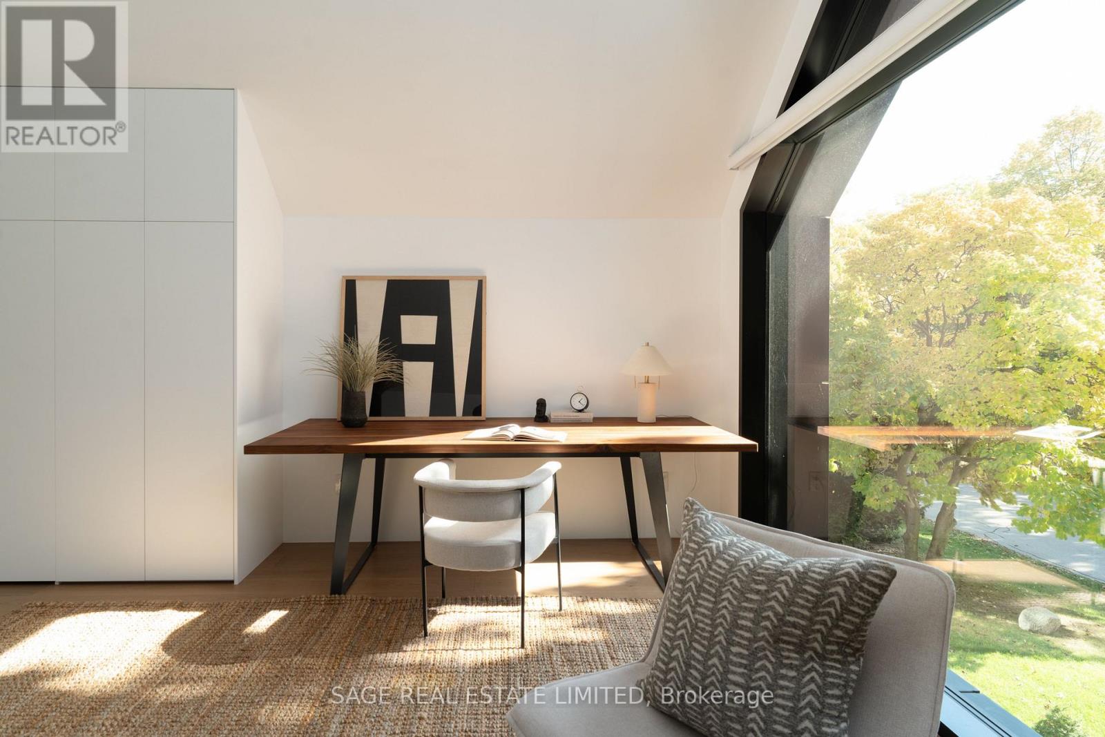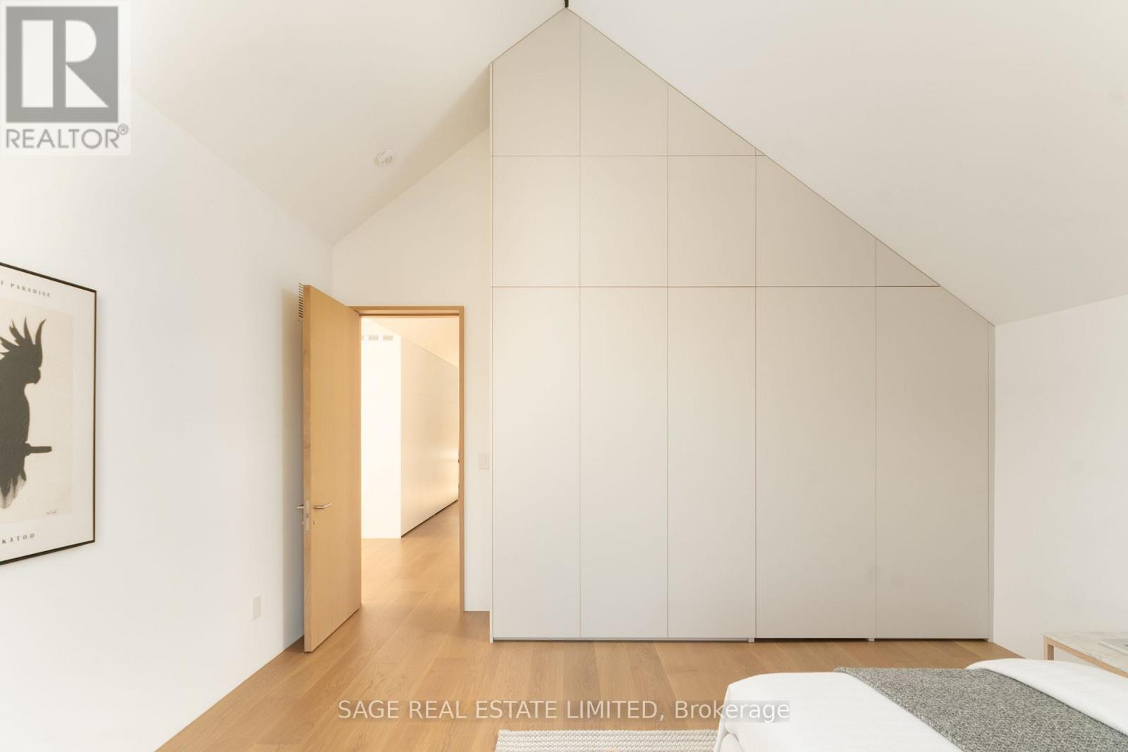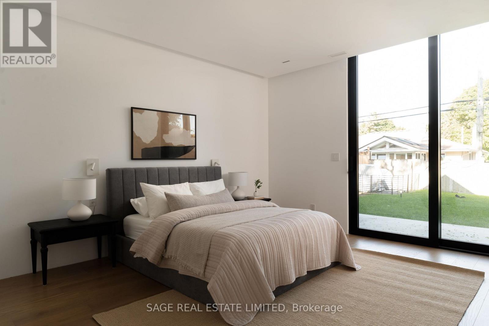 UNDESERVINGLY OVERLOOKED - A gentle fusion of Scandinavian and Japanese design, The Emperor sits proudly in Toronto's charming Princess Anne Manor neighbourhood. This detached custom build is an architectural wonder of the west end with smooth finishes, oak floors and panelling, plunging sight lines and cascading sunlight. Hidden doors reveal themselves at your fingertips to unassuming ensuite bathrooms dressed in creams and stone or covert closets with abundant storage - its invisible lines maintain minimalism at the forefront of its demure design. Dramatic floor-to-ceiling windows rise 21 feet high in the main living, wide open to a generously sized dining room and bright kitchen with an exceptional breakfast island and concealed coffee nook. Fluting and custom millwork anchors the front entrance and frames the tv, complimenting the microcement finished gas fireplace. A constellation of soft lights quietly illuminates the home, a spectacle when the sun goes down, while its tobacco coloured facade stretches across the 76 foot wide lot and leads to an inground saltwater pool at the rear. Beneath century old canopy trees, around slow swooping roads, this one-of-a-kind modern build is two minutes from St George's Golf & Country Club & only ten minutes to Pearson Airport. Over 5000 total square feet, your choice of two primary bedrooms and multiple flex spaces on the top floor with the option to convert them to extra bedrooms - executives, creatives, gamers, podcasters, families and fitness enthusiasts will find limitless potential and a whole new meaning to going home at 38 Ravensbourne. (id:4555)