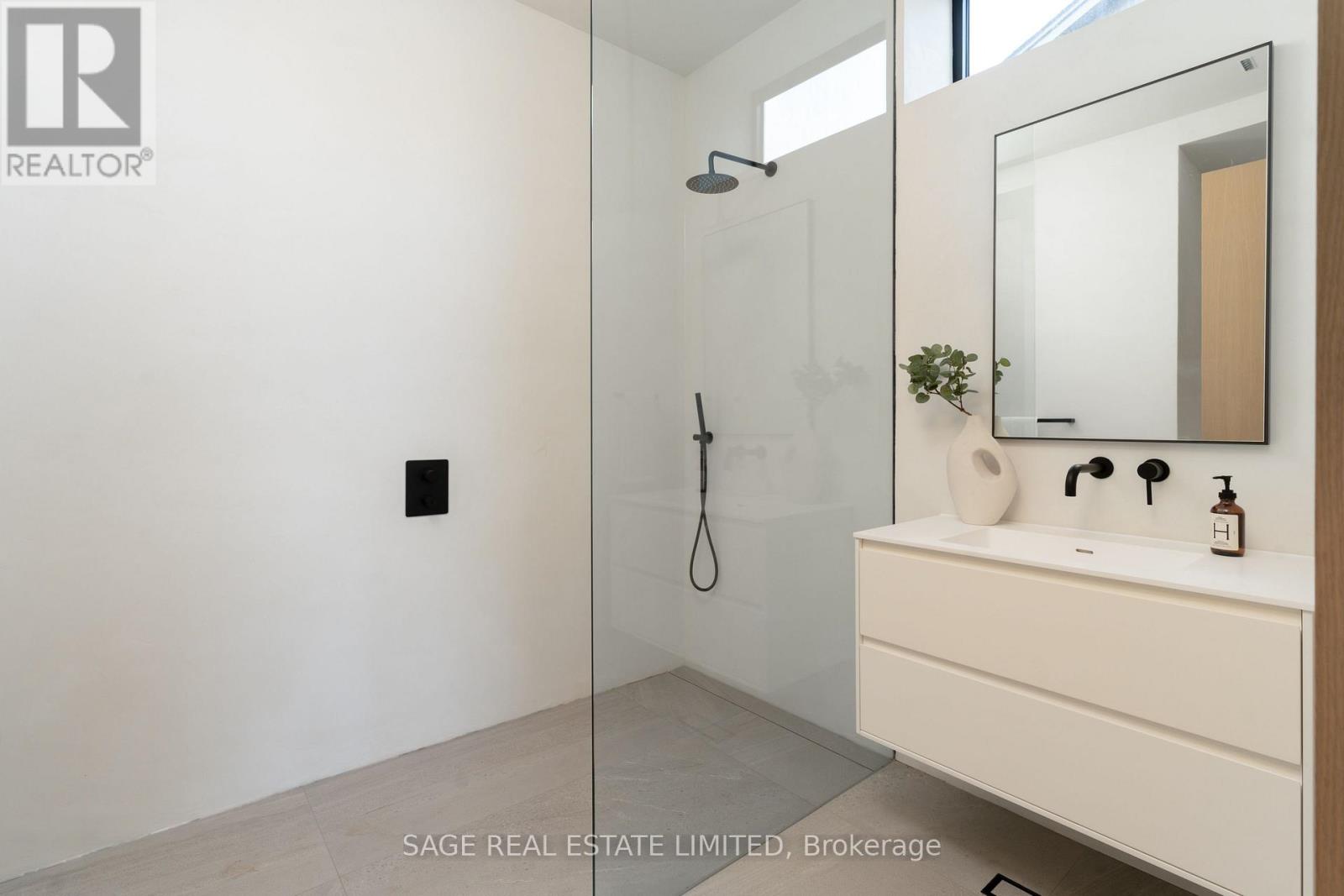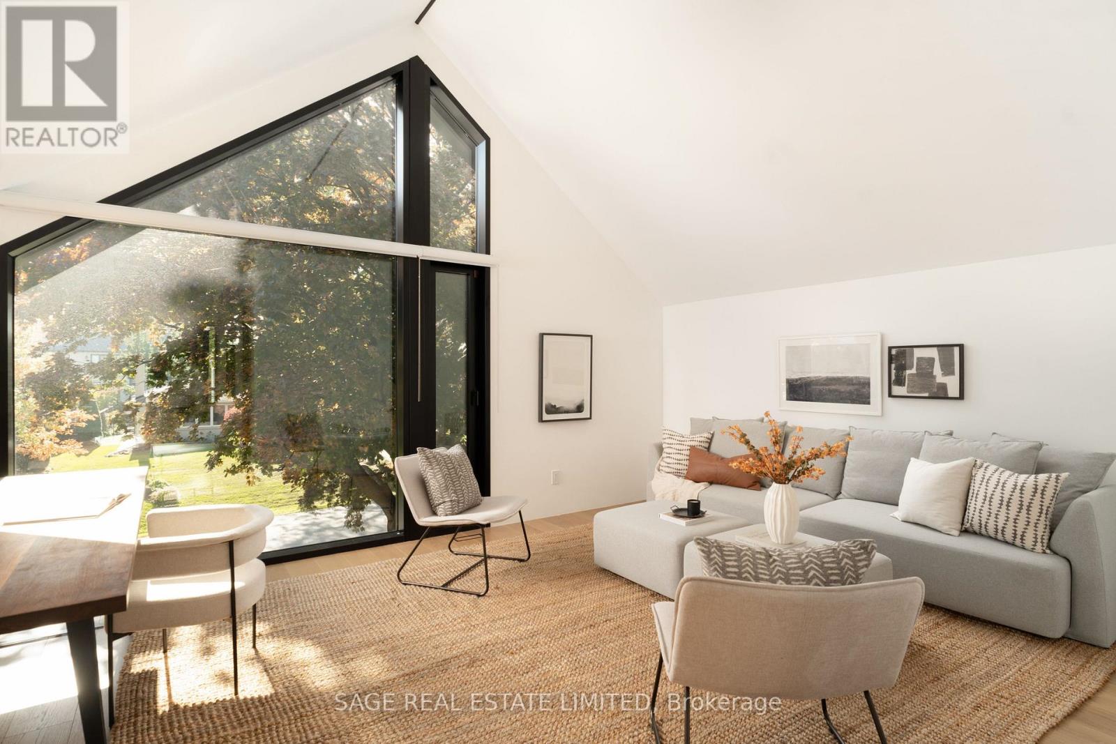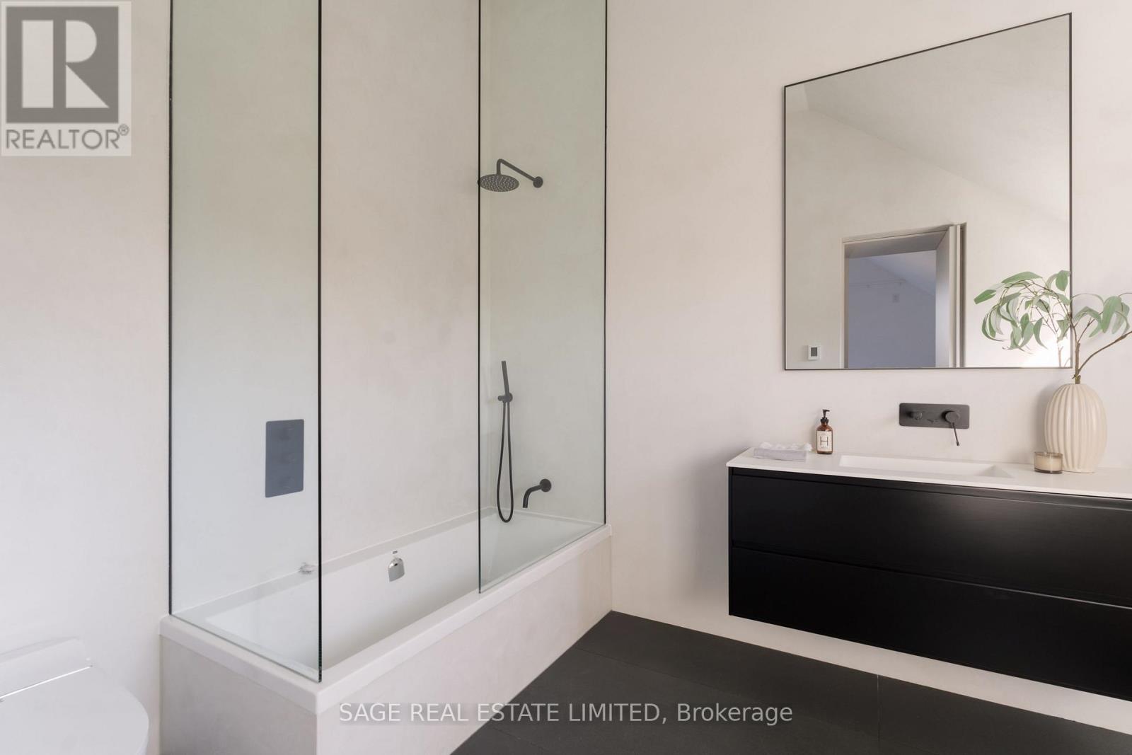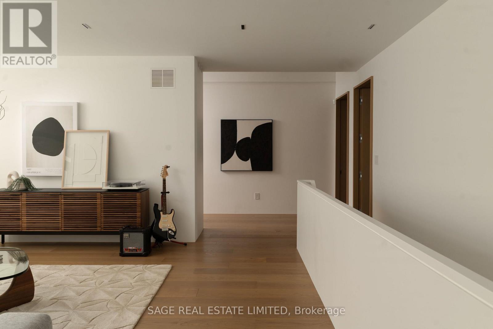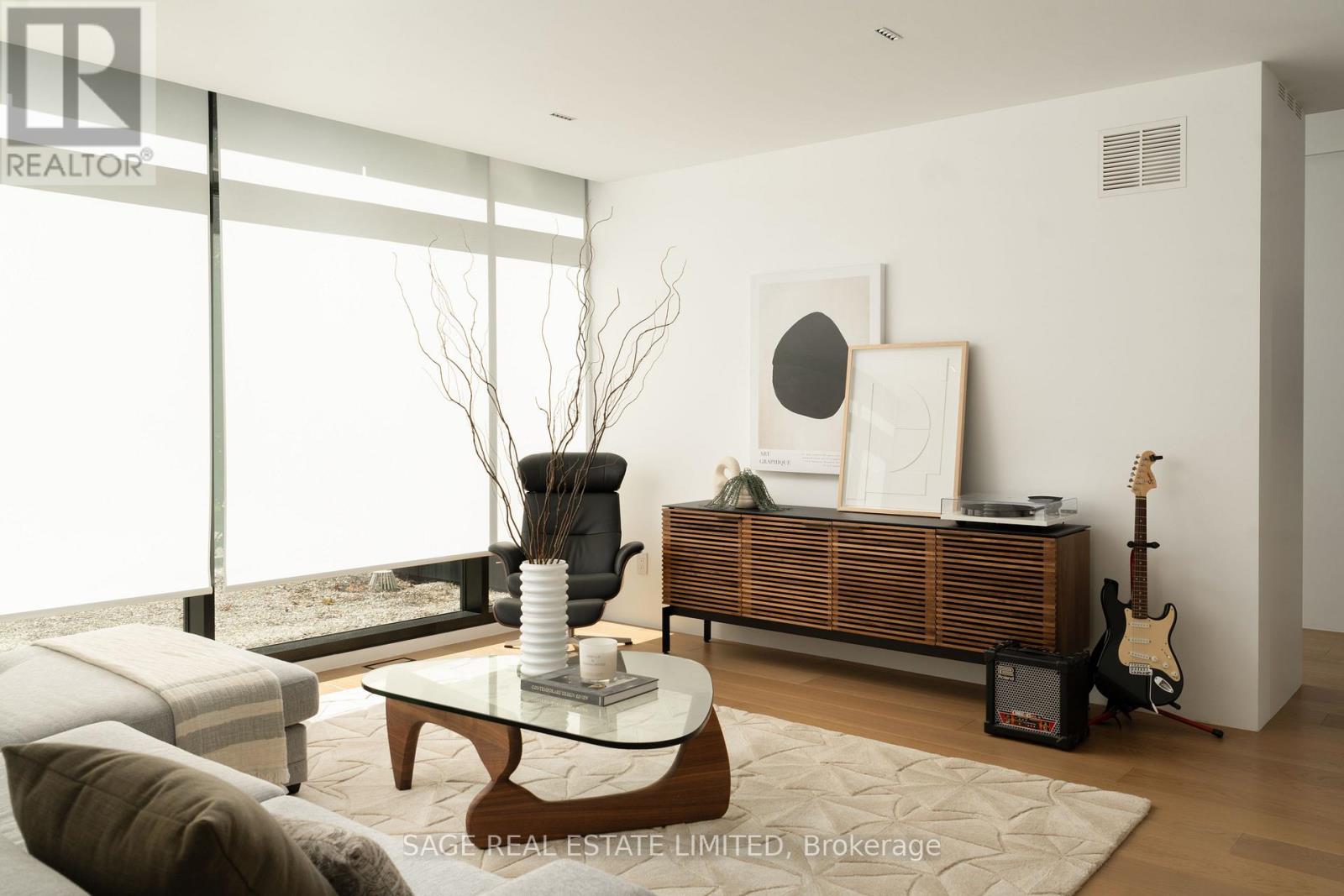 UNDESERVINGLY OVERLOOKED - A gentle fusion of Scandinavian and Japanese design, The Emperor sits proudly in Toronto's charming Princess Anne Manor neighbourhood. This detached custom build is an architectural wonder of the west end with smooth finishes, oak floors and panelling, plunging sight lines and cascading sunlight. Hidden doors reveal themselves at your fingertips to unassuming ensuite bathrooms dressed in creams and stone or covert closets with abundant storage - its invisible lines maintain minimalism at the forefront of its demure design. Dramatic floor-to-ceiling windows rise 21 feet high in the main living, wide open to a generously sized dining room and bright kitchen with an exceptional breakfast island and concealed coffee nook. Fluting and custom millwork anchors the front entrance and frames the tv, complimenting the microcement finished gas fireplace. A constellation of soft lights quietly illuminates the home, a spectacle when the sun goes down, while its tobacco coloured facade stretches across the 76 foot wide lot and leads to an inground saltwater pool at the rear. Beneath century old canopy trees, around slow swooping roads, this one-of-a-kind modern build is two minutes from St George's Golf & Country Club & only ten minutes to Pearson Airport. Over 5000 total square feet, your choice of two primary bedrooms and multiple flex spaces on the top floor with the option to convert them to extra bedrooms - executives, creatives, gamers, podcasters, families and fitness enthusiasts will find limitless potential and a whole new meaning to going home at 38 Ravensbourne. (id:4555)