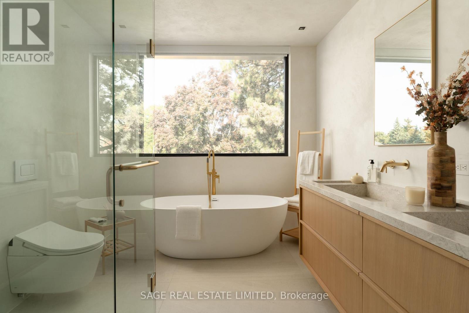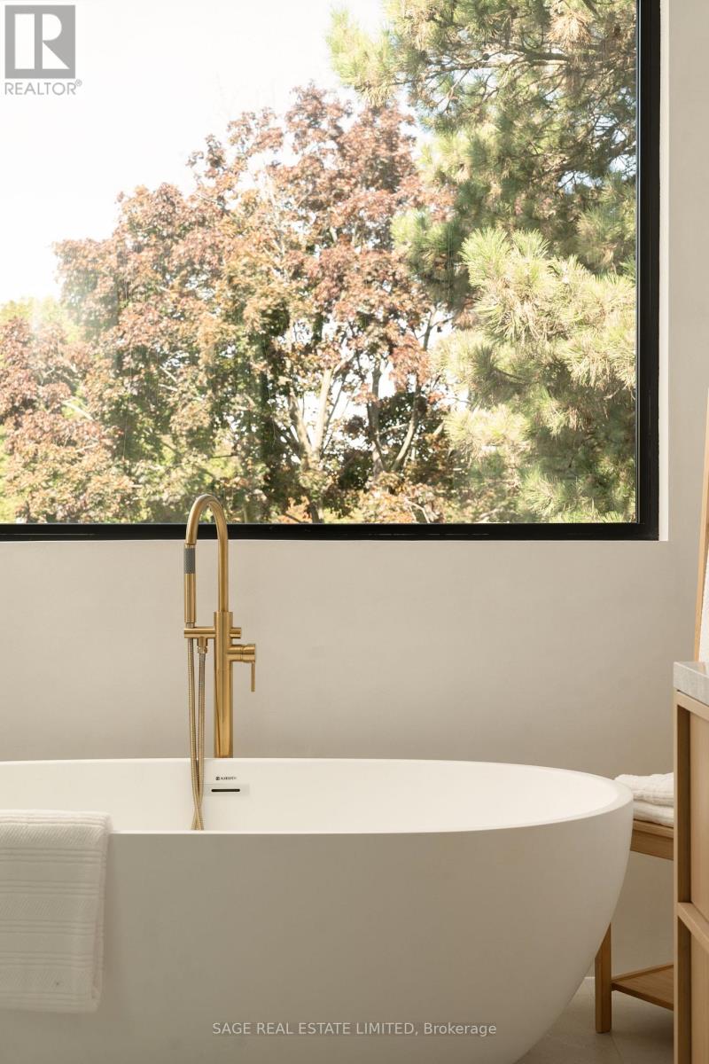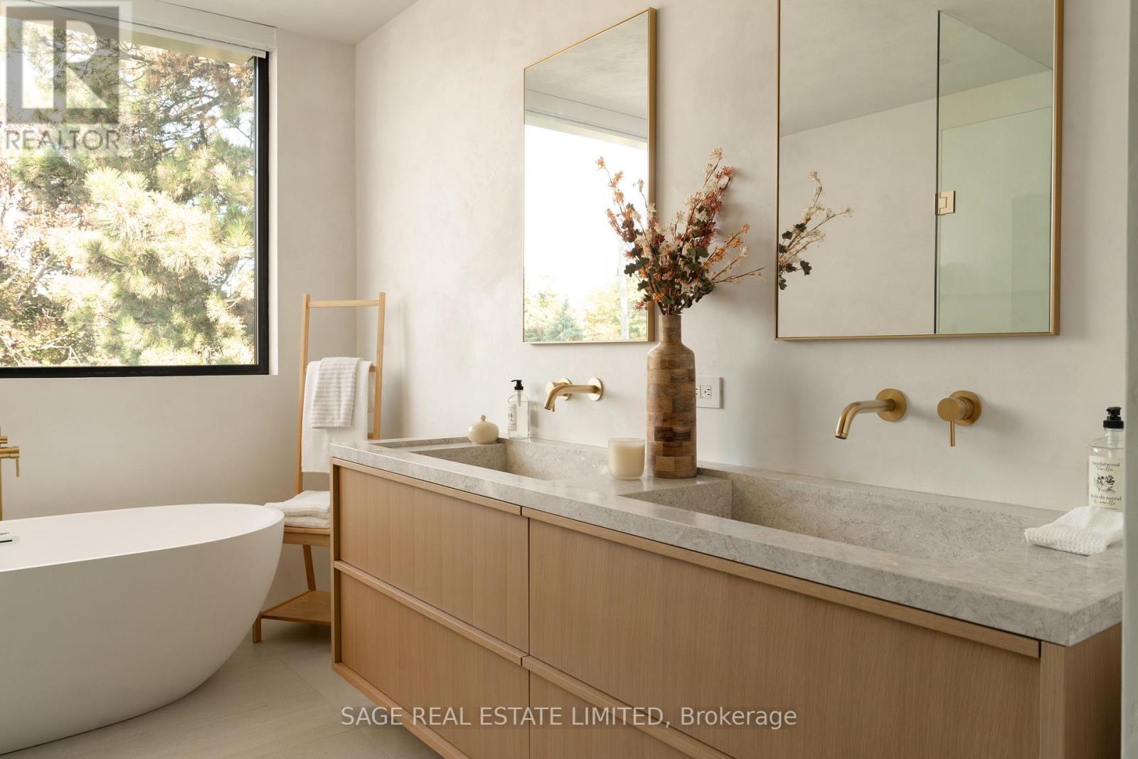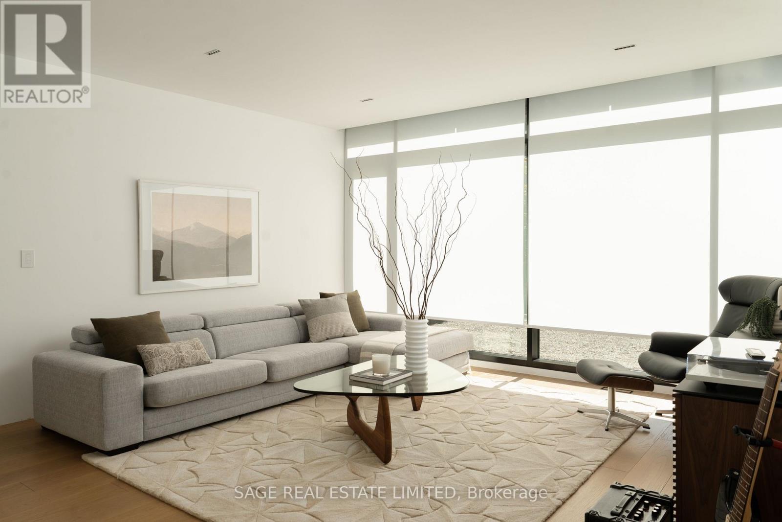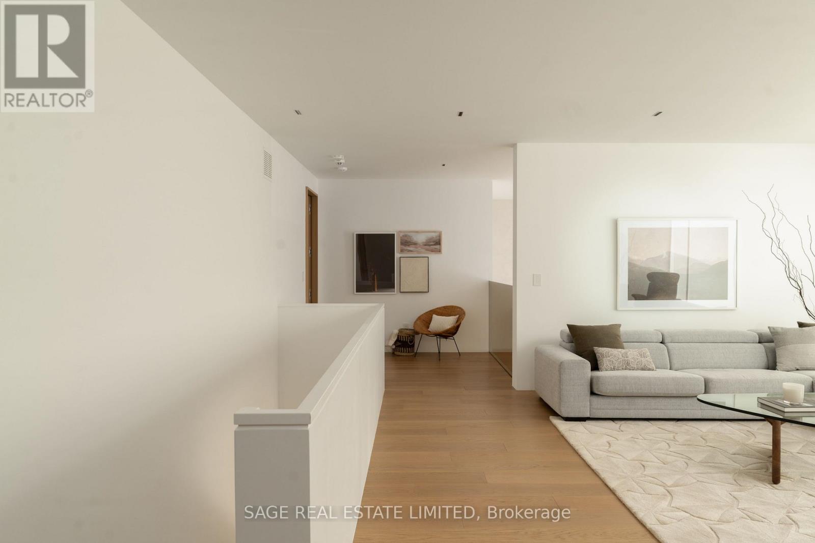 UNDESERVINGLY OVERLOOKED - A gentle fusion of Scandinavian and Japanese design, The Emperor sits proudly in Toronto's charming Princess Anne Manor neighbourhood. This detached custom build is an architectural wonder of the west end with smooth finishes, oak floors and panelling, plunging sight lines and cascading sunlight. Hidden doors reveal themselves at your fingertips to unassuming ensuite bathrooms dressed in creams and stone or covert closets with abundant storage - its invisible lines maintain minimalism at the forefront of its demure design. Dramatic floor-to-ceiling windows rise 21 feet high in the main living, wide open to a generously sized dining room and bright kitchen with an exceptional breakfast island and concealed coffee nook. Fluting and custom millwork anchors the front entrance and frames the tv, complimenting the microcement finished gas fireplace. A constellation of soft lights quietly illuminates the home, a spectacle when the sun goes down, while its tobacco coloured facade stretches across the 76 foot wide lot and leads to an inground saltwater pool at the rear. Beneath century old canopy trees, around slow swooping roads, this one-of-a-kind modern build is two minutes from St George's Golf & Country Club & only ten minutes to Pearson Airport. Over 5000 total square feet, your choice of two primary bedrooms and multiple flex spaces on the top floor with the option to convert them to extra bedrooms - executives, creatives, gamers, podcasters, families and fitness enthusiasts will find limitless potential and a whole new meaning to going home at 38 Ravensbourne. (id:4555)