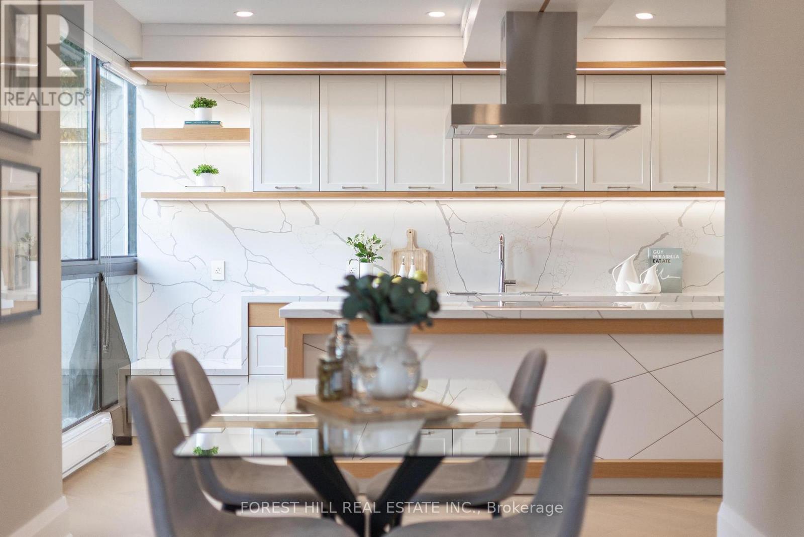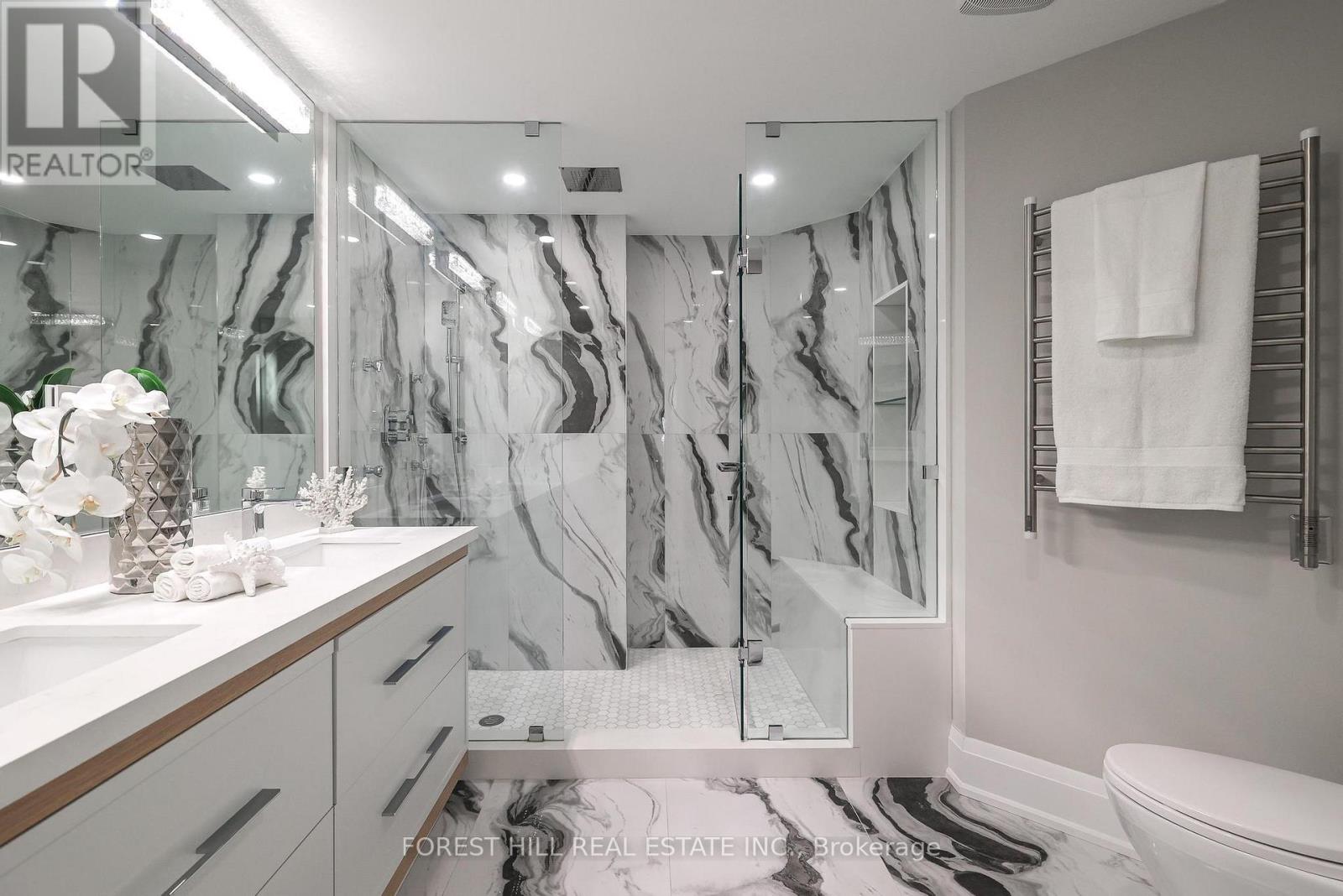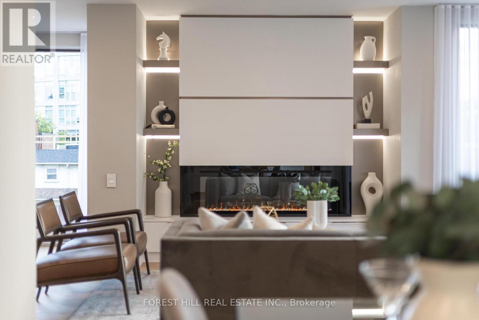 Nestled in a boutique residence of only 20 suites in prestigious Forest Hill Village in this meticulously renovated 1,750 SF corner suite. This turnkey residence showcases 2 spacious bedrooms & 2 bathrooms, boasting bespoke finishes that elevate everyday living. Bathed in natural light, the suite features floor-to-ceiling glass creating a bright and airy atmosphere. The sumptuous light wood floors add a sophisticated touch to every room. A striking fireplace with custom built-ins & integrated lighting, serves as the anchor of the main living space. The thoughtfully designed split floor plan offers a seamless flow ideal for entertaining. The chef's kitchen is equipped with high-end Miele appliances, a stunning quartz center island with overhead hood fan & ample cabinetry. Breathtaking views of the surrounding tree canopy. Retreat to the gracious primary suite, featuring custom built-in cabinetry & a spa-like ensuite, complete with double sinks, a spacious walk-in shower with bench, heated floors & heated towel rack & exquisite finishes that exude opulence. The generous second bedroom is the epitome of comfort & style, while the additional bathroom boasts a luxurious soaker tub, heated floors & towel rack. This impressive suite also includes a full laundry room with sink and extra storage. Completing the package are 2 parking spaces & large locker. Situated just steps away from The Village, Loblaws, boutique shops & fine dining options, as well as Winston Churchill Park & scenic ravines. Public transit is conveniently around the corner. This exceptional residence harmonizes exquisite design with an unbeatable location, setting the stage for an enviable lifestyle in one of Toronto's most sought-after neighbourhoods. (id:4555)