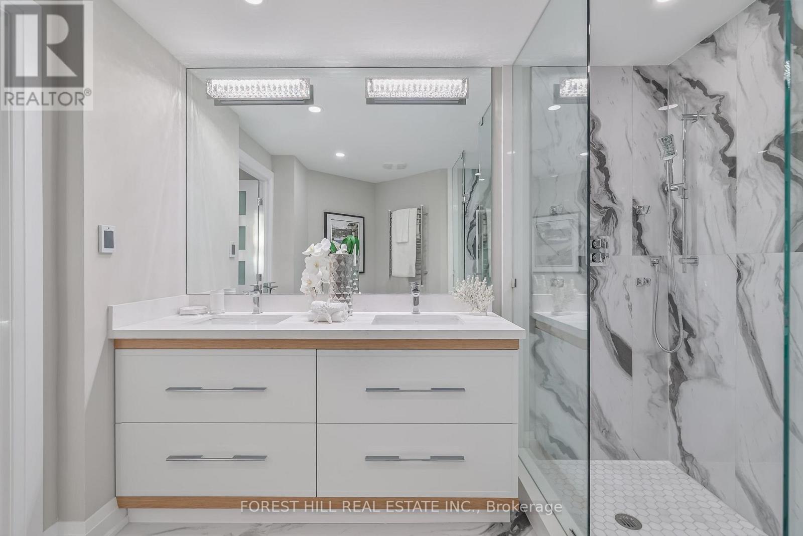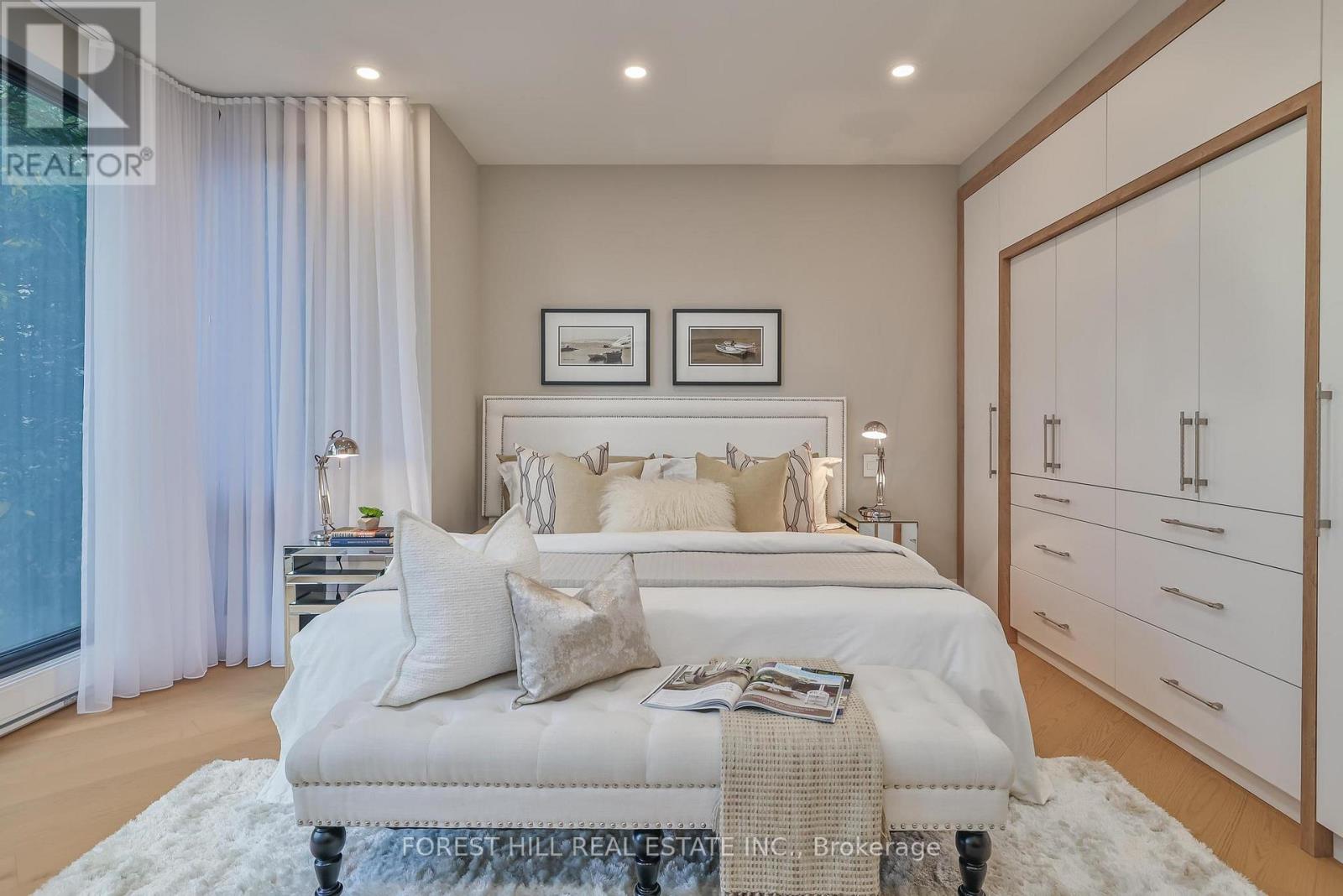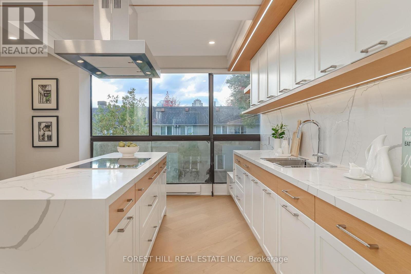 Nestled in a boutique residence of only 20 suites in prestigious Forest Hill Village in this meticulously renovated 1,750 SF corner suite. This turnkey residence showcases 2 spacious bedrooms & 2 bathrooms, boasting bespoke finishes that elevate everyday living. Bathed in natural light, the suite features floor-to-ceiling glass creating a bright and airy atmosphere. The sumptuous light wood floors add a sophisticated touch to every room. A striking fireplace with custom built-ins & integrated lighting, serves as the anchor of the main living space. The thoughtfully designed split floor plan offers a seamless flow ideal for entertaining. The chef's kitchen is equipped with high-end Miele appliances, a stunning quartz center island with overhead hood fan & ample cabinetry. Breathtaking views of the surrounding tree canopy. Retreat to the gracious primary suite, featuring custom built-in cabinetry & a spa-like ensuite, complete with double sinks, a spacious walk-in shower with bench, heated floors & heated towel rack & exquisite finishes that exude opulence. The generous second bedroom is the epitome of comfort & style, while the additional bathroom boasts a luxurious soaker tub, heated floors & towel rack. This impressive suite also includes a full laundry room with sink and extra storage. Completing the package are 2 parking spaces & large locker. Situated just steps away from The Village, Loblaws, boutique shops & fine dining options, as well as Winston Churchill Park & scenic ravines. Public transit is conveniently around the corner. This exceptional residence harmonizes exquisite design with an unbeatable location, setting the stage for an enviable lifestyle in one of Toronto's most sought-after neighbourhoods. (id:4555)