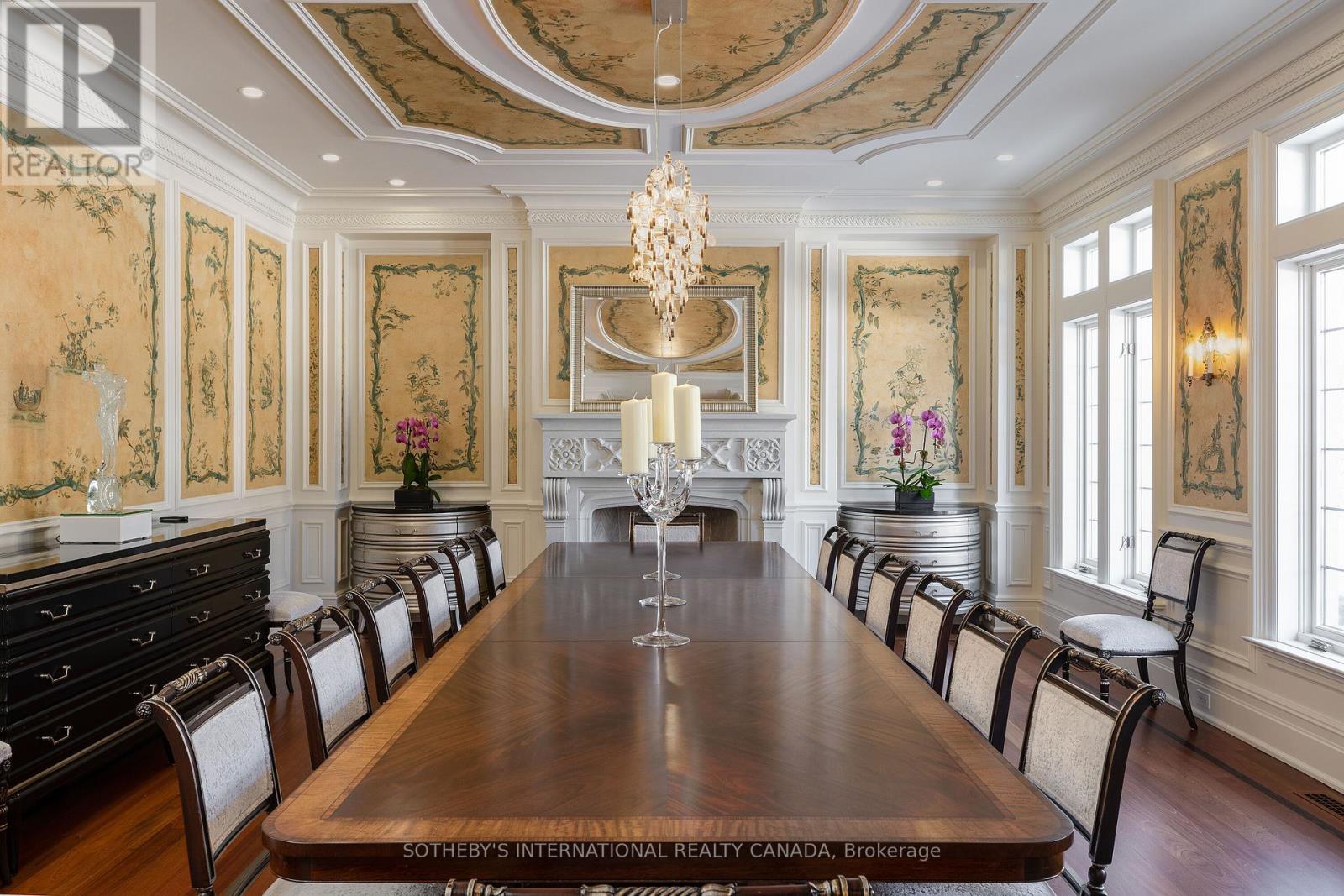 Arguably one of Torontos most iconic estates, this French-style chateau is an extraordinary expression of European grandeur on a 3.12-acre double lot in the prestigious enclave of Bayview Ridge. Designed by renowned architect Gordon Ridgely, the residence commands unobstructed western views over the Rosedale Golf Club. Beyond the stately stone gates and circular drive, manicured gardens by Ron Holbrook frame a breathtaking setting featuring a negative-edge infinity pool, a reflecting pond with a stepped waterfall, tennis court, kitchen gardens, flagstone terraces, and a stone cabana. The striking facade spans nearly 150 feet, clad in Indiana buff limestone and rubble stone with Vermont unfaded green slate shingles and lead-coated copper details. An ivy-clad turret anchors the asymmetrical design, lending the home its signature silhouette. Inside, over 15,000 square feet of living space showcases Brazilian cherry wood floors with African wenge inlay, acid-etched antique Crema Marfil marble, coffered ceilings, Indiana limestone fireplaces, and solid North American cherry doors. Six principal bedrooms and two additional suites are complemented by ten baths and warm, richly detailed interiors. The main floor features an impressive library and office with wood-burning fireplace, a grand dining room with artisan-painted walls and ceilings, a conservatory beside the spacious family room, and a sunlit morning room perfect for coffee. Three staircases, including a hidden passage, lead to the lower level with a Bordeaux-inspired wine cellar, cigar room, gym, nanny suite with two bedrooms, a full kitchen, and a large recreation space. Upstairs, the primary suite offers a six-piece spa bathroom, dual dressing rooms, gas fireplace, and sweeping views. Each bedroom enjoys an ensuite bath and sitting area, blending luxury with practicality. This remarkable estate is a once-in-a-generation offering at once grand, intimate, and built to endure. (id:4555)