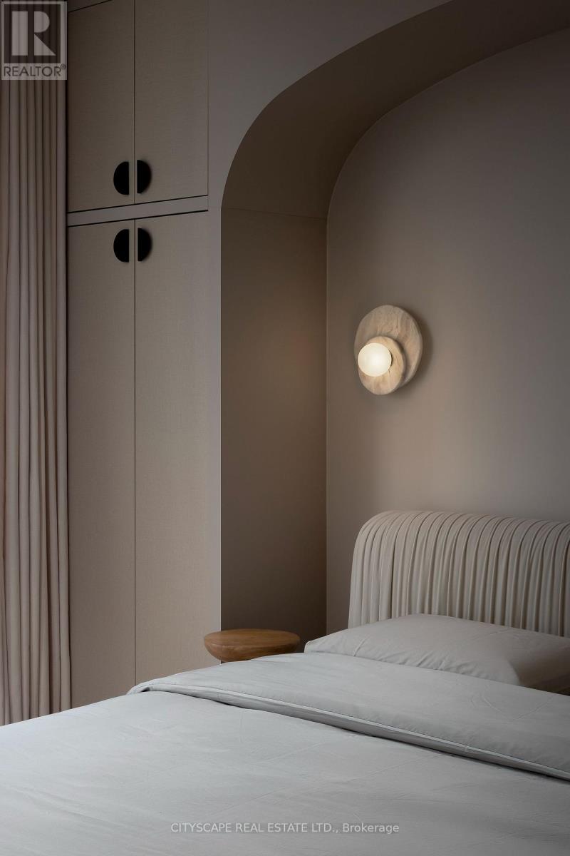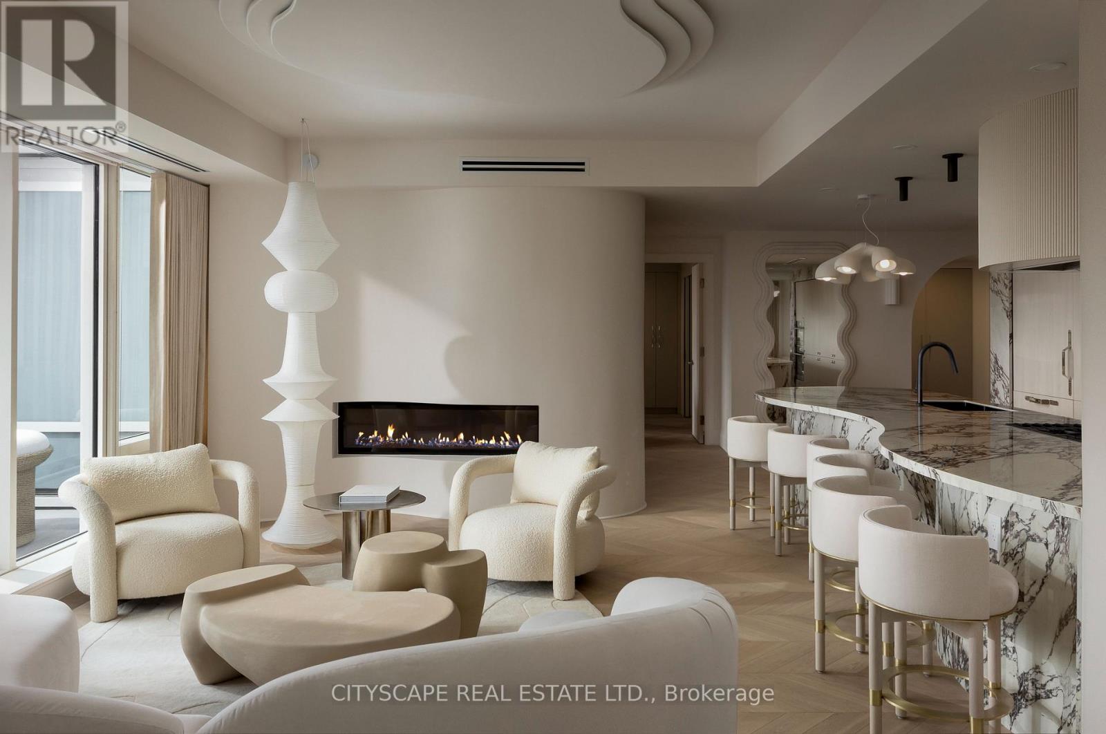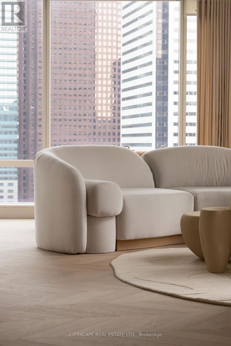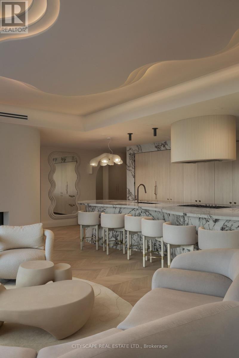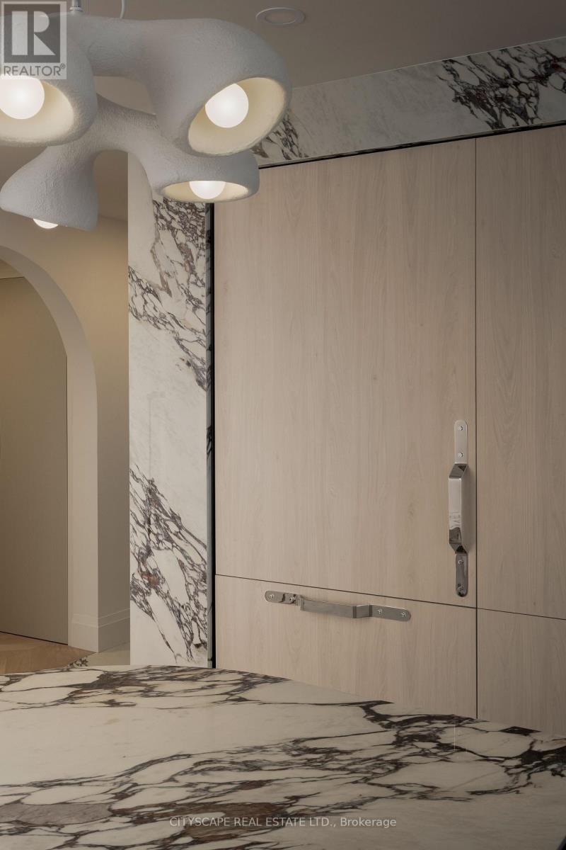 A truly one-of-a-kind Condo Suite at the prestigious Shangri-La Residences Toronto. Spanning over 1,600 sq. ft., this fully reimagined residence has undergone a complete, designer-led transformation, with every finish, fixture, and architectural detail custom crafted exclusively for this suite. The interiors are defined by soft sculptural forms, flowing curves, arched transitions, bespoke millwork, and wide-plank herringbone flooring, creating an exceptional sense of warmth rarely found in condominium living. Expansive floor-to-ceiling windows frame unobstructed panoramic city views while flooding the home with natural light throughout the day. The residence is anchored by a statement Italian Boffi kitchen featuring a dramatic marble waterfall island, integrated high-end appliances, custom lighting, and refined detailing throughout. Each bedroom offers a serene retreat with spa-inspired ensuite bathrooms, while private outdoor spaces with CN Tower and City views further enhance the living experience. A rare opportunity to own a bespoke architectural residence within one of Toronto's most iconic addresses, offering refined five-star living at its absolute finest. (id:4555)