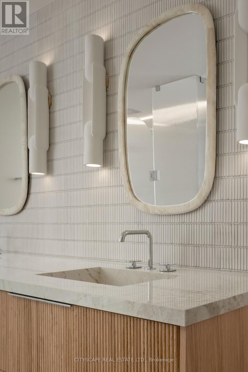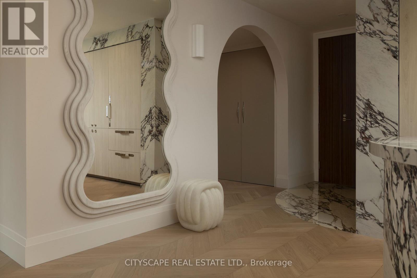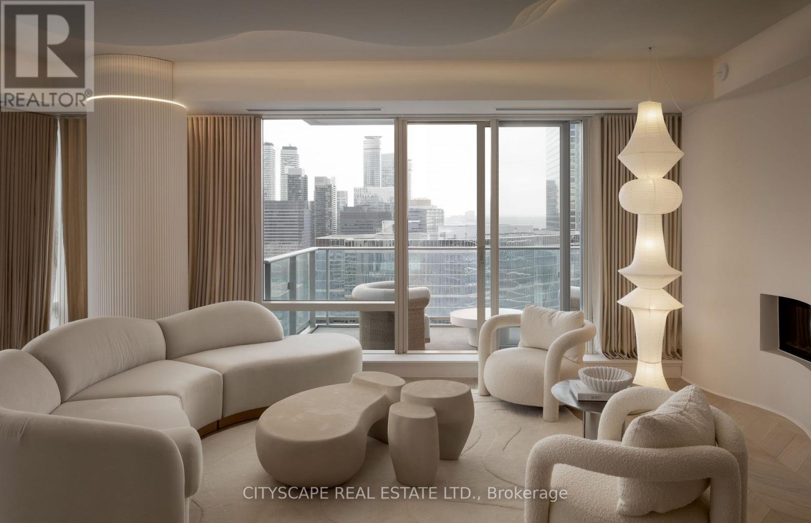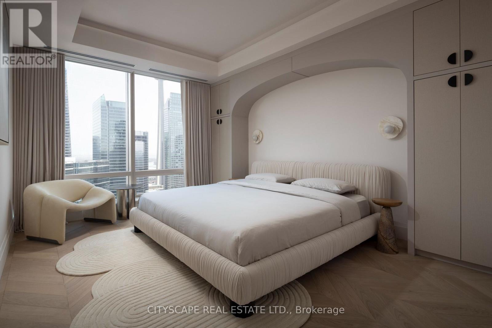 A truly one-of-a-kind Condo Suite at the prestigious Shangri-La Residences Toronto. Spanning over 1,600 sq. ft., this fully reimagined residence has undergone a complete, designer-led transformation, with every finish, fixture, and architectural detail custom crafted exclusively for this suite. The interiors are defined by soft sculptural forms, flowing curves, arched transitions, bespoke millwork, and wide-plank herringbone flooring, creating an exceptional sense of warmth rarely found in condominium living. Expansive floor-to-ceiling windows frame unobstructed panoramic city views while flooding the home with natural light throughout the day. The residence is anchored by a statement Italian Boffi kitchen featuring a dramatic marble waterfall island, integrated high-end appliances, custom lighting, and refined detailing throughout. Each bedroom offers a serene retreat with spa-inspired ensuite bathrooms, while private outdoor spaces with CN Tower and City views further enhance the living experience. A rare opportunity to own a bespoke architectural residence within one of Toronto's most iconic addresses, offering refined five-star living at its absolute finest. (id:4555)