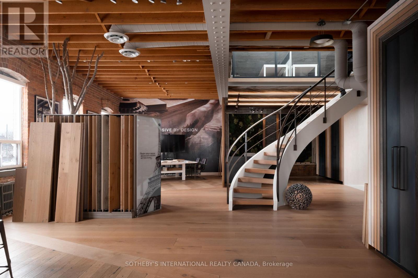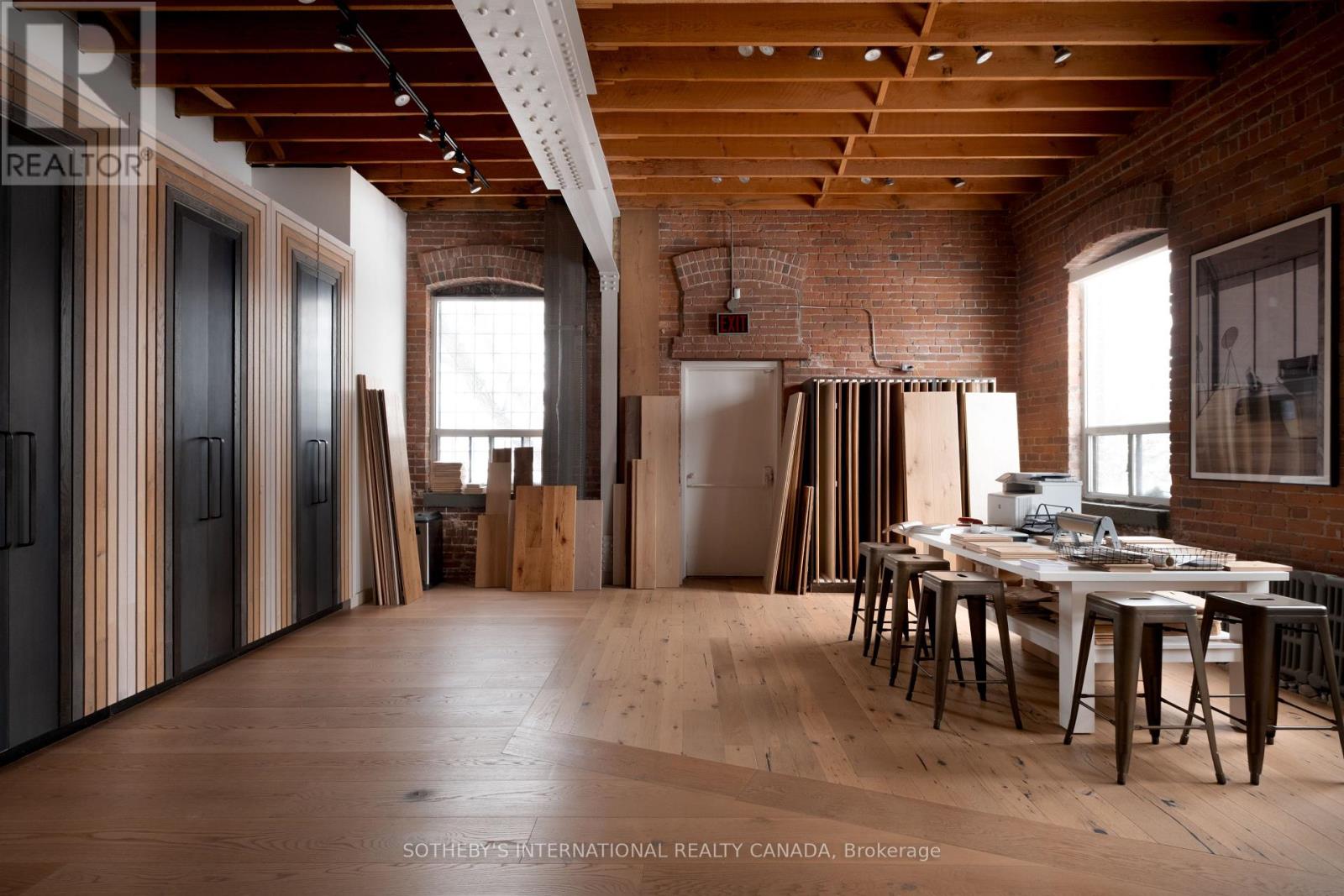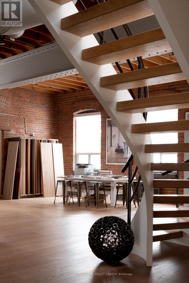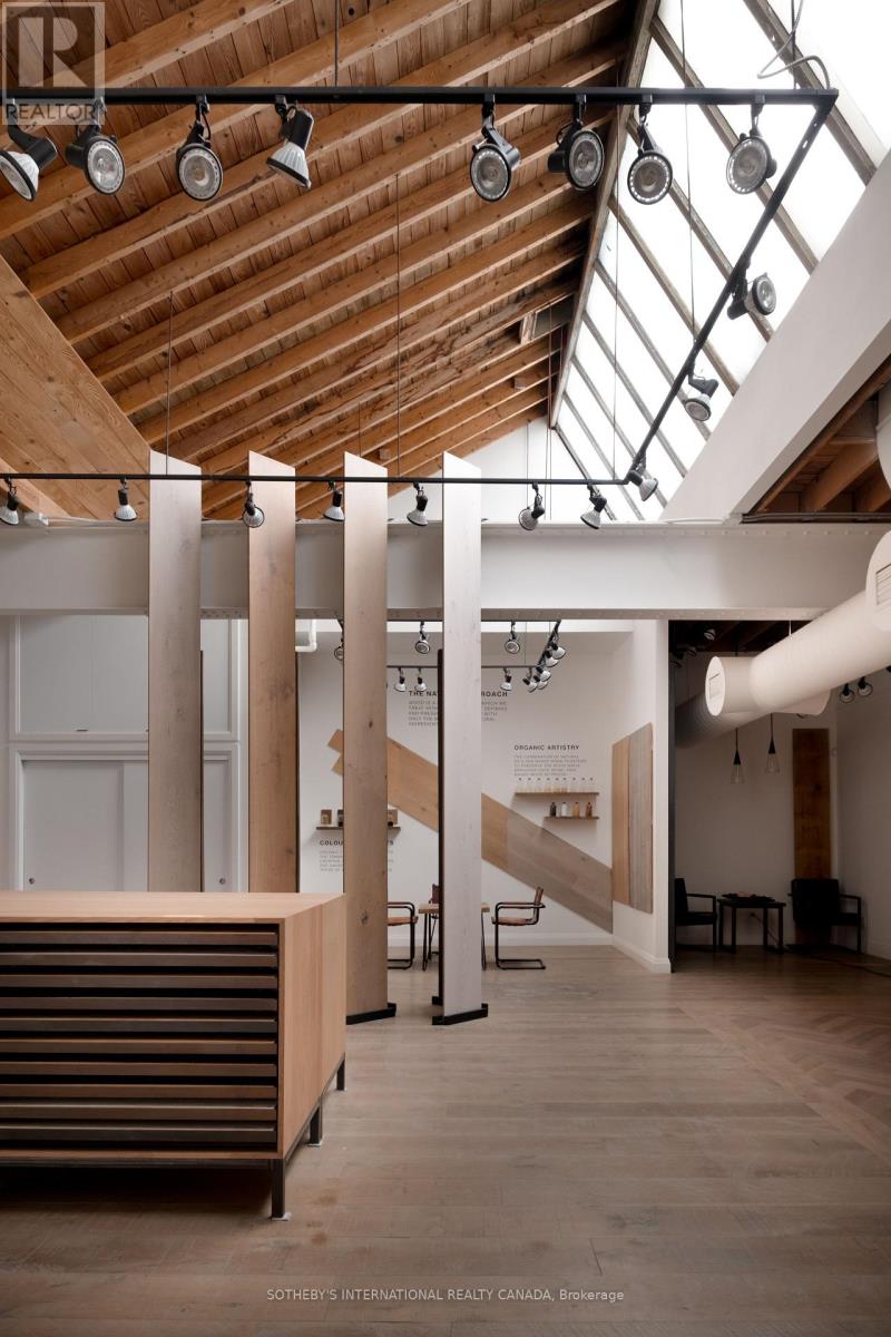 Set within a brick and beam Georgian-style industrial building originally constructed in approximately 1930 as the head office of Purity Flour Mills, 287 Macpherson Avenue is a boutique office building shaped by heritage proportion, material presence and architectural resonance, adapted for contemporary use. Offering approximately 3,301 square feet of distinctive, studio-scale workspace arranged across a main level and mezzanine, Suite 303 is currently configured as a showroom and working studio. Exposed brick, custom wide-plank wood flooring, and a measured interplay between structure and light establish a calm, grounded atmosphere. Large south-facing, industrial-scale windows and overhead skylights bring natural light throughout the space. A sculptural staircase connects the main floor to the mezzanine above, where the pitched roofline, exposed joists and skylight glazing introduce a quieter, more intimate spatial rhythm, while remaining visually connected to the space below. This intimate 271 square foot upper level is ideal as a private office or focused work area. The layout offers adaptability, whether used as an open-format studio, divided into complementary workspaces, or demised to a smaller footprint, while maintaining a cohesive architectural presence throughout. Defined by volume, materiality, and intent, this space is well-suited to design-led practices, architecture and interiors firms, material or product showrooms, and principal-led offices for practices that see workspace as an integral reflection of how they operate and engage clients. (id:4555)