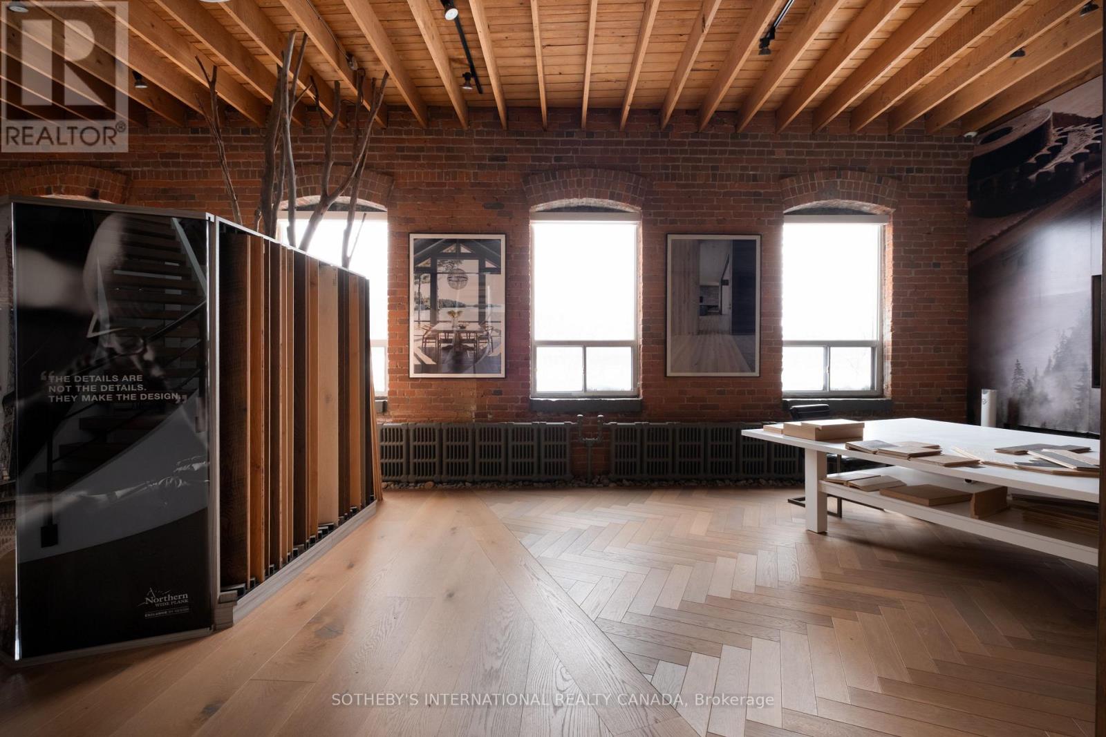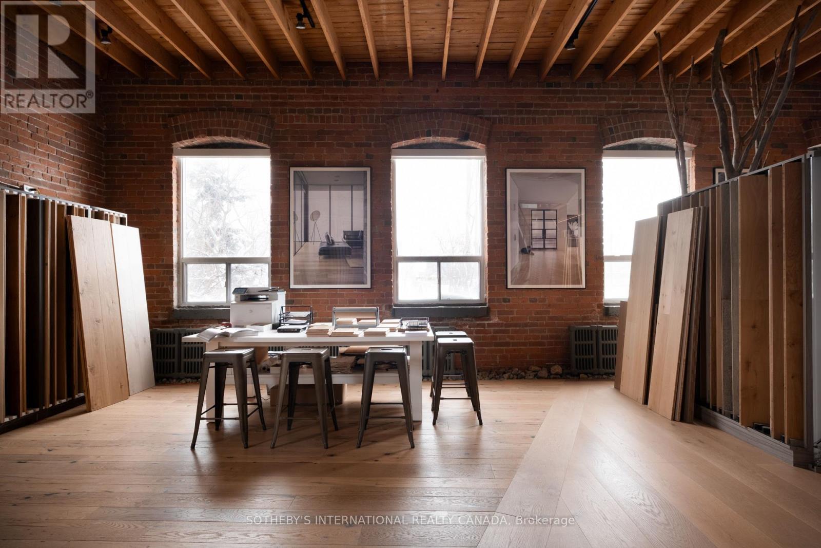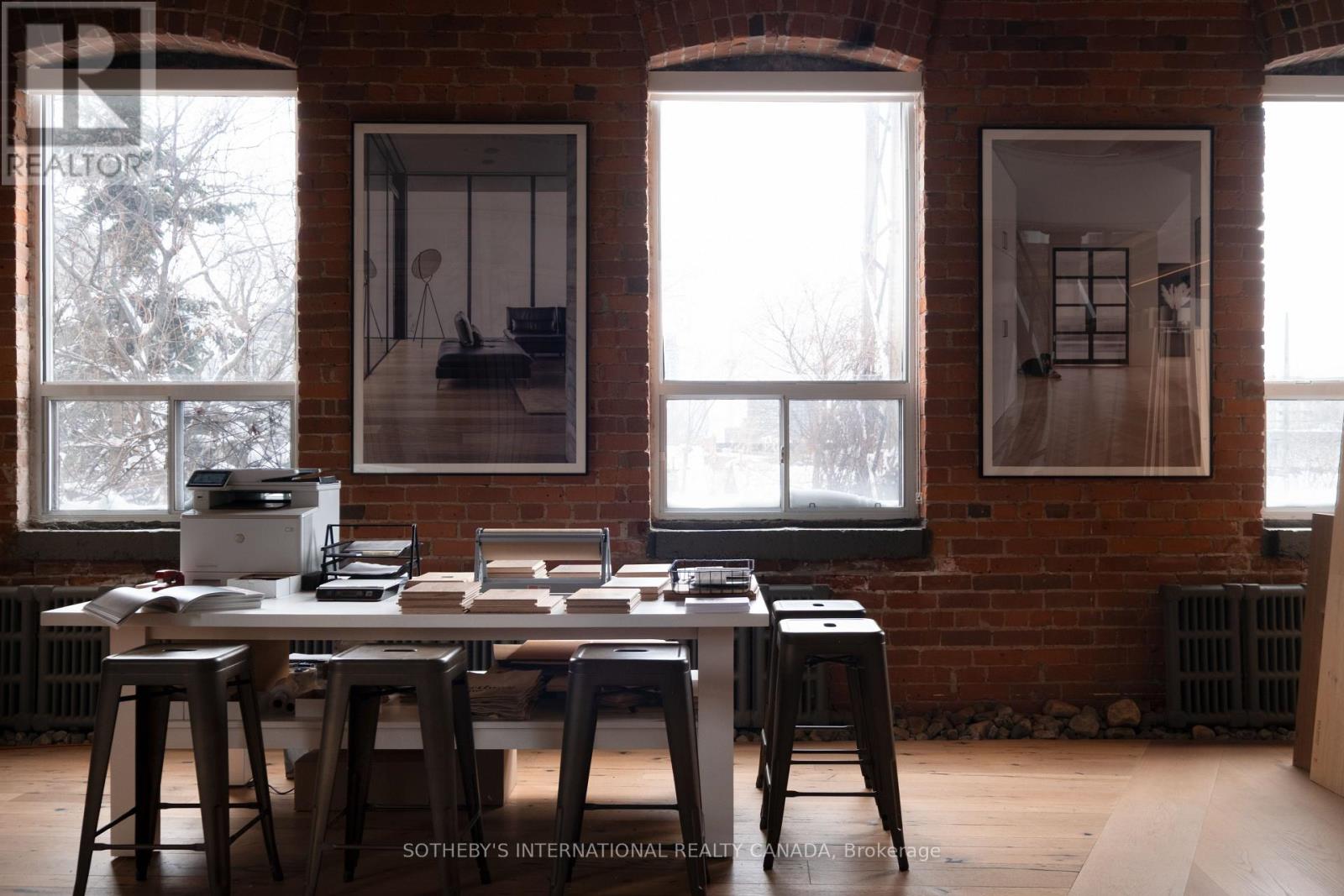 Set within a post and beam Georgian-style industrial building originally constructed approximately 1930 as the head office of Purity Flour Mills, 287 Macpherson Avenue is a boutique office building shaped by heritage proportion, material presence, and architectural resonance, adapted for contemporary use. Suite 304 comprises a defined portion of the upper level, conceived as a self-contained studio environment organized around a sculptural spiral staircase and mezzanine. This space captures the most vertically expressive elements of the floor, offering a distinctive workspace defined by volume, light, and layered spatial experience across 2,143 square feet (approximately). The main level functions as an open plan working studio and office, grounded by exposed brick, custom wide-plank wood flooring, and a refined interplay between structure and light. Large industrial-scale south facing windows bring natural light into the space, while the staircase anchors the layout both functionally and visually. Above, the approximately 271 square foot mezzanine introduces a quieter counterpoint. Framed by the pitched roofline, exposed joists, and glazed skylights, this upper level is ideal for focused work, a private office, or an intimate meeting space, while remaining visually connected to the studio below. The result is a workspace that feels open yet deliberate, with a natural sense of flow between levels. This suite offers an intimate yet architecturally rich environment that's well suited to design-led practices, architecture and interiors firms, or principal-led offices seeking a studio that balances presence with privacy. The space functions as a complete working environment, where material, and proportion shape both daily use and client experience. (id:4555)