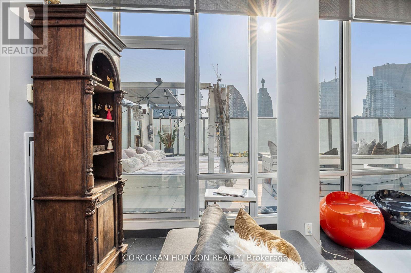 Boasting nearly 2,000 sq. ft. of total living space-with 1,300 sq. ft. indoors and a 600 sq. ft. terrace that blends seamlessly with the main level-this two-storey loft penthouse offers a rare, flowing layout perfect for year-round entertaining and effortless indoor-outdoor living.Welcome to a residence that redefines luxury: a truly one-of-a-kind penthouse and the only suite in the building featuring three skylights, infusing both levels with uninterrupted natural light. With 10-foot ceilings and floor-to-ceiling windows, every room frames dramatic, unobstructed views of the city, lake, and CN Tower, easily one of the very best views downtown. Every detail has been meticulously customized-from the sculptural staircase to the bespoke window treatments and abundant integrated storage-creating a home that is equally refined and functional. The chef-inspired kitchen is outfitted with Wolf and Sub-Zero appliances, designed to elevate everyday living and exceptional hosting.Step onto the expansive terrace, fully equipped with a water line and gas BBQ connection, and experience a true entertainer's haven. From elegant dinner parties to Sunday brunch to quiet nights under the stars, the outdoor space becomes an extension of your lifestyle.Whether it's morning coffee beneath the skylights or evening cocktails against breathtaking city views, this residence transforms the ordinary into the extraordinary. With chic design, rare exclusivity, and unmatched vistas, this 2-bedroom, 3-bathroom penthouse is more than a home-it's a statement of elevated living high above the city. (id:4555)
