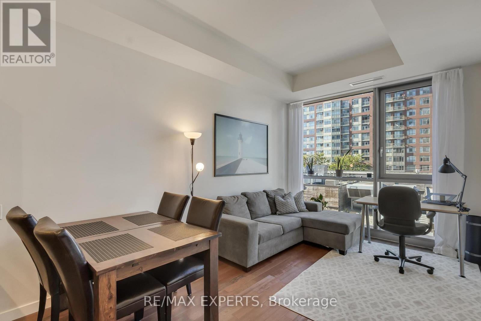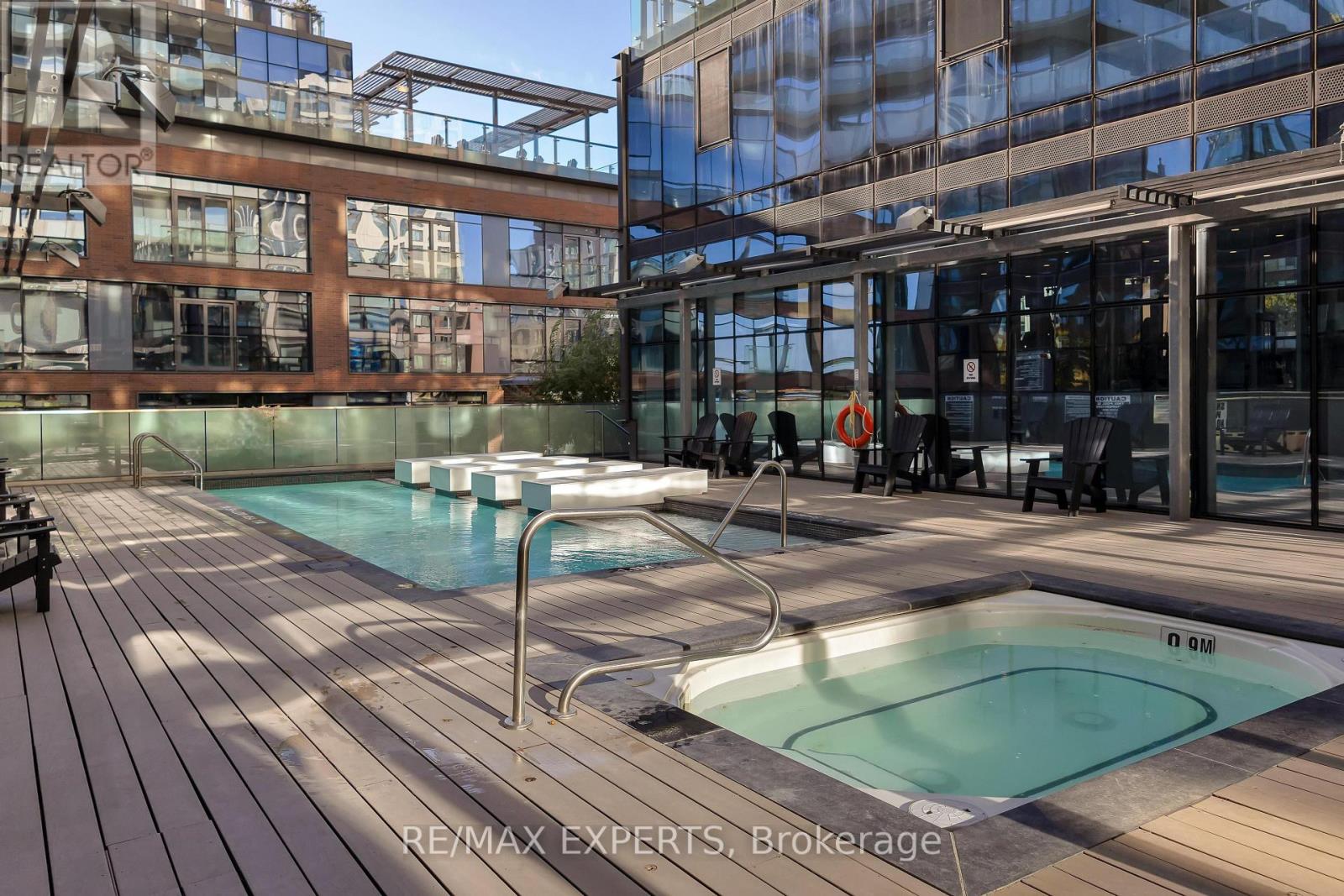 Live in the heart of Toronto's Historic Distillery District at The Gooderham. This bright, open-concept 1+1 bedroom suite (approx. 595 sq.ft.) features engineered hardwood throughout, floor-to-ceiling windows, and a fantastic distillery view. The functional layout offers seamless living/entertaining, with a versatile den and laundry. Parking and locker included. Lifestyle on your doorstep: cobble stone streets lined with cafes, boutiques, galleries, theatres and year-round cultural events. Walk to st. Lawrence Market, and in just minutes you can be at Cherry Beach for sunrise walks or weekend downtime. Transit, bike lanes, waterfront trails and quick access to the DVP/Gardiner make commuting simple. A compelling opportunity to own in one of the city's most iconic, pedestrian-friendly neighbourhoods. Residents enjoy a full amenity roster: concierge, exercise room, media room, outdoor pool, recreation/partyspaces and sauna. Investor friendly: currently tenant-occupied at $2, 370/mo with the lease inplace until Jan 26, 2026; the tenant is willing to stay. (id:4555)