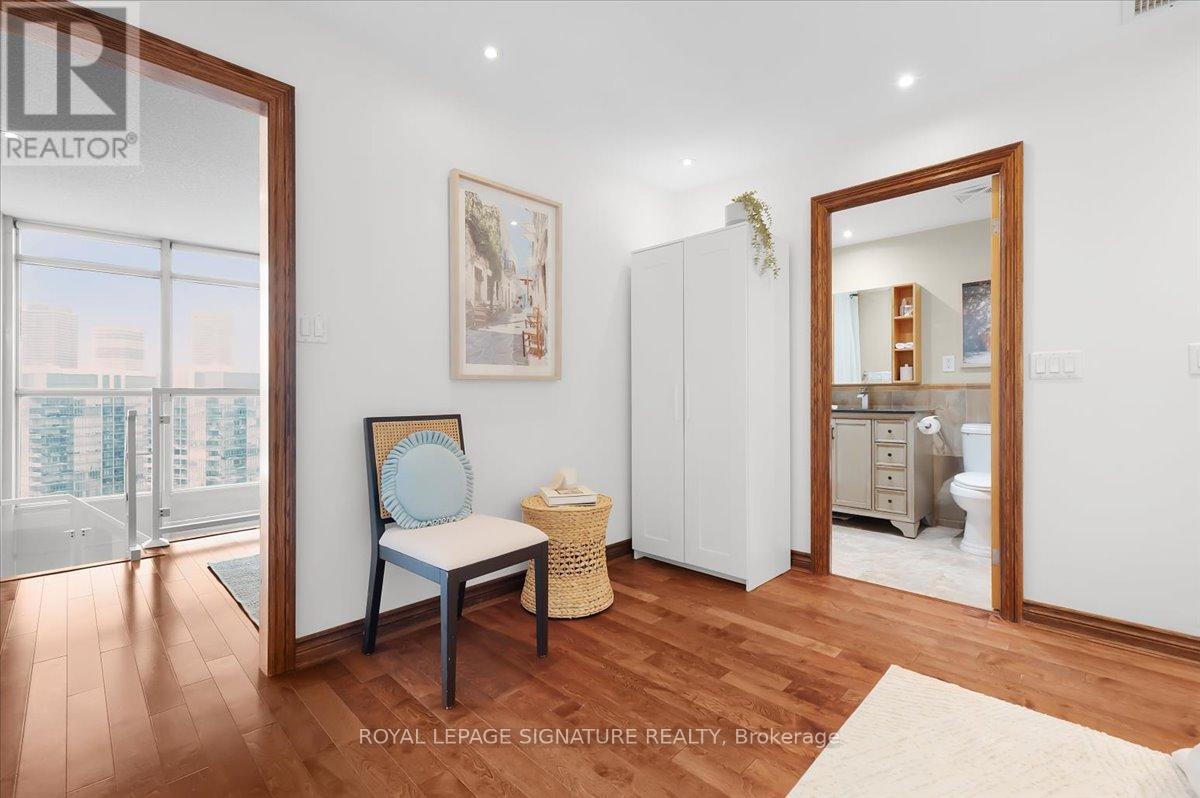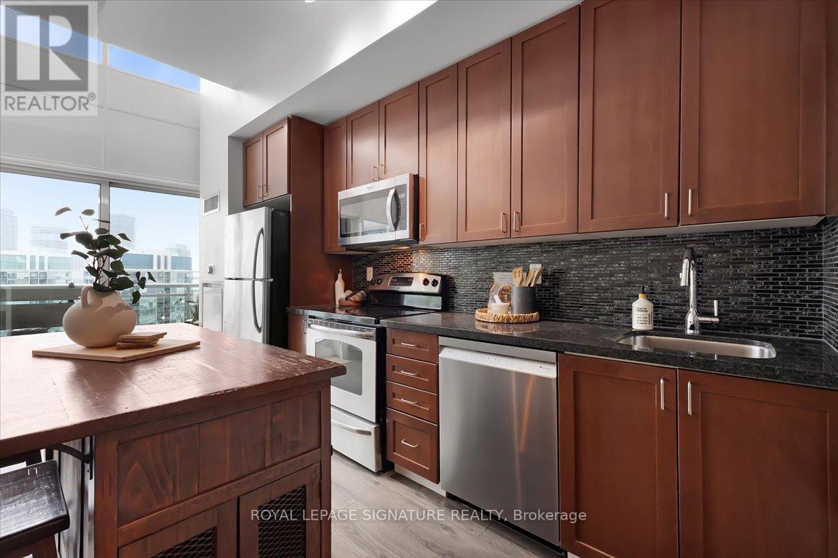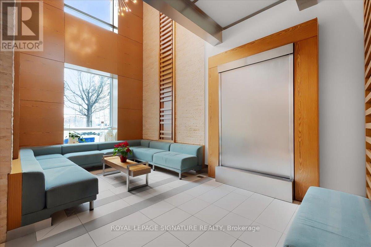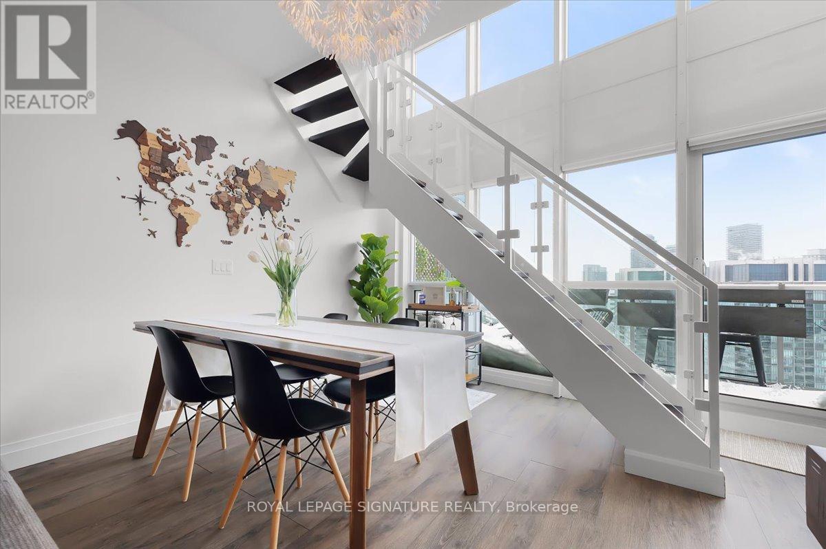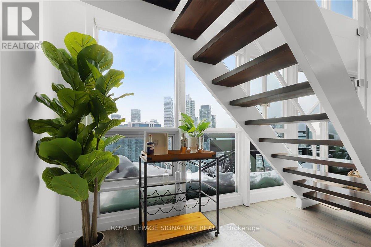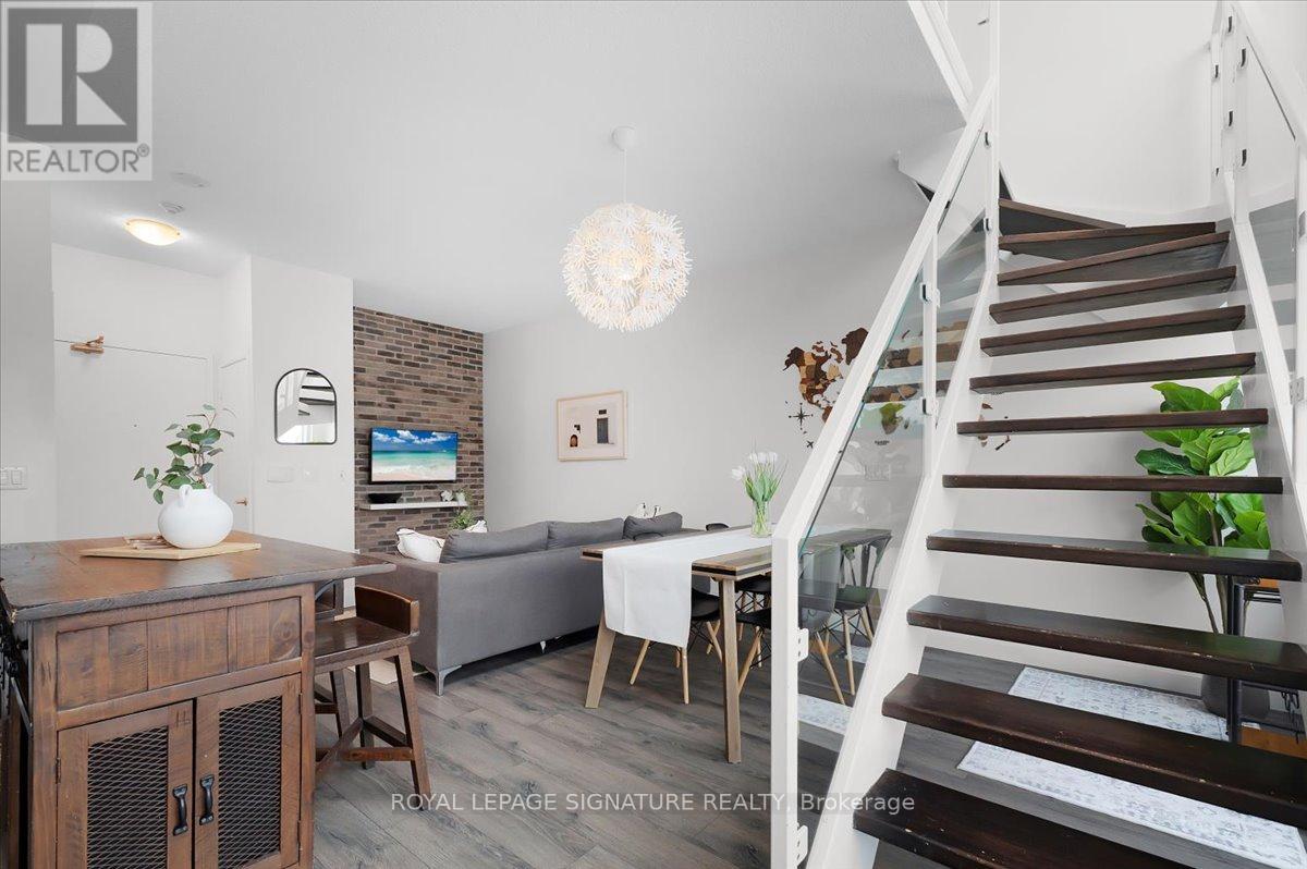 Not your average condo! Prepare to be captivated by this sun-filled, south-east facing top-floor loft, feat. dramatic 18-ft floor-to-ceiling windows offering stunning views of the lake, surrounding tree canopy, Mimico Creek, & city skyline. This striking 2-storey loft spans approx. 860 sq. ft. of thoughtfully designed, open-concept living, flooded w/ natural light allday & enhanced by soaring ceiling heights & architectural presence.The main level showcases updated flooring, a spacious living area w/ room for a large couch, complemented by a brick feature wall, plus a dedicated dining space that comfortably accommodates a full-size dining table ideal for hosting. The open kitchen feat. full-sized stainless steel appliances, a functional island & ample storage. A versatile bonus area beneath the stairs offers flexibility & can function as a bar area, workout space, desk, coffee station or storage. A convenient main floor powder room completes the space. Step out to the south-east facing balcony spanning the entire width of the unit, feat. patio tiles & folding bar top, perfect for enjoying a Summer cocktail. The upper level offers excellent separation of space & includes a generous-sized den, laundry room & a spacious primary bedroom retreat that easily fits a king-size bed w/ plenty of room to spare. The primary suite feat. a walk-in closet w/ built-in organizers & a 4-pc ensuite bath w/soaker tub. Floor-to-ceiling windows continue upstairs, maintaining the loft's bright & airy feel.Residents enjoy resort-style amenities, incl. 24-hr concierge, fully equipped gym, yoga studio, party room, games room, media room, billiards room, squash courts, sauna, outdoor pool, hottub, rooftop deck w/ gas BBQs, bike storage, guest suites & ample visitor parking. Ideally located in a highly sought-after Mimico waterfront community, steps to the waterfront, scenic trails, shops, groceries & transit, w/ quick access to to the Gardiner Expwy (3 min) & Mimico GO (5 min). (id:4555)