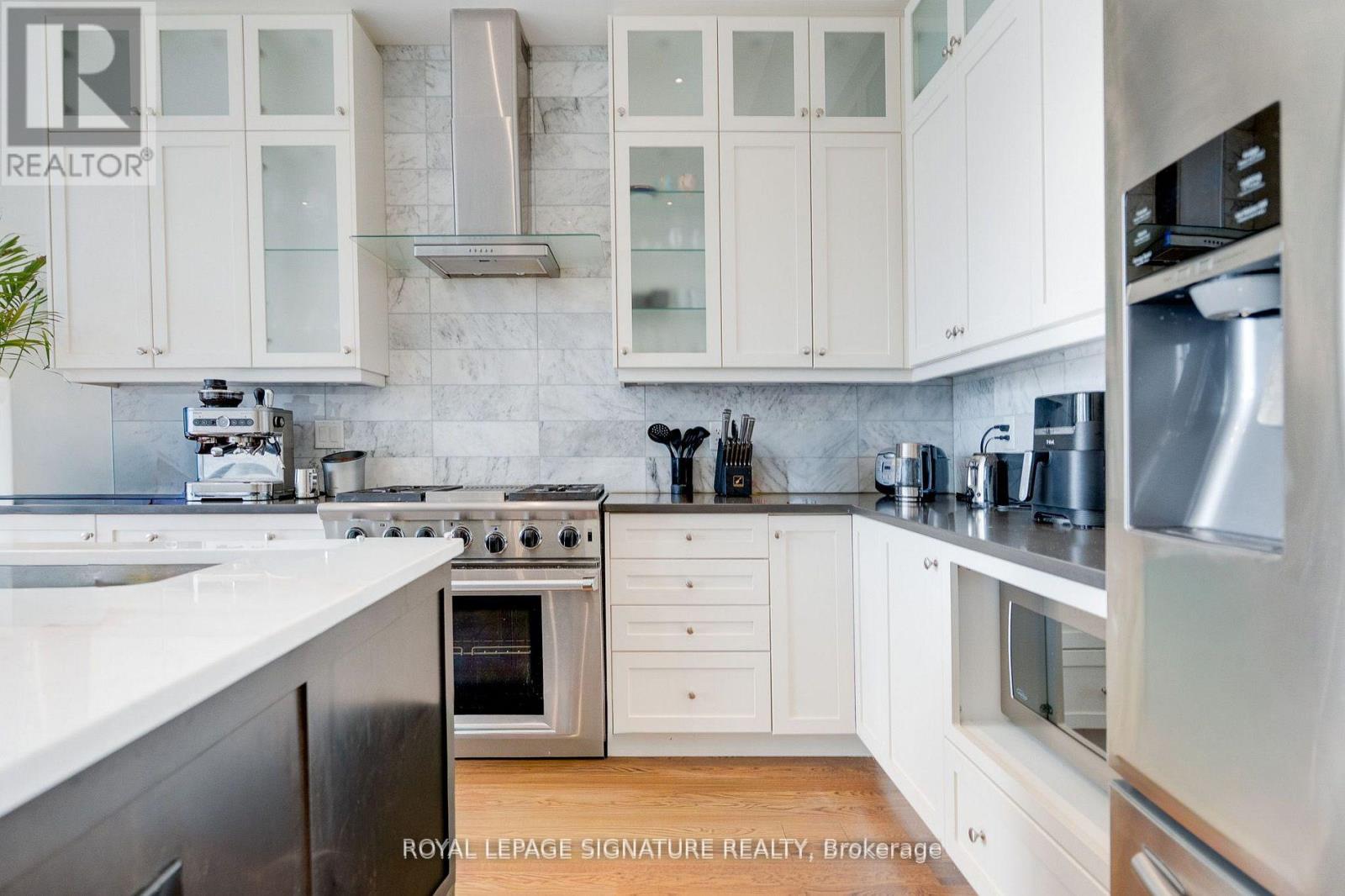 Welcome To This Exceptional Two-Storey Detached Residence In The Coveted Etobicoke-Mimico Neighbourhood. Custom-Built And Impeccably Maintained, This Home Blends Architectural Detail With Thoughtful Functionality Across Every Level. The Main Floor Showcases A Bright, Expansive Living And Dining Area, Anchored By A Statement Floating-Style Open-Riser Staircase With Wood Treads And Sleek Glass Detailing, Creating A Dramatic Yet Timeless Design Moment. At The Heart Of The Home, The Gourmet Kitchen Impresses With Soaring 12-Ft Ceilings, Illuminated Cabinetry, Premium Quartz Countertops, A Large Centre Island, And Stainless Steel Appliances. The Adjacent Family Room Continues The Sense Of Scale With Matching 12-FtCeilings, A Fireplace, And Direct Access To The Deck And Professionally Landscaped Backyard. The Upper Level Offers Three Well-Proportioned Bedrooms With 9-Foot Tray Ceilings, Enhanced By Abundant Natural Light From Skylights And Contemporary Glass Railings. With Four Bathrooms In Total, Including Three Full Baths And A Main-Floor Powder Room, The Home Is Well Suited For Both Family Living And Entertaining. The Lower Level Features 9-FootCeilings And A Walk-Up To The Backyard, Offering Flexible Space For Recreation Or Extended Living. The Basement Is Also Roughed In For Radiant Floor Heating. Refined Finishes Include 9.5" Baseboards, 4.5" Poplar Backbend Casing, Hardwood, Marble, And Porcelain Flooring, Generous Storage, An Integrated Security Camera System, And A Built-In Garage. Located In One Of Toronto's Most Desirable Waterfront Communities, This Is A Rare Opportunity To Own A Truly Turn-Key Home (id:4555)