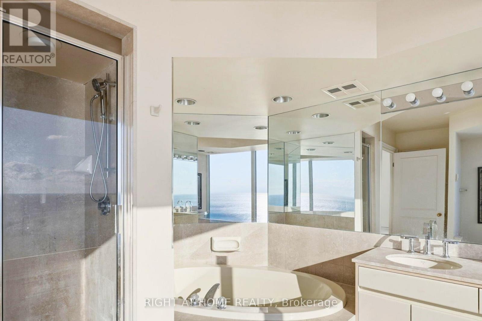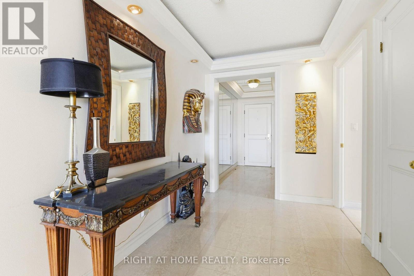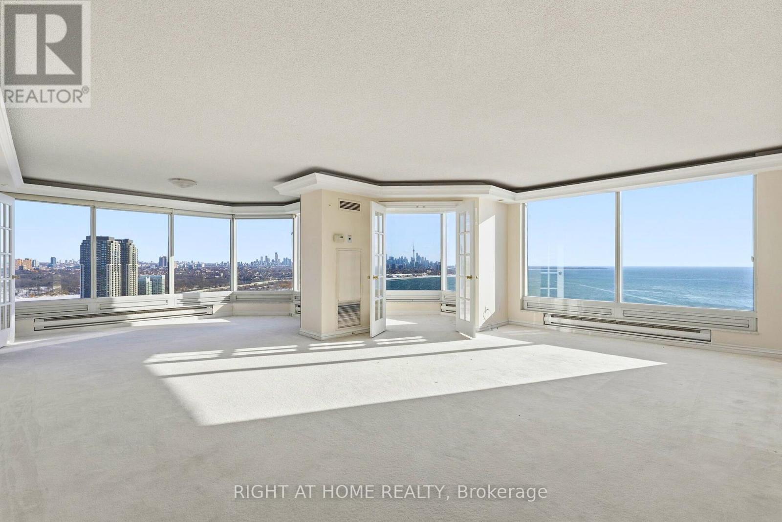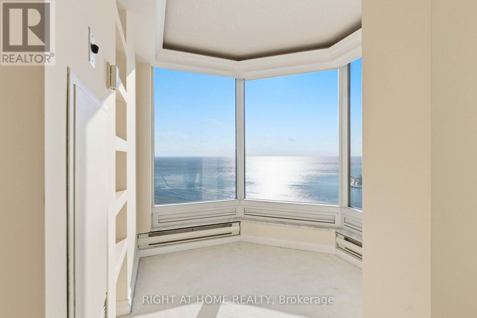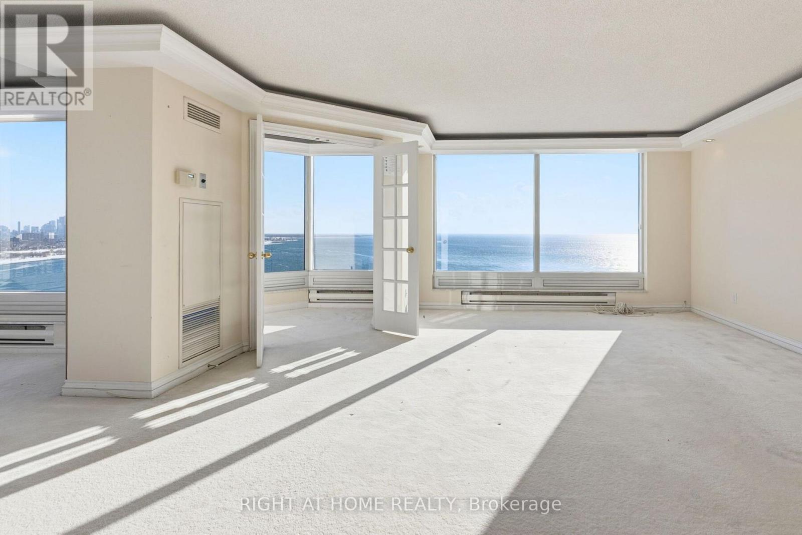 Panoramic Lakefront Luxury, Three Views Wide - East, South, and West!A true Palace Place signature suite: 2,028 sq ft of refined space, a rare 2-bed/3-bath layout, 2 parking and 2 lockers, anchored by what many consider the best floor plan in the building. This is the kind of home that makes you stop mid-sentence. Wraparound picture windows frame unobstructed Lake Ontario from three directions: downtown + lake to the east, open water straight south, and lake + Mimico skyline to the west. Morning light, golden afternoons, and sunset glow -every day has a different mood. The living and dining areas are expansive and naturally elegant, finished with classic crown moulding and tray ceilings, and designed for both entertaining and quiet, private moments. A bright, view-filled kitchen with stone counters and an oversized island keeps the backdrop front and centre-water, sky, and city. The primary suite delivers the same wow factor, complemented by a generous ensuite where the lake becomes part of your morning routine. All of this, in a building known for service and lifestyle, valet, concierge, private shuttle, and resort-style amenities. Schedule your private showing today and experience Suite 3203 in person. (id:4555)