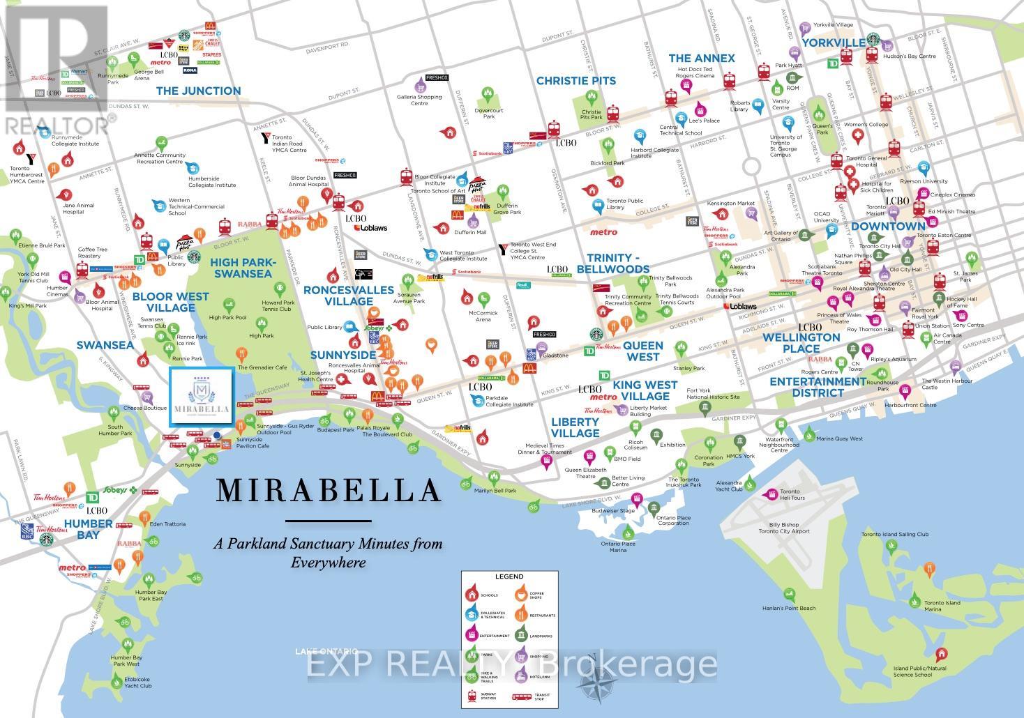 Welcome to Mirabella Condos (West Tower). This bright and modern 1 bedroom plus large den, 2 bathroom suite boasts a functional open concept layout and excellent natural light throughout. The spacious den can be used as a second bedroom, guest room or home office. A modern kitchen with quartz countertops and stainless steel appliances. The living area opens to a walk out balcony with views of High Park and the Lake Ontario. In-suite laundry and high-speed internet are included in this unbeatable waterfront location. Just steps to Sunnyside Beach, the Boardwalk, Humber Bay Shores, Martin Goodman Trail, and High Park, with TTC nearby and Bike Share at the front door. Enjoy piece of mind with a 24 hour concierge and exceptional amenities which include an indoor pool with lake views, fitness centre, yoga studio, sauna, library with fireplace, business centre, guest suites, children's play areas, pet grooming room, and an 11th floor landscaped terrace with BBQ's, lounge areas and a reflecting pool. (id:4555)