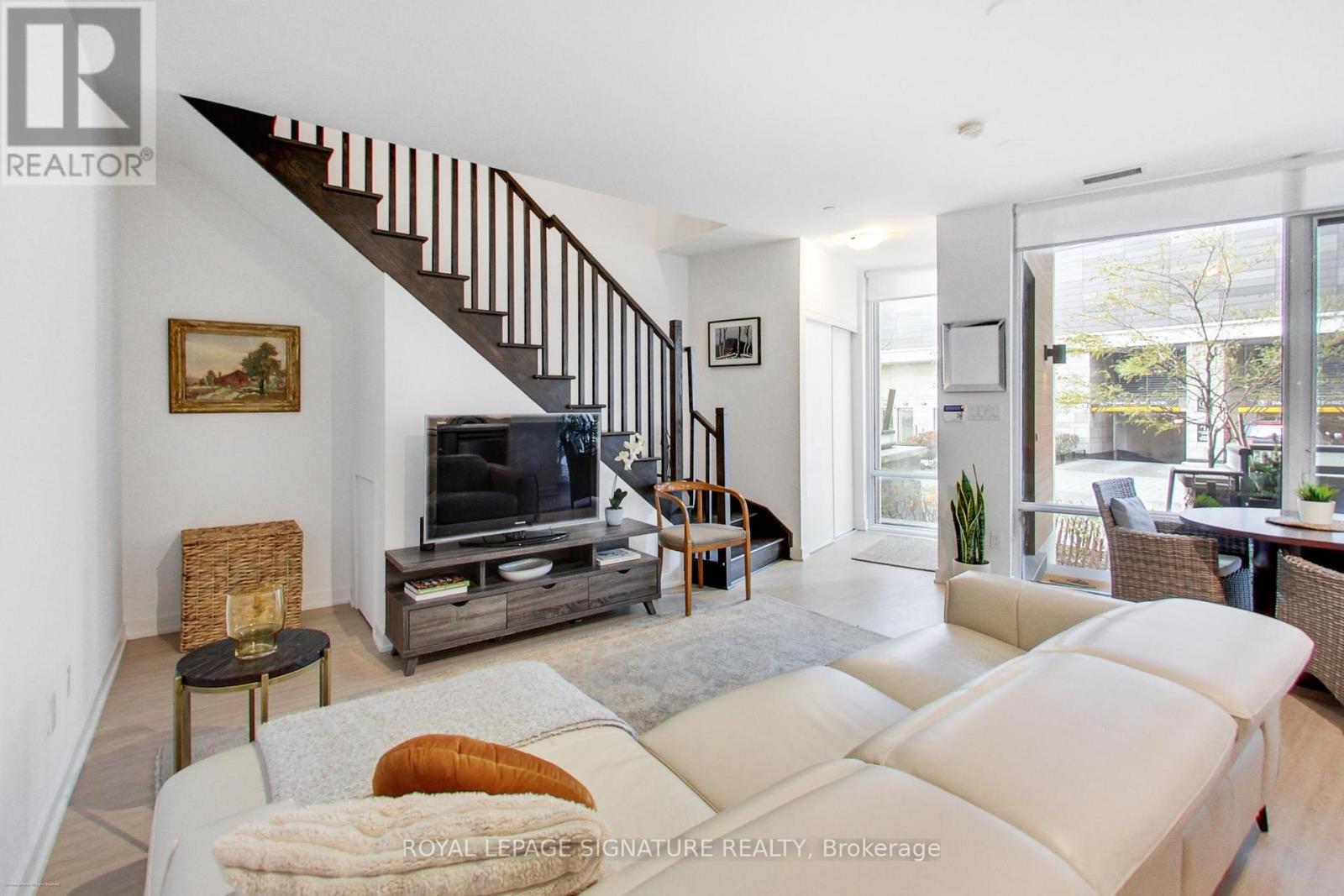 Stunning 2-storey, 2-bedroom plus den, 2-bath townhouse-style condo offering nearly 1,300sqft of bright, modern living in the heart of Liberty Village. This rare multi-level layout features a private street-level entrance, a spacious front terrace ideal for outdoor dining, and an additional upper-level balcony off the loft. The open-concept main floor boasts soaring ~10ft ceilings, wide-plank flooring, floor-to-ceiling windows, and a sleek contemporary kitchen with full-size stainless steel appliances, quartz counters, subway tile backsplash, and excellent storage. The second level includes an expansive open loft-perfect for a home office-plus two generous split-plan bedrooms. The primary suite impresses with floor-to-ceiling windows, a walk-in closet and second full closet, and easy access to a beautifully finished 4-piece bathroom with deep soaker tub. The second bedroom, enclosed with sliding glass doors, offers great privacy and storage. A second modern bathroom features a glass-enclosed walk-in shower. Full-size in-suite laundry, upgraded flooring, modern lighting, and abundant natural light throughout. 30 Ordnance Street is uniquely tucked beside acres of connected parkland, giving residents a rare sense of openness and calm while still being just steps from the vibrant heart of Liberty Village. It feels like its own private enclave, close to everything, yet pleasantly set apart. With direct access to some of the city's best walking and biking paths, it's ideal for anyone who values nature and lifestyle in equal measure. Great walking and bike path access. Steps to parks, Garrison Crossing, King West, groceries, cafes, TTC, GO Transit, and the waterfront. A rare opportunity to own a stylish multi-level home in one of Toronto's most vibrant neighbourhoods. A 91 Walk Score means 30 Ordnance is a walker's paradise where daily errands do not require a car. (id:4555)