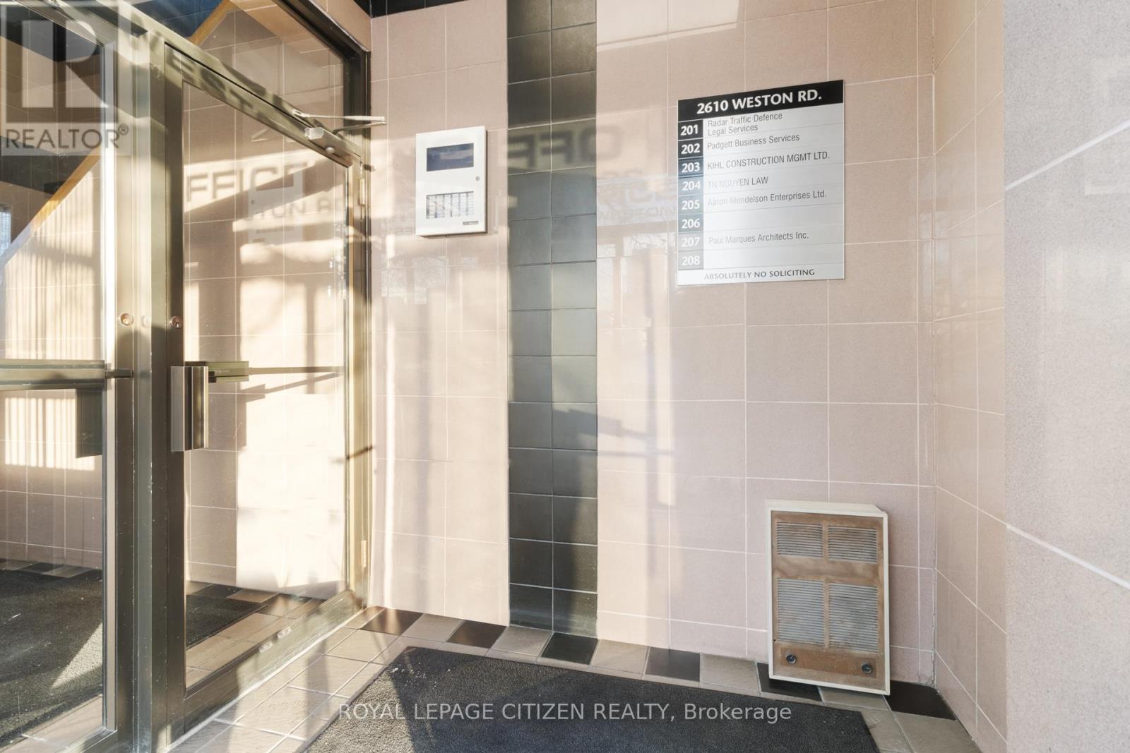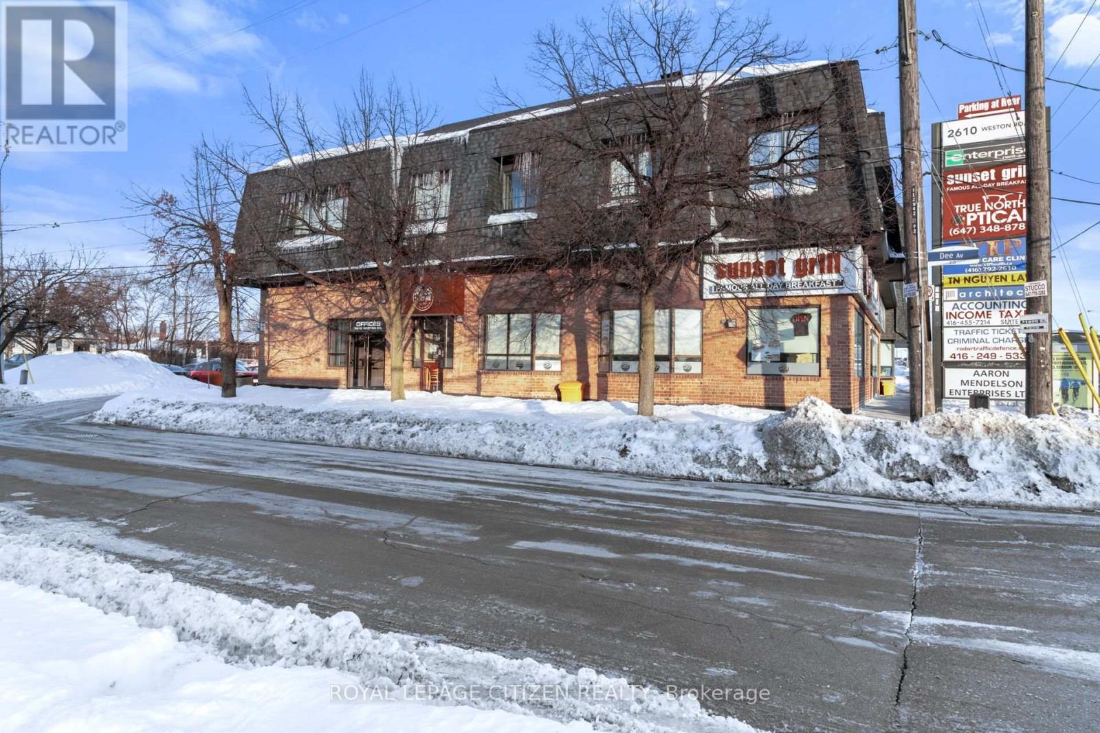 Seize the opportunity to elevate your business presence with this exceptional second-floor office space located at 2610 Weston Road in Toronto. Perfect for professionals, service-based businesses, and growing enterprises, this unit offers unparalleled visibility, convenience, and accessibility. Situated directly across the street from the bustling Crossroads Plaza this office building benefits from massive daily traffic counts and superb exposure. The building boasts a strategic position at the confluence of two of the GTA's most vital transportation arteries: Highway 400 and Highway 401, ensuring seamless access for your clients, employees, and suppliers from all corners of the city and beyond, making it the ideal headquarters for a company focused on growth and accessibility. This highly sought-after location offers fantastic exposure onto Weston Road, providing excellent signage opportunities for maximum brand visibility. Imagine your business name displayed prominently, benefiting from the non-stop flow of potential clients. For businesses prioritizing their visibility, a pylon and Banner signage is available. The building itself features a robust and diverse professional and retail tenant mix, creating a dynamic environment that drives foot traffic and provides convenient amenities for your team. This second-floor office unit is perfectly suited for a variety of uses, including legal, accounting, insurance, or general office use. Key Property Highlights: Size: Approximately 775 sq ft of efficient second-floor office space. Availability: Ready for occupancy starting April 1, 2026. Abundant Parking: Generous, well-maintained surface parking ensures hassle-free access for both tenants and clients. Signage: Excellent exposure with potential for highly visible fascia and pylon sign access. Transit Access: Easy access to TTC routes connecting to the rest of Toronto. (id:4555)