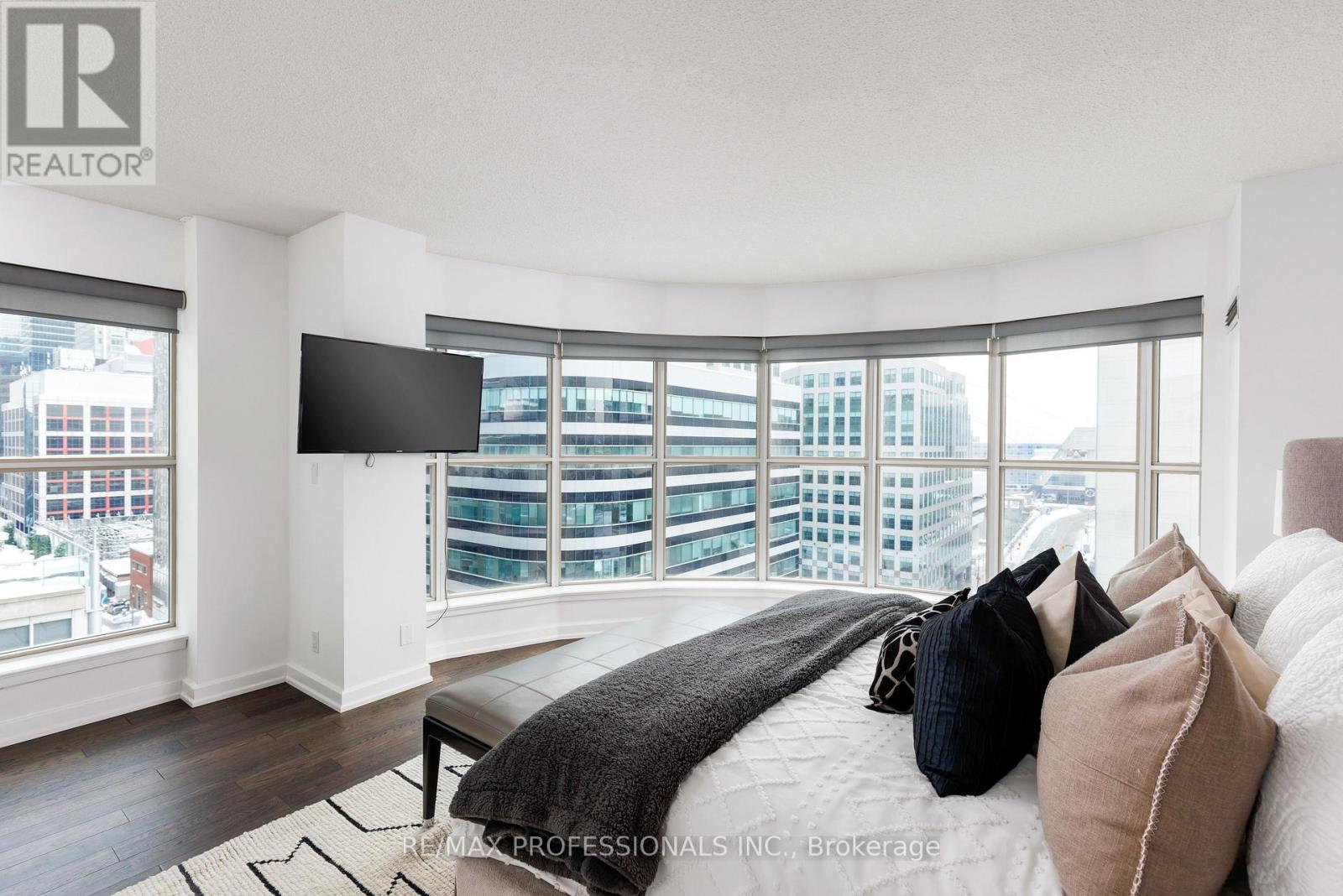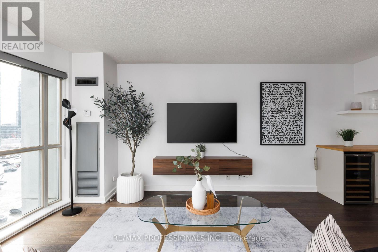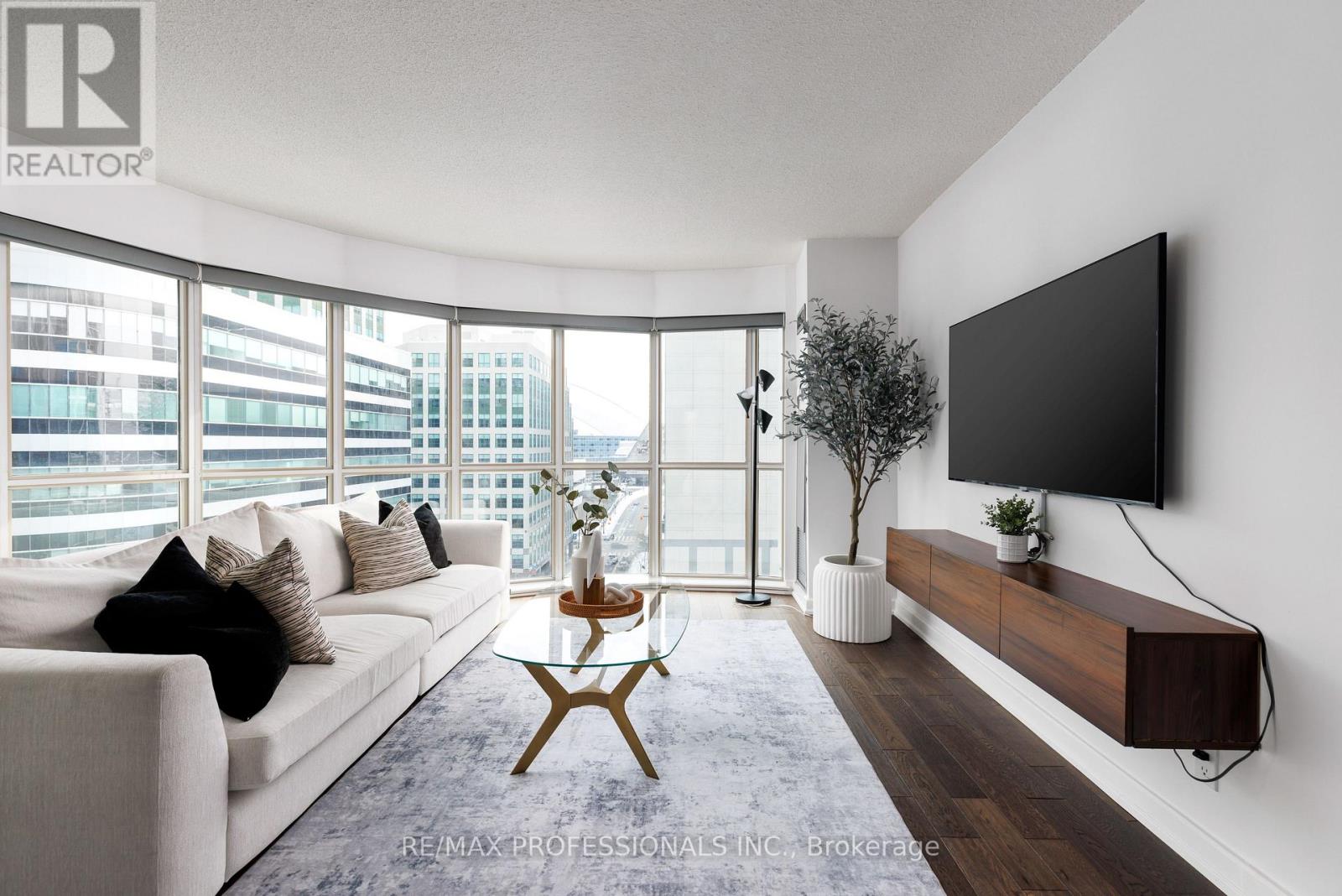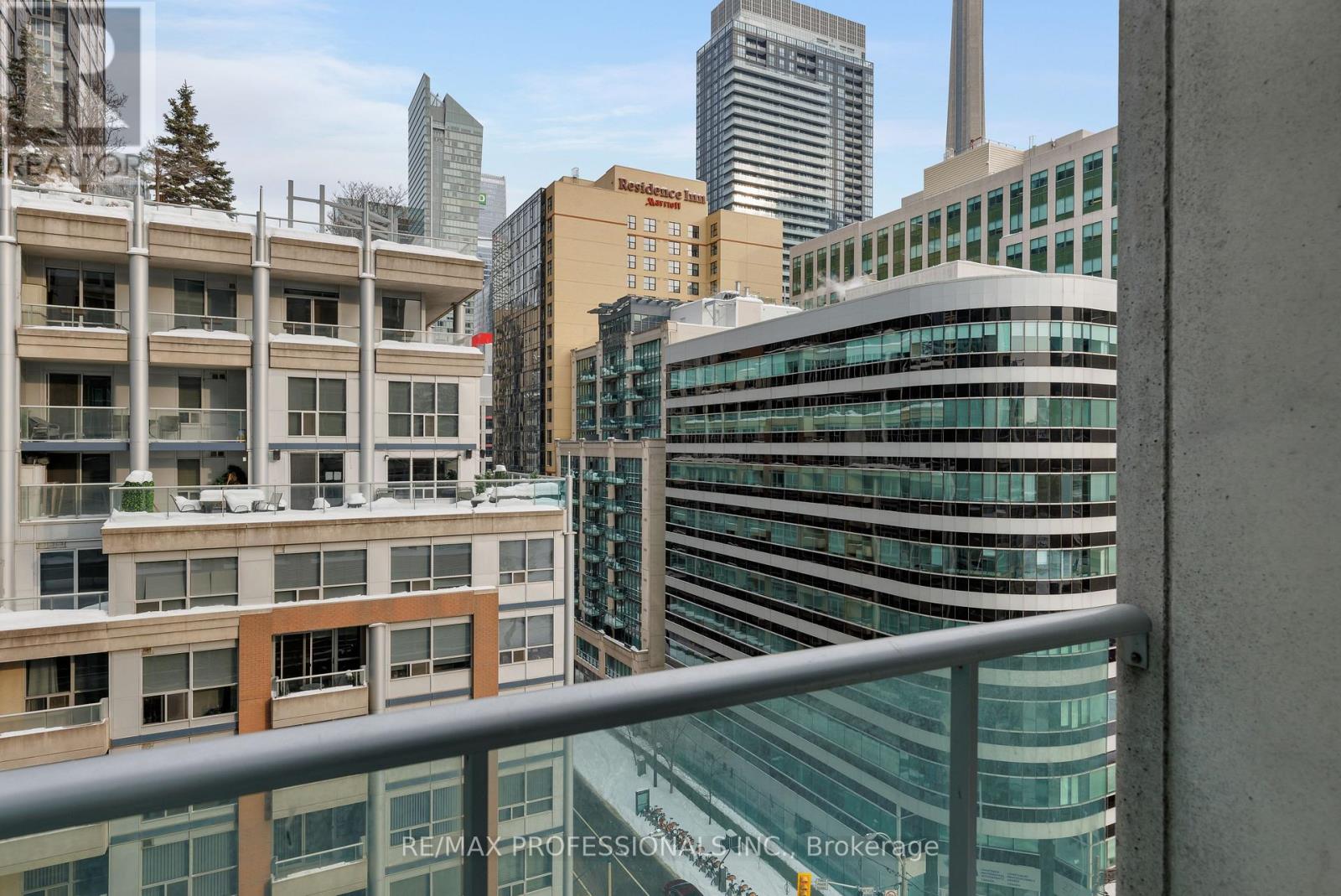 Welcome to the iconic SoHo Metropolitan Residences, where five-star hotel living meets sophisticated downtown luxury. This stunning two-storey, loft-style corner residence offers over 1,300 sq ft of thoughtfully designed living space, highlighted by expansive floor-to ceiling windows that flood the home with natural light. Southeast exposure from every room showcases breathtaking city views, while warm-toned engineered hardwood flooring and generously proportioned principal rooms create an inviting yet refined atmosphere. The main level is perfectly suited for both everyday living and elegant entertaining, featuring a spacious kitchen with full-size stainless steel appliances, quartz countertops, and custom built-in cabinetry providing exceptional storage. A separate dining area comfortably accommodates hosting, with seamless access to the balcony, an ideal setting for morning coffee or evening relaxation overlooking the city. Upstairs, the serene primary retreat easily accommodates a king-size bed and features custom-built-in cabinetry and a private ensuite. The versatile second bedroom, also with its own ensuite, functions beautifully as a guest suite, home office, or additional living space. Residents enjoy exclusive access to SoHo Metropolitan renowned hotel-style amenities, including a fully equipped fitness center with towel service, indoor pool, sauna and steam rooms, rooftop terrace with BBQs and fire pits, 24-hour concierge. Ideally located in the heart of Toronto's Entertainment District, you are steps to world-class dining, theatres, nightlife, Rogers Centre, CN Tower, TIFF, transit, and the Financial District. With near-perfect walk and transit scores, this is downtown living at its most effortless and refined. One owned parking spot adds to the overall convenience of this property (id:4555)