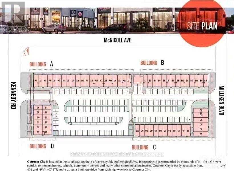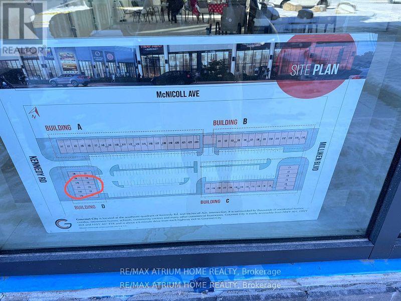 ** Frontage SIGNAGE on KENNEDY ROAD *** Gourmet City Commercial Condos is a newly developed culinary hub in Scarborough, ideally located at the southeast corner of Kennedy Road and McNicoll Avenue. This project offers excellent exposure and accessibility from both Kennedy Road and Milliken Boulevard. Developed by H & H Group, the plaza features modern architecture and high-quality finishes. The site benefits from high visibility and consistent foot traffic, making it ideal for a wide range of business opportunities.This is a brand-new unit with 20-foot high ceilings and in raw condition, ready for customization. The listing includes two combined units (D3 + D11), totaling 1,136 square feet (see floorplan). Permitted uses include restaurant, dine-in bakery, cafe, dessert shop, bubble tea, bar, and moreperfect for serving diverse cultural tastes.Just minutes from Highways 404 and 407. (Tax estimate $1485/mon, Management fee $395/mon, Insurance estimate $100/mon). Unit D11 faces Kennedy Road for prime visibility, while Unit D3 faces the interior parking lot. Features include two entry doors and two electrical panels for flexible use. ***Permitted uses include restaurant, Dining in bakery , Bar & more**** (id:4555)