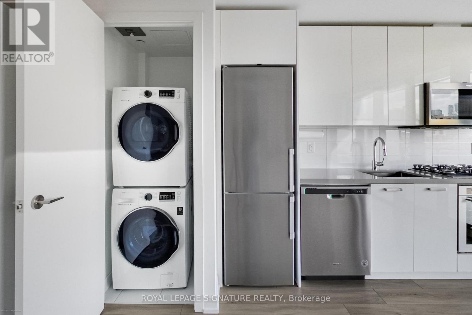 Live in Luxury at Woodsworth Condos! Sparkling clean, bright and airy - this lavish loft-style suite is located in one of downtown Toronto's most sought-after boutique addresses. A soft-loft in its truest form featuring soaring 9-ft ceilings, an exposed concrete accent wall and dramatic floor-to-ceiling windows that fill the space with natural light. Step out onto your spacious balcony - a private oasis perfect for morning coffee or evening relaxation. Sit back, relax and indulge in spectacular sunset and city views. The open-concept European-style kitchen impresses with quartz countertops, a sleek (+ super rare) gas cooktop, and modern cabinetry designed for sophisticated urban living. Retreat to the spa-inspired bath, complete with 4-pieces - a 2-in-1 soaker tub/shower waterfalled with marble-style tile, porcelain floor tiles, a quartz vanity and mirror + under-sink storage space. Ensuite laundry! Enjoy premium building amenities including a state-of-the-art fitness centre and stylish party/meeting room. Perfectly located steps from Queen West, the Financial and Entertainment Districts, and Toronto's best shops, cafes, and restaurants. Includes 1 Storage Locker! (id:4555)
