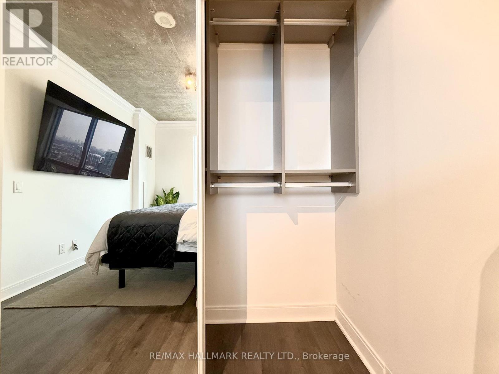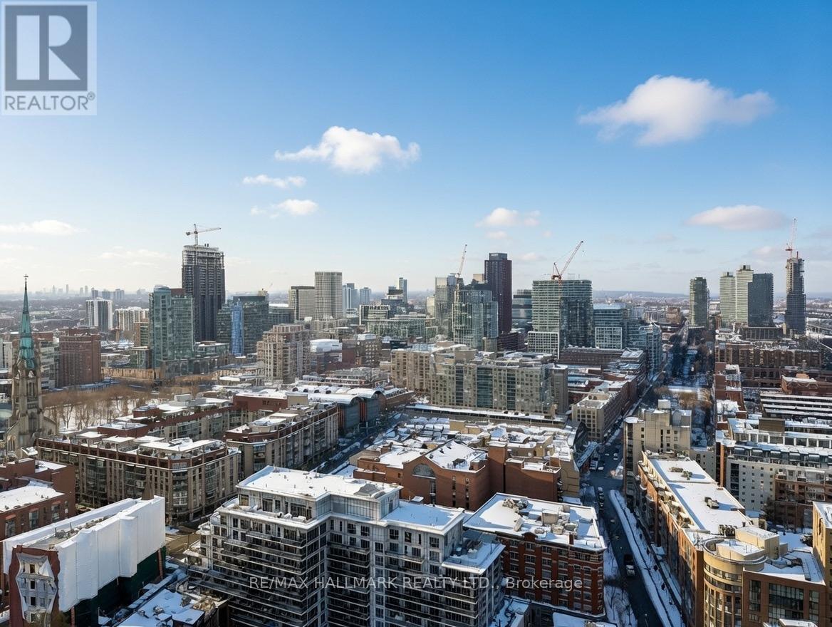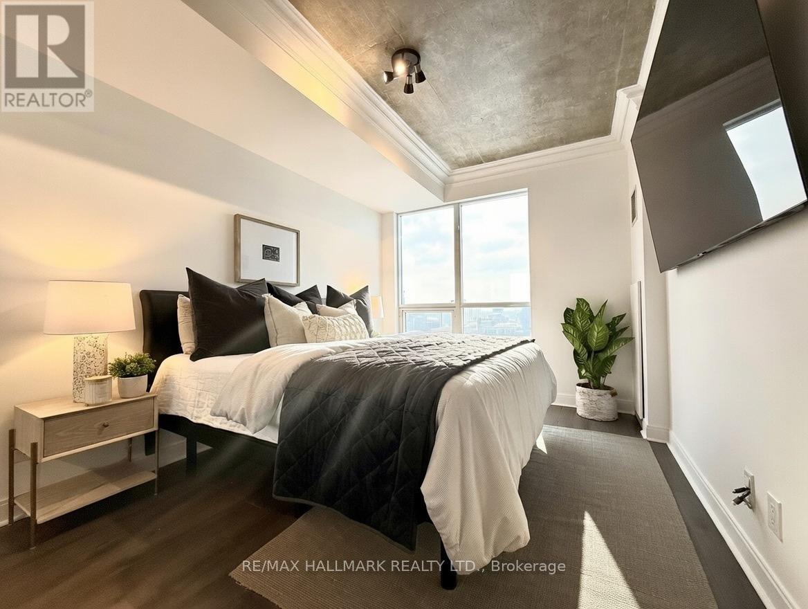 Live on The Esplanade in this bright, high floor, corner 1 bedroom suite offering 615 sq ft of well designed space with beautiful east views of the city and lake. Featuring 9 ft smooth exposed concrete ceilings that add height and character, giving the space a subtle loft inspired feel, along with dark espresso hardwood flooring throughout the living and dining areas. The functional kitchen is equipped with stainless steel appliances, granite countertops, an undermount sink, and a center island that doubles as a breakfast bar. The spacious bedroom is filled with natural light and offers a large closet with California Closet organizers. Marble bathroom, in suite laundry, and thoughtful storage including a custom coat California Closet organizer add to the comfort of the space. All appliances were recently purchased in 2025. This suite is being offered fully furnished with two large LG TVs (75" & 85"), couch, motorized king bed, and an entertainment unit included. Just bring your pillow and sheets. Option to assume a premium rental parking spot located directly by the garage door and close to the elevators for $200 per month, prepaid until June, giving you time to decide if you need it. Located in the iconic London on the Esplanade, tucked between Front Street and the waterfront, steps to the Financial District, St. Lawrence Market, Union Station, The PATH, Sugar Beach, Metro, LCBO, restaurants, shopping, and transit. Walk Score 100. Building amenities include 24 hour concierge, rooftop outdoor pool, full fitness center and spa, party room, theatre room, library, and guest suites. (id:4555)