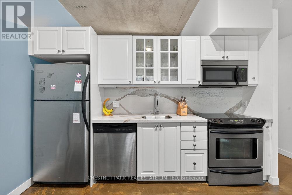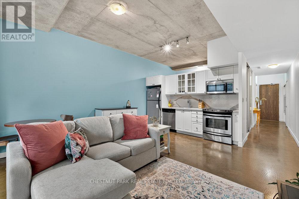 Authentic loft living in the heart of Leslieville at The Printing Factory Lofts. This ground floor suite offers 668 sq.ft. of living with exposed concrete ceilings and polished concrete floors throughout. The updated open concept kitchen features stainless steel appliances. Step outside to an approximately 200 sq.ft. terrace, ideal for BBQs and warm weather entertaining, overlooking a quiet, private courtyard. Leslieville is one of Toronto's most loved east end neighbourhoods, known for its shops, top cafés, standout dining, and an easy, walkable vibe that feels like a community. Weekends are made for brunch, local bakeries, and a stroll through nearby parks, with quick transit options when it is time to head downtown. Tenant responsible for hydro, gas, wifi, cable & internet. (id:4555)