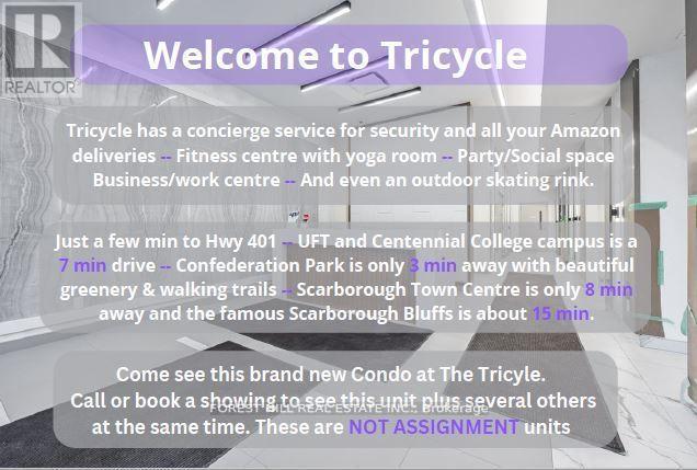 Beautifully Designed & Laid Out this 3 Bedroom Unit Has 966sf Of Living Space & 13 ft Ceilings With Its Own Private 85sf Terrace. Plank Flooring Throughout, Updated Backsplash And Under Mount Sink. This Unit Is Brand New. The Building Offers A Concierge Service, Party/Rec Room, Fitness Room With Yoga Area And A Business/Work Centre. Few Min To Hwy 401. U Of T Campus And Centennial Campus Is A 7 Min Drive. Ellesmere Junior, North Bendale, Henry Hudson And Churchill Heights Schools Are Within 5 Min. Confederation Park Only 3 Min Away So You Can Enjoy All The Greenery & Walking Trails. Scarborough Town Centre Is Only 8 Min And The Famous Scarborough Bluffs Is About 15 Min. **Take advantage of the New Mortgage rule changes that will help with lower deposits and/or longer amortization. Please Speak to your Banks Mortgage specialist or Mortgage Broker.** **EXTRAS** Brand New Units At The Tricycle Just Released, All With Tarion Warranty. One Parking And 3 Lockers Included. (id:4555)