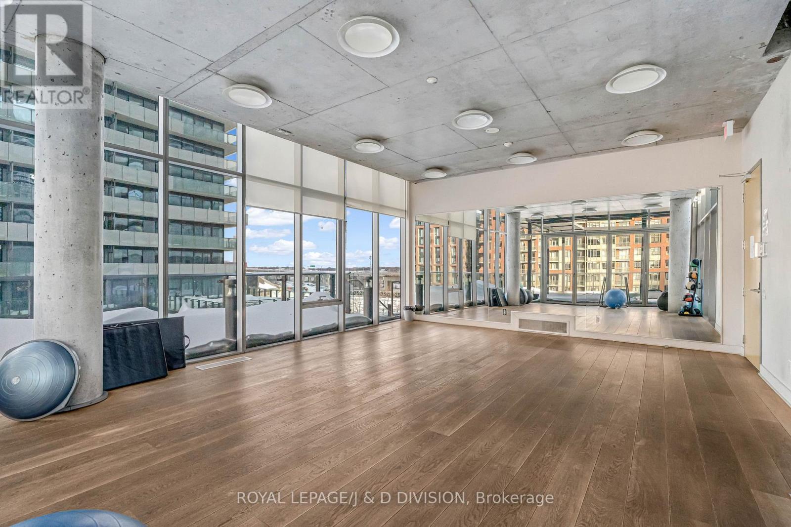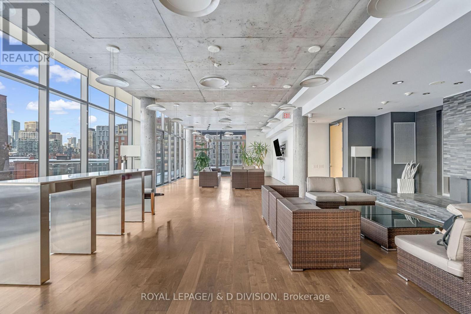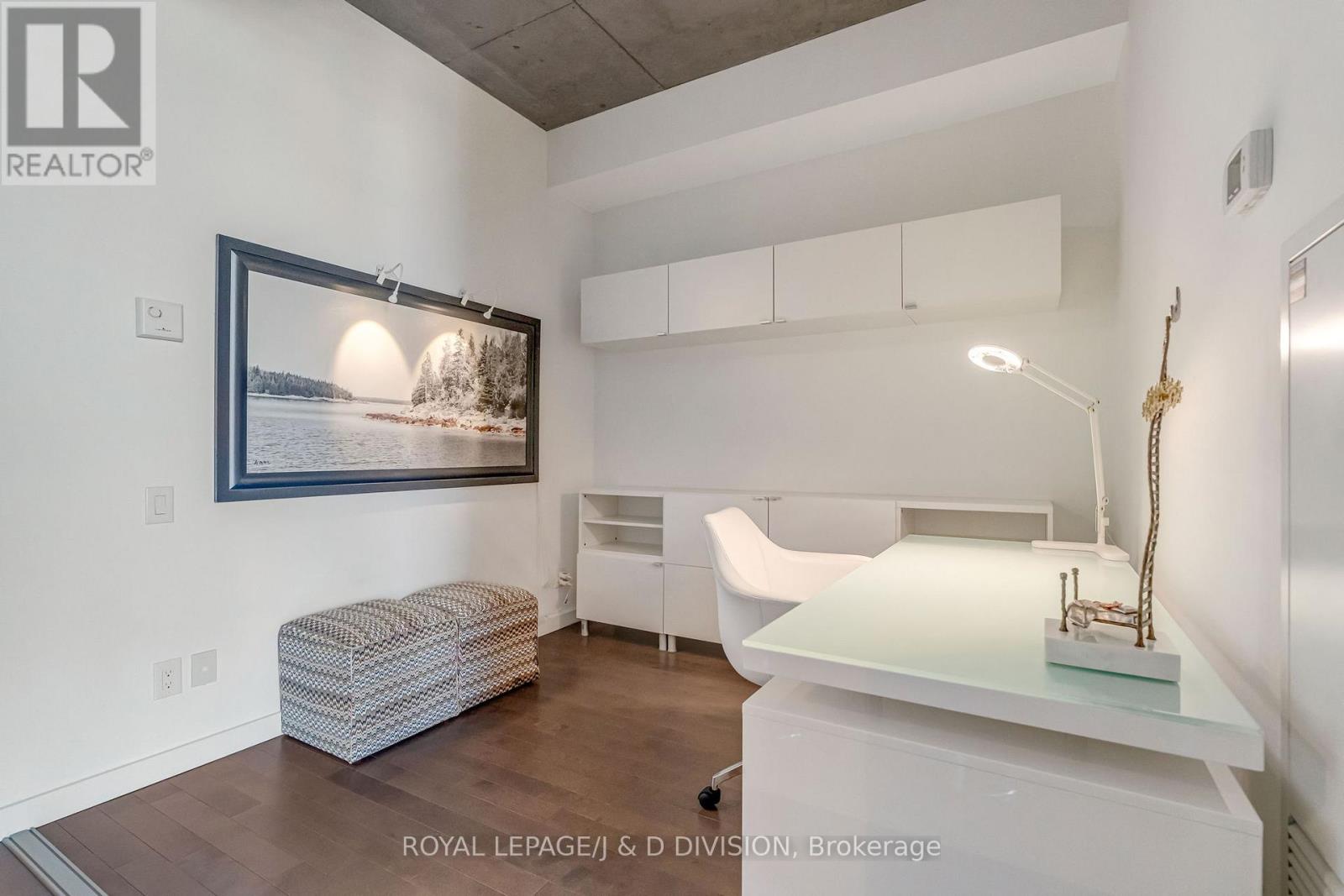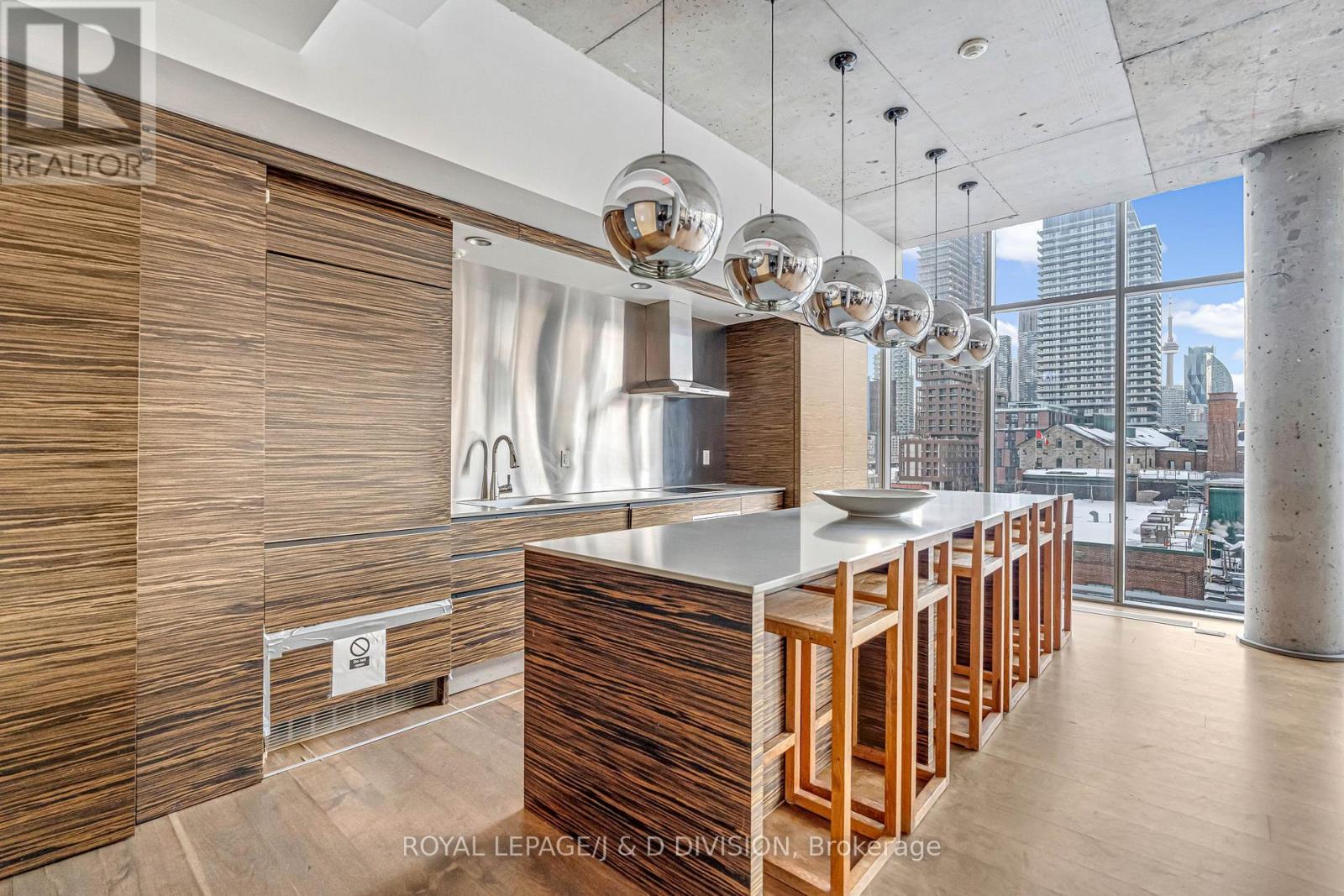 Exceptional one-bedroom plus expansive den 9'4" x 9'1" (ideal as a second/guest bedroom or home office) featuring nearly 10-foot ceilings and pristine, owner-occupied finishes-lightly used as a pied-à-terre. Includes one parking space with EV charger and one locker. Thoughtfully designed with an elegant custom kitchen island and breakfast bar, full-size appliances, and a seamless open-concept layout ideal for both everyday living and entertaining. A dramatic wall of floor-to-ceiling windows captures coveted southeast exposure, filling the space with beautiful natural light and offering peaceful, unobstructed views. Generous storage, a large bathroom, and refined finishes throughout complete the home. Set within a prestigious LEED-certified building, residents enjoy an exceptional suite of amenities including an outdoor pool, BBQ pits, guest suite, visitor parking, fully equipped fitness centre, party room, yoga studio, library, and more. Transit at your doorstep and just minutes to downtown, this residence offers an unparalleled blend of sophistication, comfort, and convenience. Great value in the heart of the Distillery District! (id:4555)