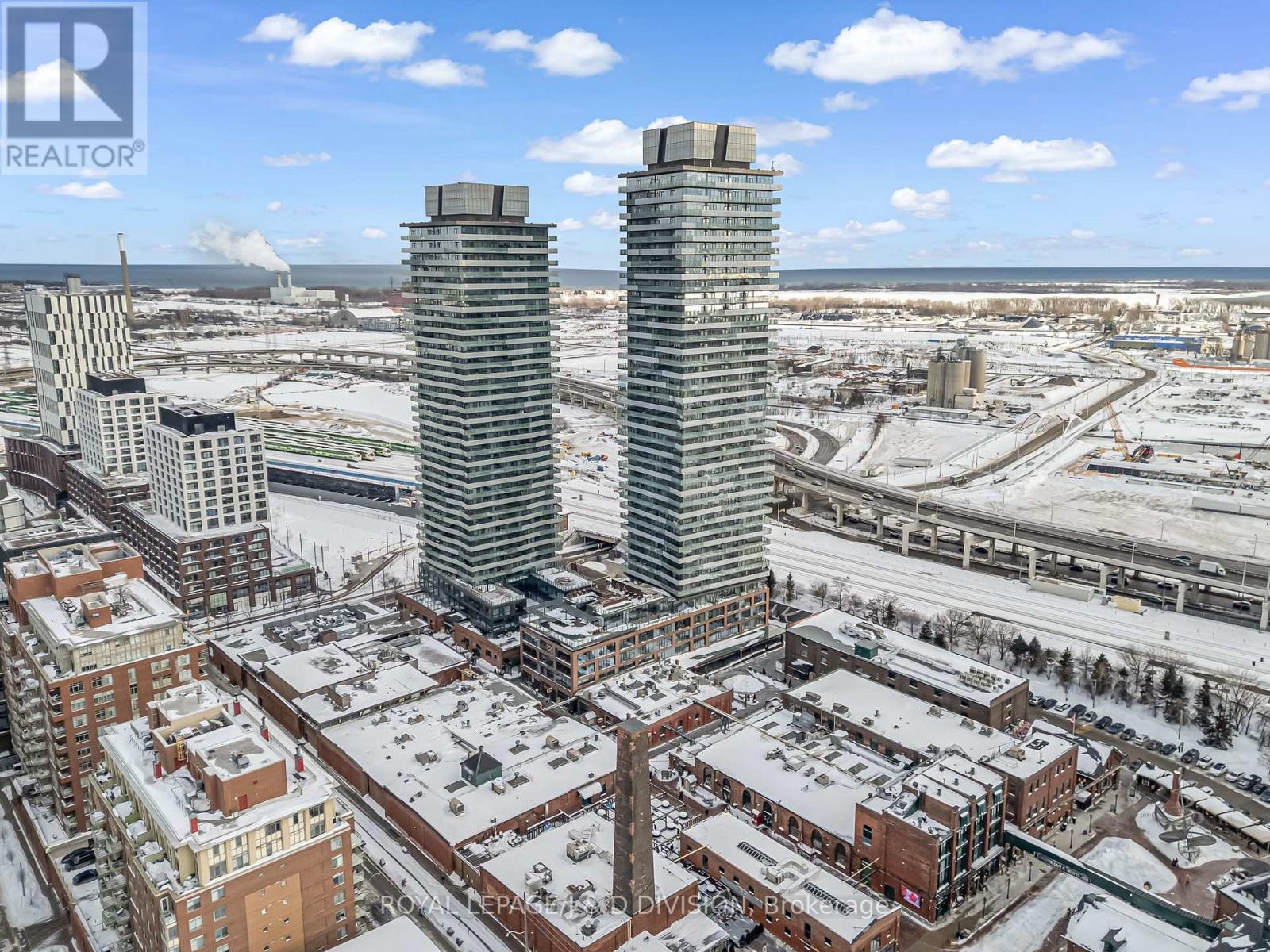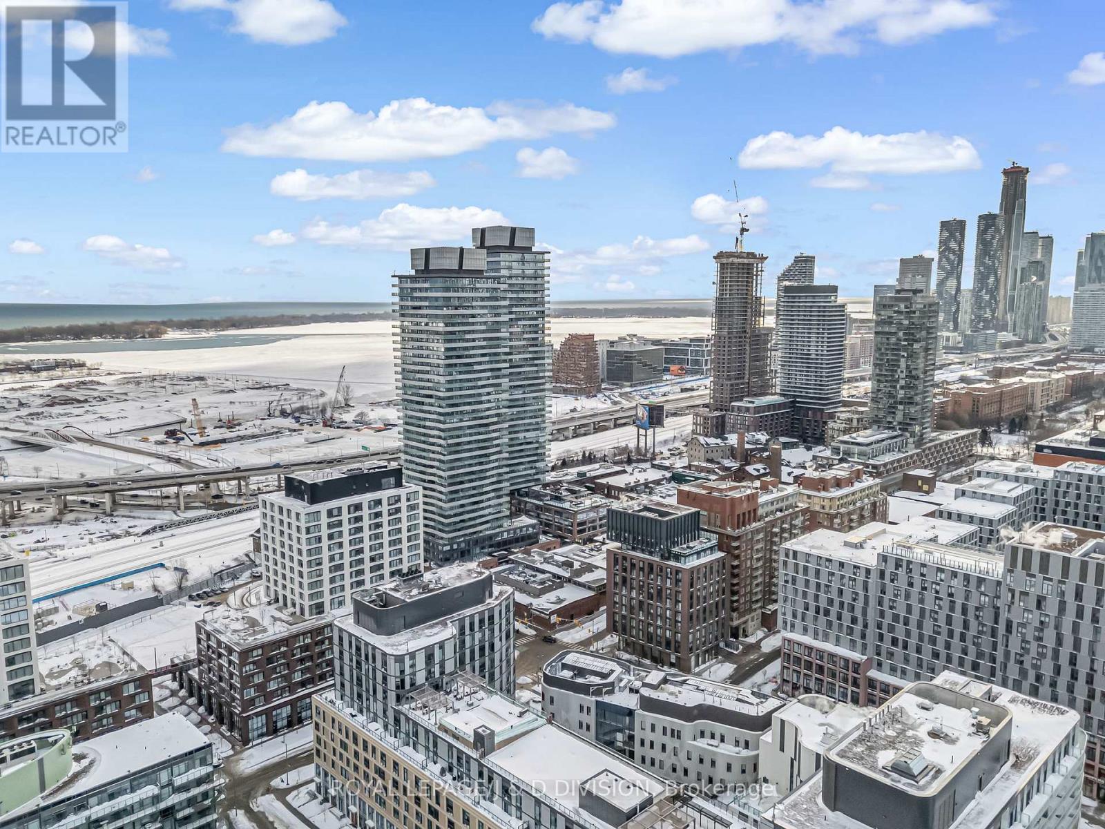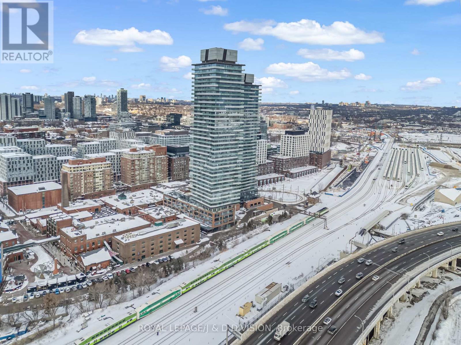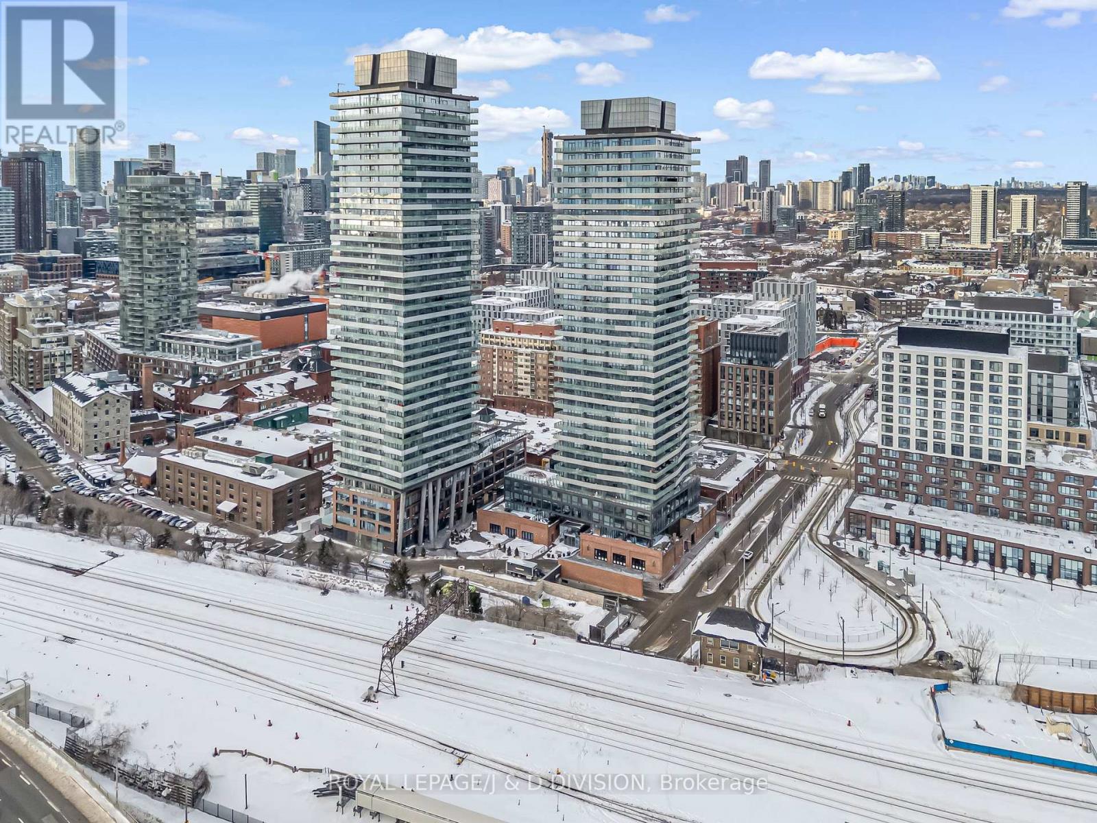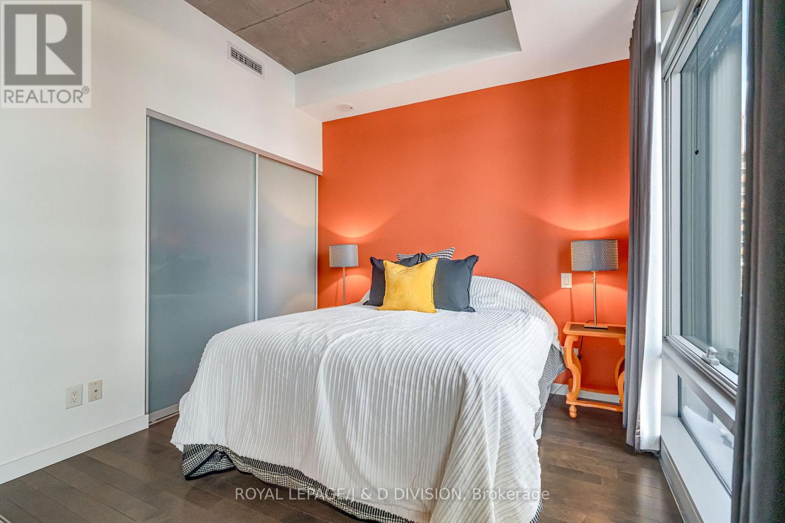 Exceptional one-bedroom plus expansive den 9'4" x 9'1" (ideal as a second/guest bedroom or home office) featuring nearly 10-foot ceilings and pristine, owner-occupied finishes-lightly used as a pied-à-terre. Includes one parking space with EV charger and one locker. Thoughtfully designed with an elegant custom kitchen island and breakfast bar, full-size appliances, and a seamless open-concept layout ideal for both everyday living and entertaining. A dramatic wall of floor-to-ceiling windows captures coveted southeast exposure, filling the space with beautiful natural light and offering peaceful, unobstructed views. Generous storage, a large bathroom, and refined finishes throughout complete the home. Set within a prestigious LEED-certified building, residents enjoy an exceptional suite of amenities including an outdoor pool, BBQ pits, guest suite, visitor parking, fully equipped fitness centre, party room, yoga studio, library, and more. Transit at your doorstep and just minutes to downtown, this residence offers an unparalleled blend of sophistication, comfort, and convenience. Great value in the heart of the Distillery District! (id:4555)
