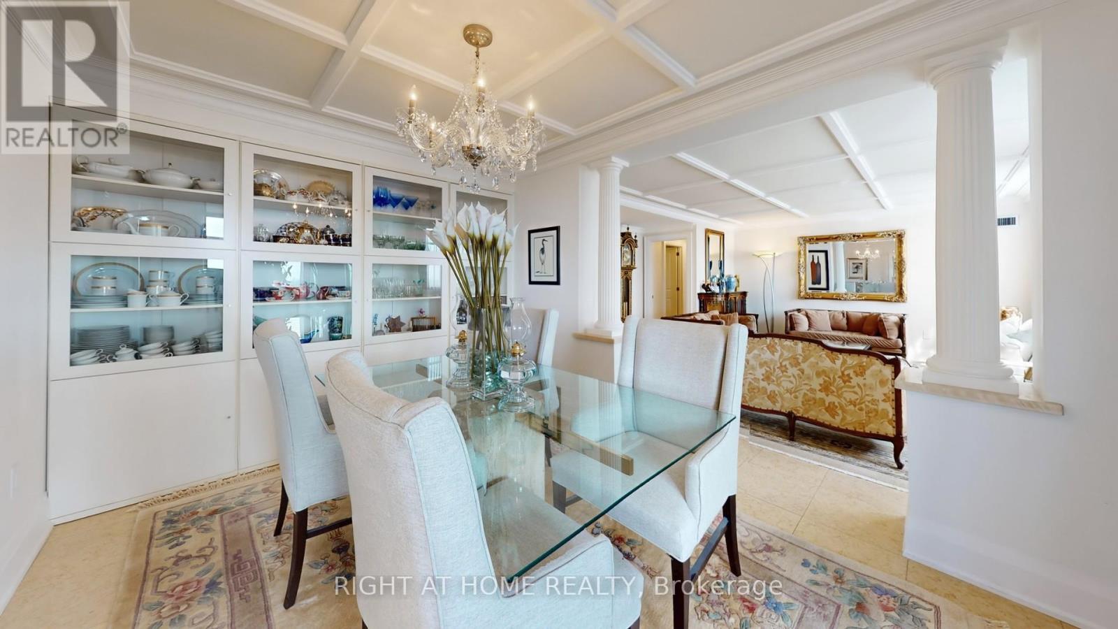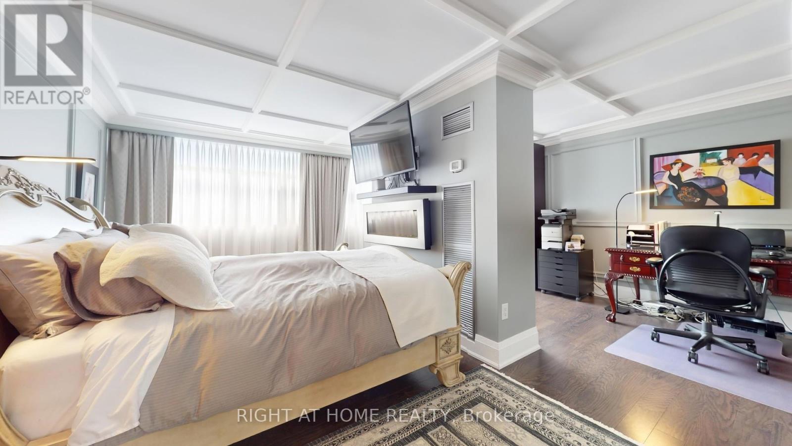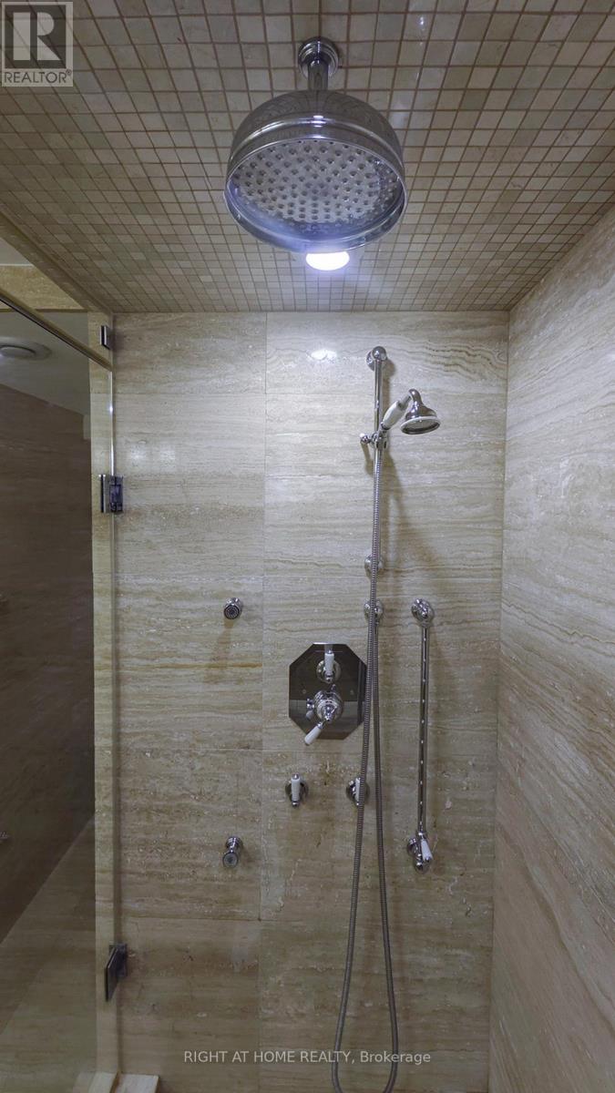 One of the Largest and Most Beautifully Renovated Suites in the Building. Welcome to this exquisitely updated 2-bedroom plus den/office, 2-bathroom suite offering approximately 2,000 sq. ft. of bright, elegant living space with unobstructed corner unit south-facing views a true bungalow in the sky on the sub-penthouse 28th floor. The grand foyer with a double-door closet leads into spacious living and dining areas, perfect for entertaining or relaxing. Large windows fill the space with natural light and frame stunning east, south and west views. Featuring waffle ceilings and gypsum crown moulding, Jerusalem stone flooring, custom solid wood doors, and rich draperies throughout, this home radiates warmth and elegant sophistication. A full-sized dining room with custom built-in cabinetry connecting to a sun-filled quartz solarium, ideal for lounging or working from home. The gourmet kitchen is beautifully designed with granite countertops and backsplash, under-cabinet lighting, extensive custom cabinetry, large floor to ceiling window, and high-end built-in appliances including a paneled double-door fridge, cooktop, microwave/oven combo, and paneled dishwasher. The spacious primary suite offers a reading nook, desk area, generous cabinetry, a large custom walk-in closet, and a luxurious ensuite with Perrin & Howe Mayfair hardware, custom slab travertine heated floor to ceiling finishes, double-sinks, travertine vanity and shelving, steam sauna shower, with a connecting private toilet and bidet. The second bedroom includes a double closet and is perfect for guests or family. An in-suite locker with built-in shelving adds valuable storage space. Located steps from transit, top schools, parks, and shops, this home offers ultimate convenience. Maintenance fees include all utilities, including Rogers cable TV. Two parking spaces are included. (id:4555)