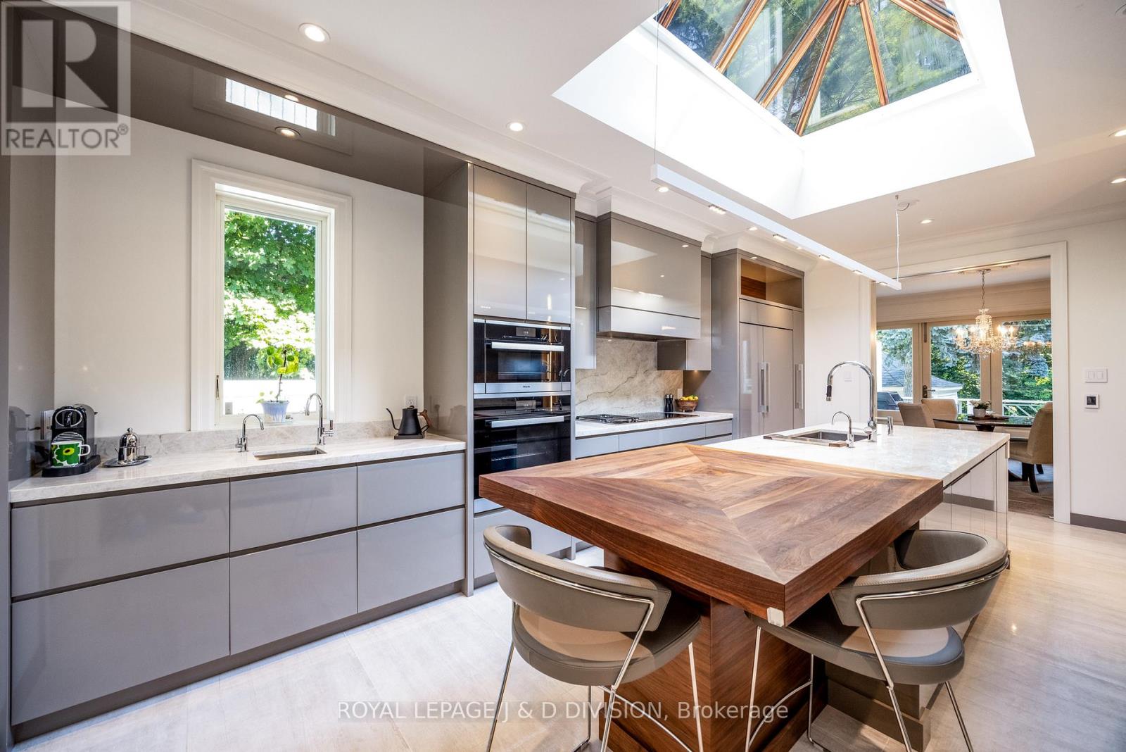 A rare opportunity to own a secluded ravine residence, gracefully set back from the street on an expansive 1/2 acre+ lot in one of Toronto's most private enclaves. Expansive, L-shaped lot, with gunite pool set to the side, and a home with 5,200+ square feet above grade that blends transitional design with timeless style. Surrounded by mature trees & a picturesque ravine, this estate offers the feeling of country living. Grand interior foyer with two-storey south windows, flagstone floors, and a sweeping staircase. The main floor is designed to entertain from formal garden views, gracious living and dining rooms, a chef's kitchen featuring an atrium skylight, Tahj Mahal Quartzite island, walnut details, and top-of-the-line appliances, connecting to a sun-filled breakfast room with fireplace and Nano doors that open to the outside. Family room with detailed millwork, walk out to a deck and panoramic views over the ravine and pool. Main floor also includes large home office off the side hallway, powder room, guest/nanny bedroom, 3-piece bath, laundry and mud room with access to the double garage. Second floor is expansive with five generous sized bedrooms, three bathrooms including a primary suite with sitting area, fireplace, spa-inspired ensuite, and tranquil views of the gardens and ravine. Lower level features upgraded mechanics, bright, playful recreation room with built-ins, cozy reading nook, and walk-out access to the pool. The exquisite garden is designed by landscape architect Ron Holbrook, featured in Canadian House & Home and included in local garden tours. Highlights include a charming gazebo, potter's shed, large grass area for children to play, a deck ideal for al fresco dining and summer entertaining with sun awning, gunite pool with hot tub-surrounded by complete privacy, is embraced by the ravine and lush landscaping. Unmatched privacy so close to top schools, walk to Yonge Street amenities, and steps to Rosedale Golf Club. (id:4555)