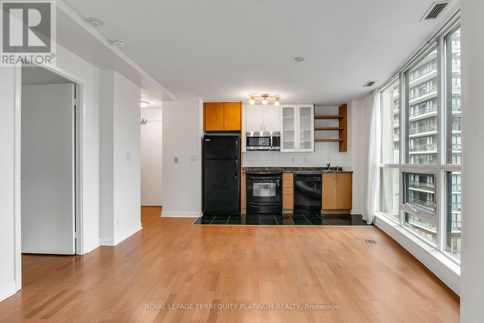 It's time to make your new year's resolution of moving downtown happen! This total package is located in downtown Toronto's thriving waterfront neighbourhood, steps to the lake, park, running trails, dog park, TTC at your door, Billy Bishop Airport, Loblaws, LCBO, King West bars/ clubs/restaurants,local dining/cafes and so much more. This 1-bedroom corner suite at the end of the hall offers a functional open-concept layout with large northeast-facing windows overlooking the building's quiet courtyard. No wasted space! Wood floors run throughout, and the living area opens to a balcony for a breath of air any time of day. Residents enjoy some of the best amenities in the neighbourhood, including a 24-hour concierge, indoor pool and hot tub, a fully equipped gym, a rooftop terrace with BBQs, ample visitor parking, and a stylish party room with kitchen and bar. Owned locker for convenient storage of larger items, and the bonus is the owned parking space so you can take a drive with easy access to the Gardiner, getting you in and out of the downtown core efficiently. GO Train access at Exhibition Station is also a walkable, convenient option. Note that some images are virtually staged. (id:4555)