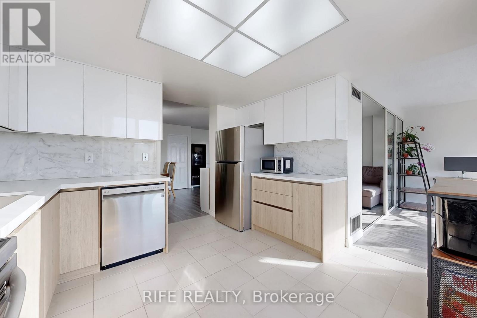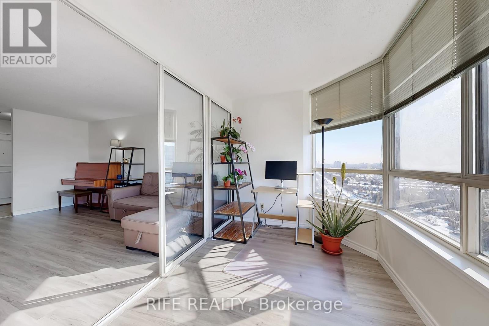 Bright & Spacious Corner Unit Approx. 1,300 Sq. Ft. Newly renovated with laminate flooring throughout. This sun-filled suite offers 2 large bedrooms, 2 full bathrooms, plus a fully enclosed den with door and window, featuring breathtaking, unobstructed views-easily convertible into a third bedroom, home office, or guest room. The primary bedroom includes a private ensuite, walk-in closet, and elegant bay window. Large windows provide exceptional natural light with no buildings blocking the view, and on clear days, even a glimpse of Toronto's downtown skyline. Separate laundry room with large storage area. Exceptionally well-maintained building with condo fees including water, heat, A/C, hydro, and cable TV. Unbeatable location with a supermarket and a variety of restaurants right downstairs; banks within a 5-minute walk, and quick access to Highways 401 and 404 within a 10-minute drive. Exceptionally well-maintained building with condo fees including water, and cable TV. (id:4555)